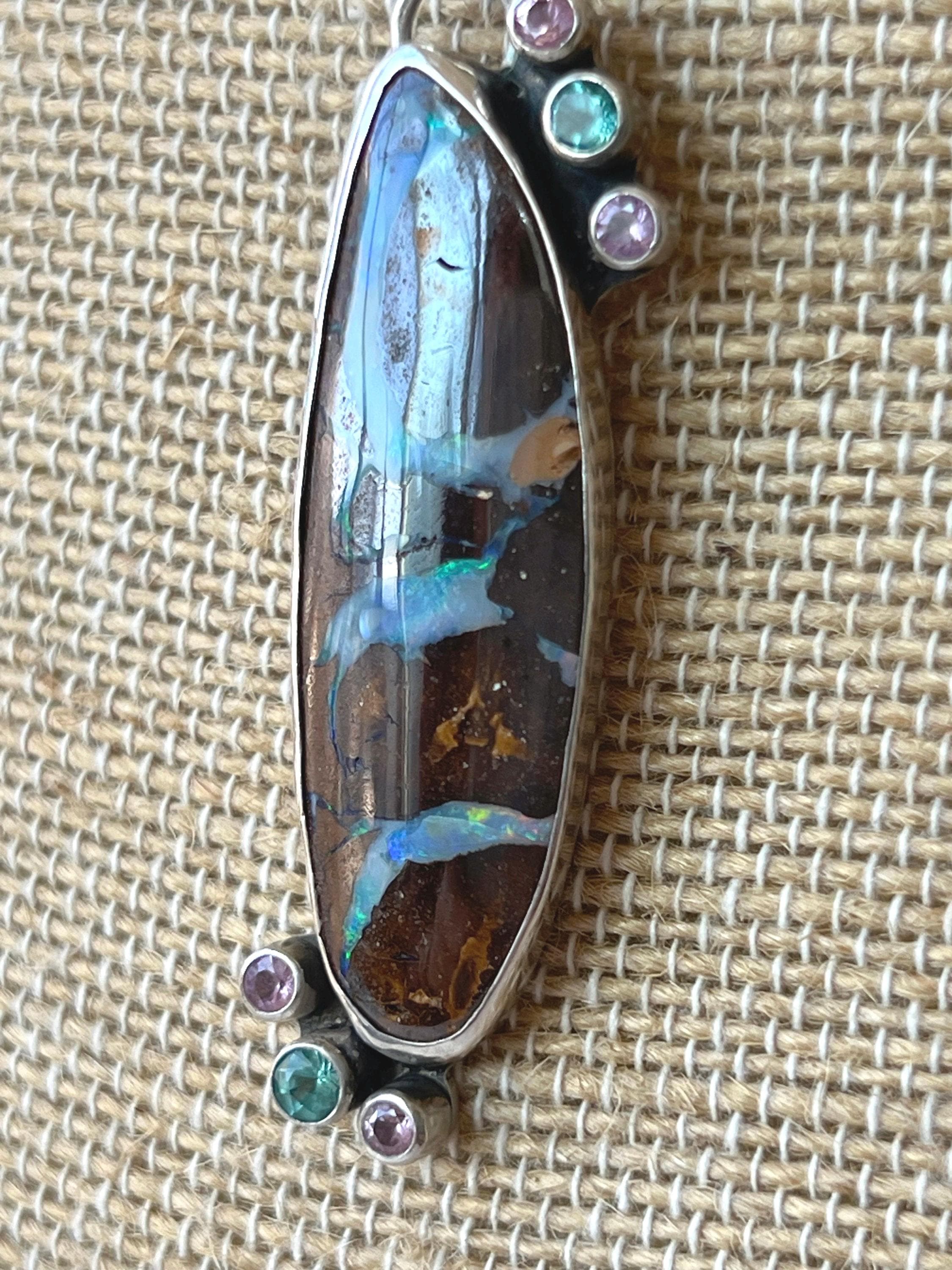 This Australian Boulder Opal is beautifully patterned with blue, green and pink running through it. The 2.5mm pink sapphires and 3mm apatites complement it perfectly. All set in sterling silver, including the textured bail. The opal measures approximately 45 x 15mm. Overall the piece is 70 x 15mm, including the bail. The sterling silver chain is 24”, with a lobster claw clasp. Or you can add your own chain.