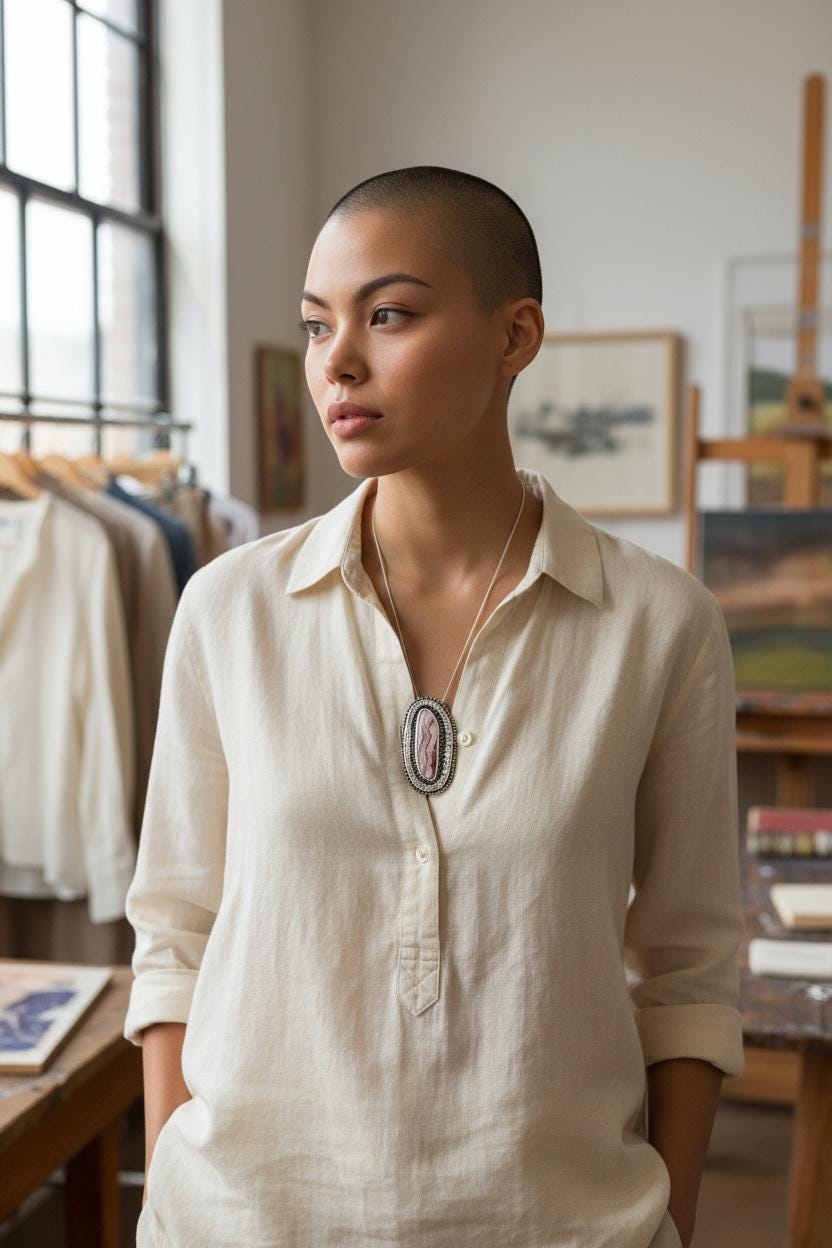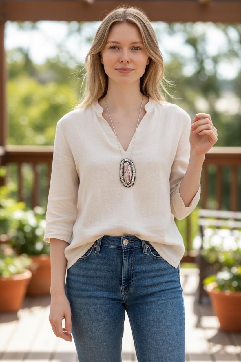 32 x 10 mm free form rhodochrosite with vertical creamy waves of pink and white. wrapped in a string of creamy white fresh water pearls. Set in sterling silver with a beaded frame. the silver chain is held by a loop in the back. Comes with a 24” silver chain or you can add your own.