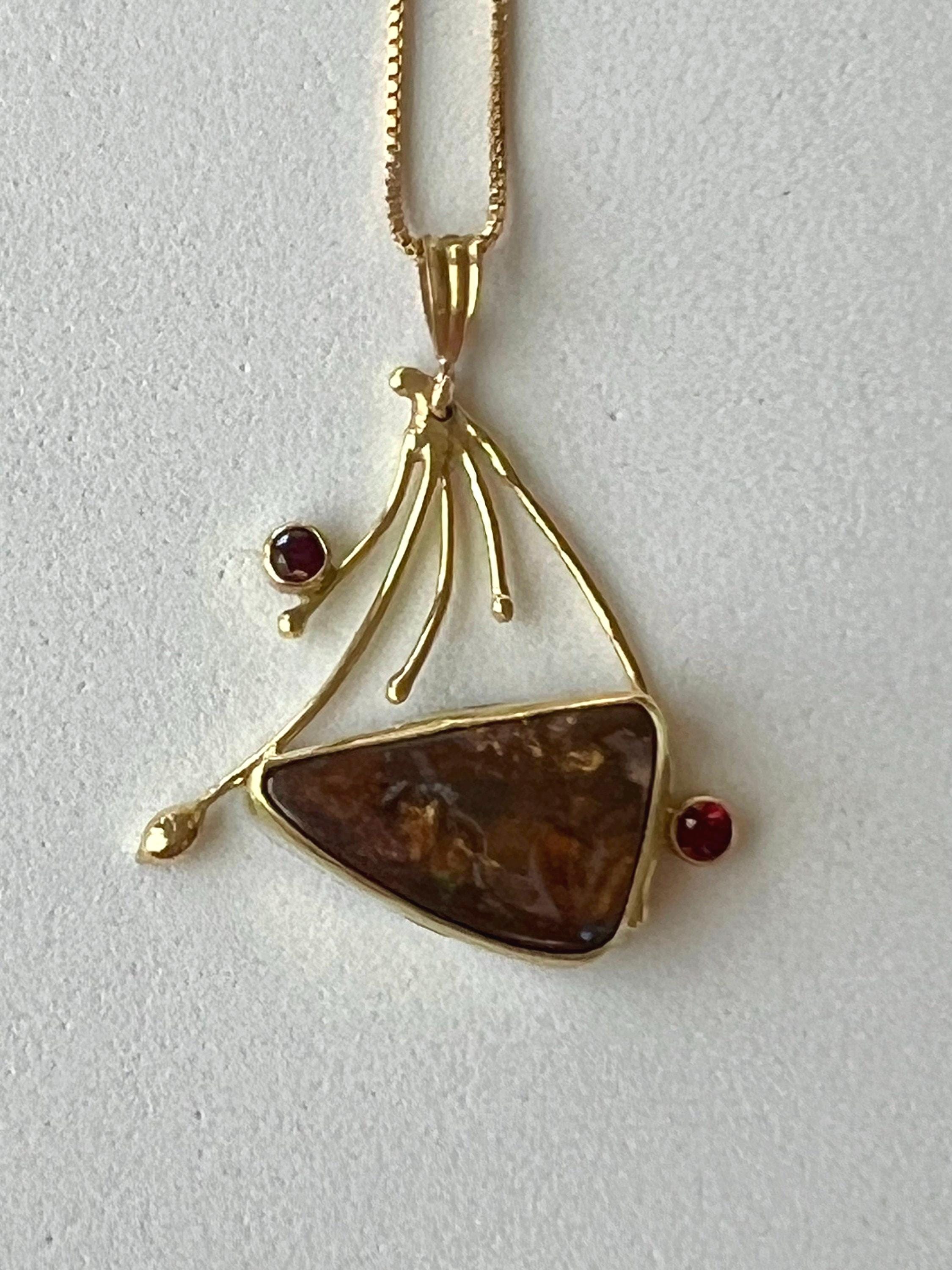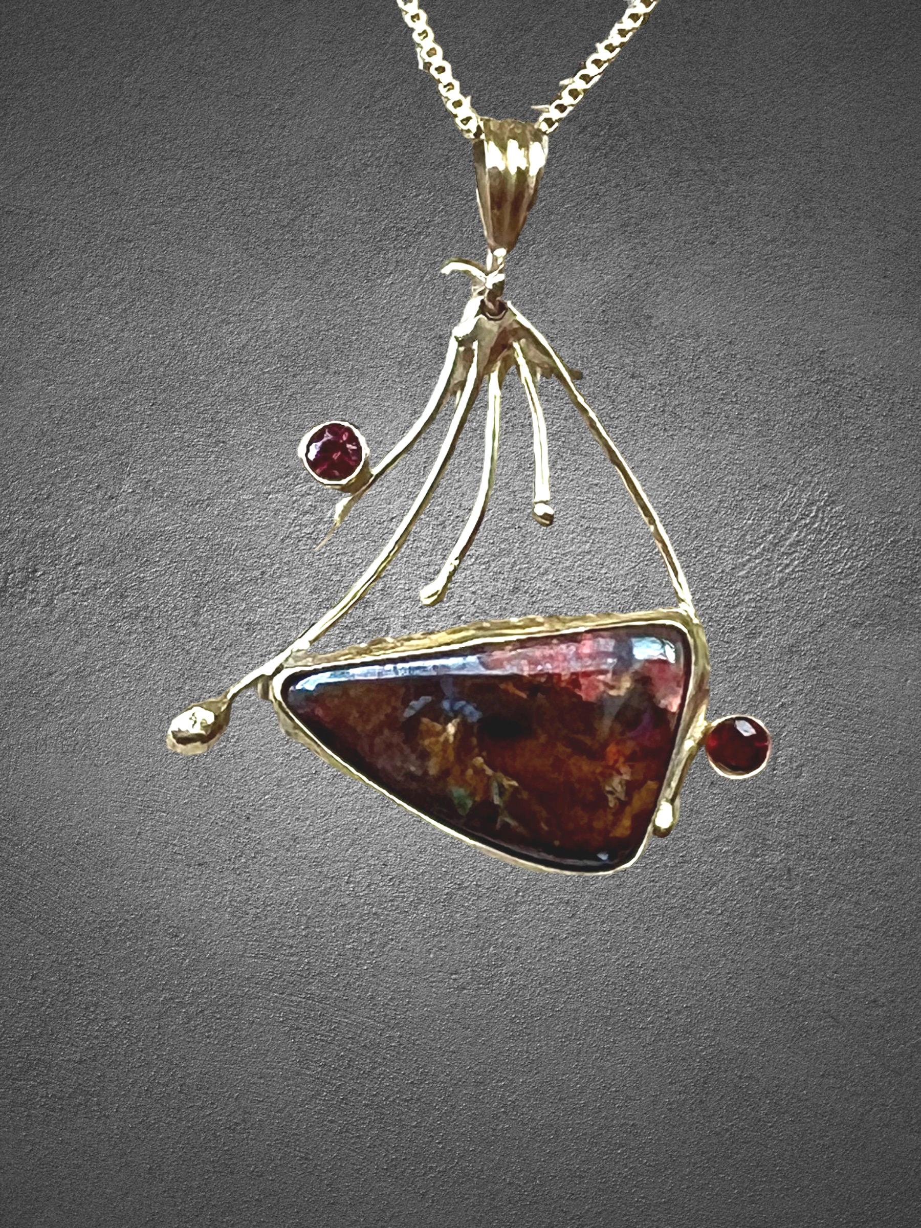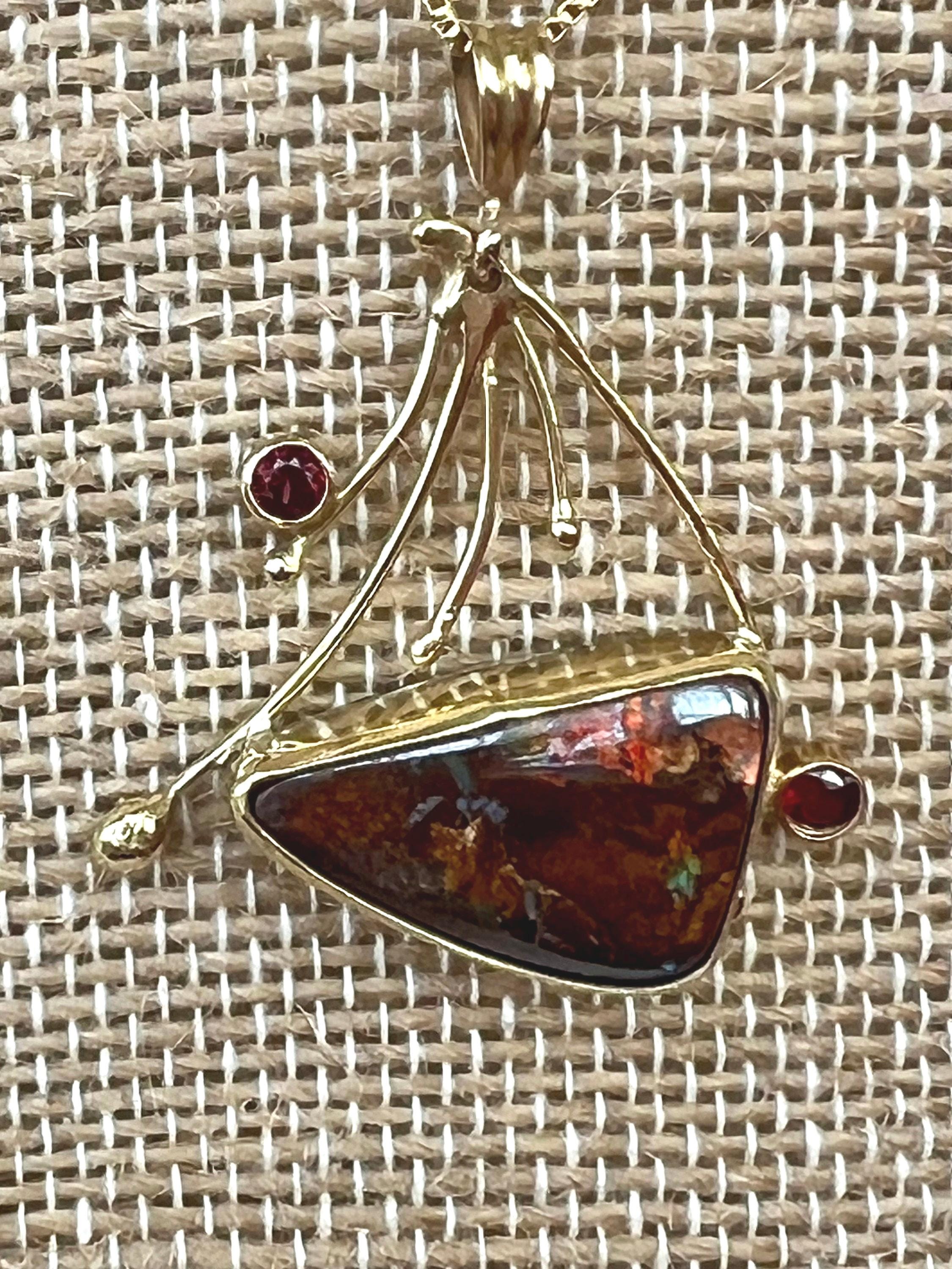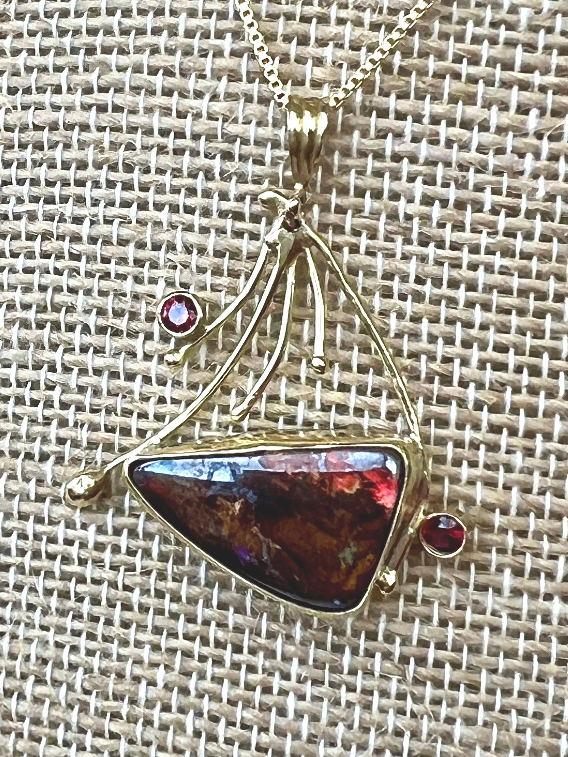 I would call this a semi fan shape. The 18k yellow gold really makes the opal and spinel stand out. This solid opal has extreme red flash with a hint of green, depending on how you move it. The 2.5mm red spinels enhance the red flash. All set in 18k gold except the back and it’s sterling silver. The chain is 17” and 14k gold filled.