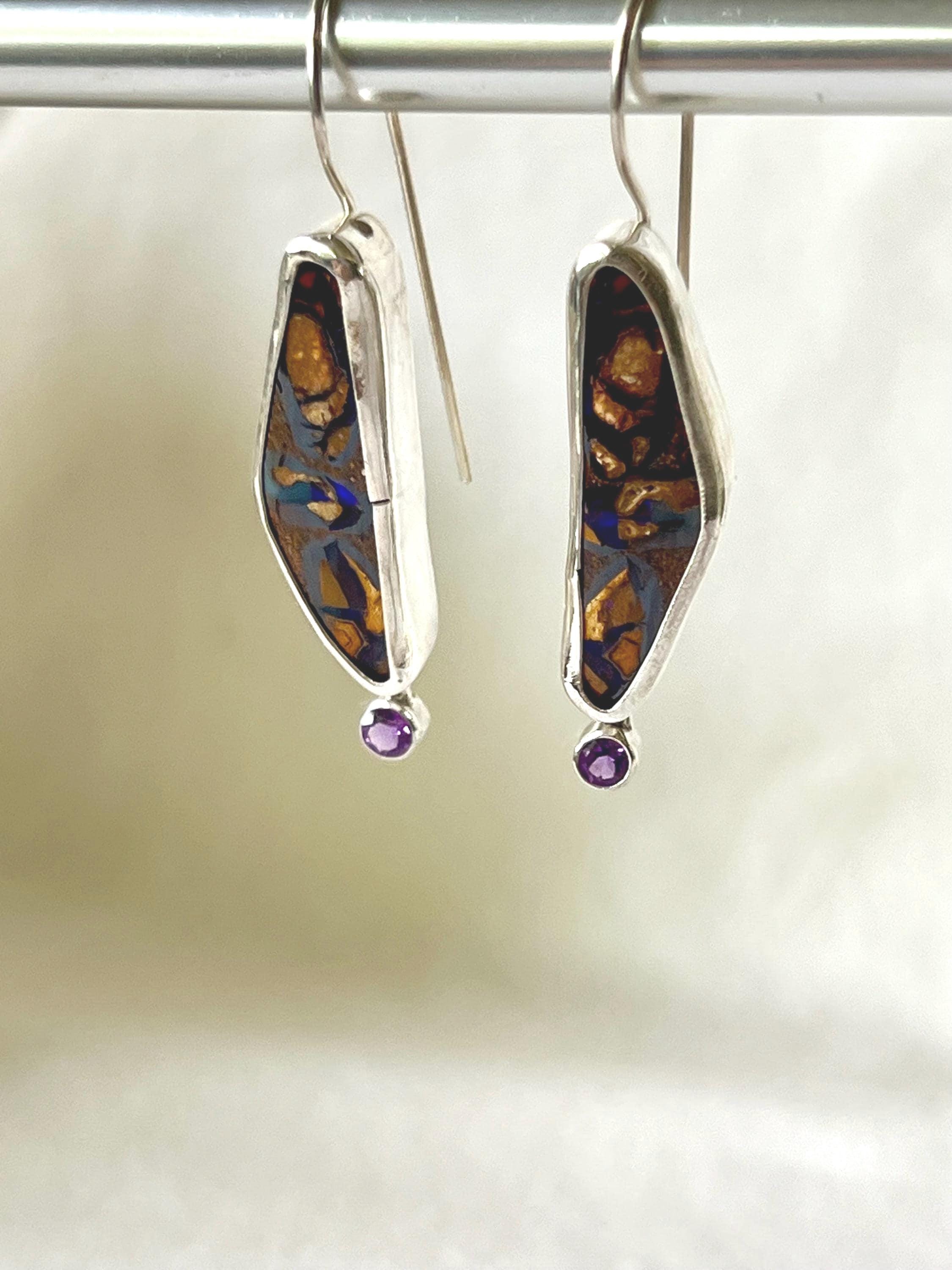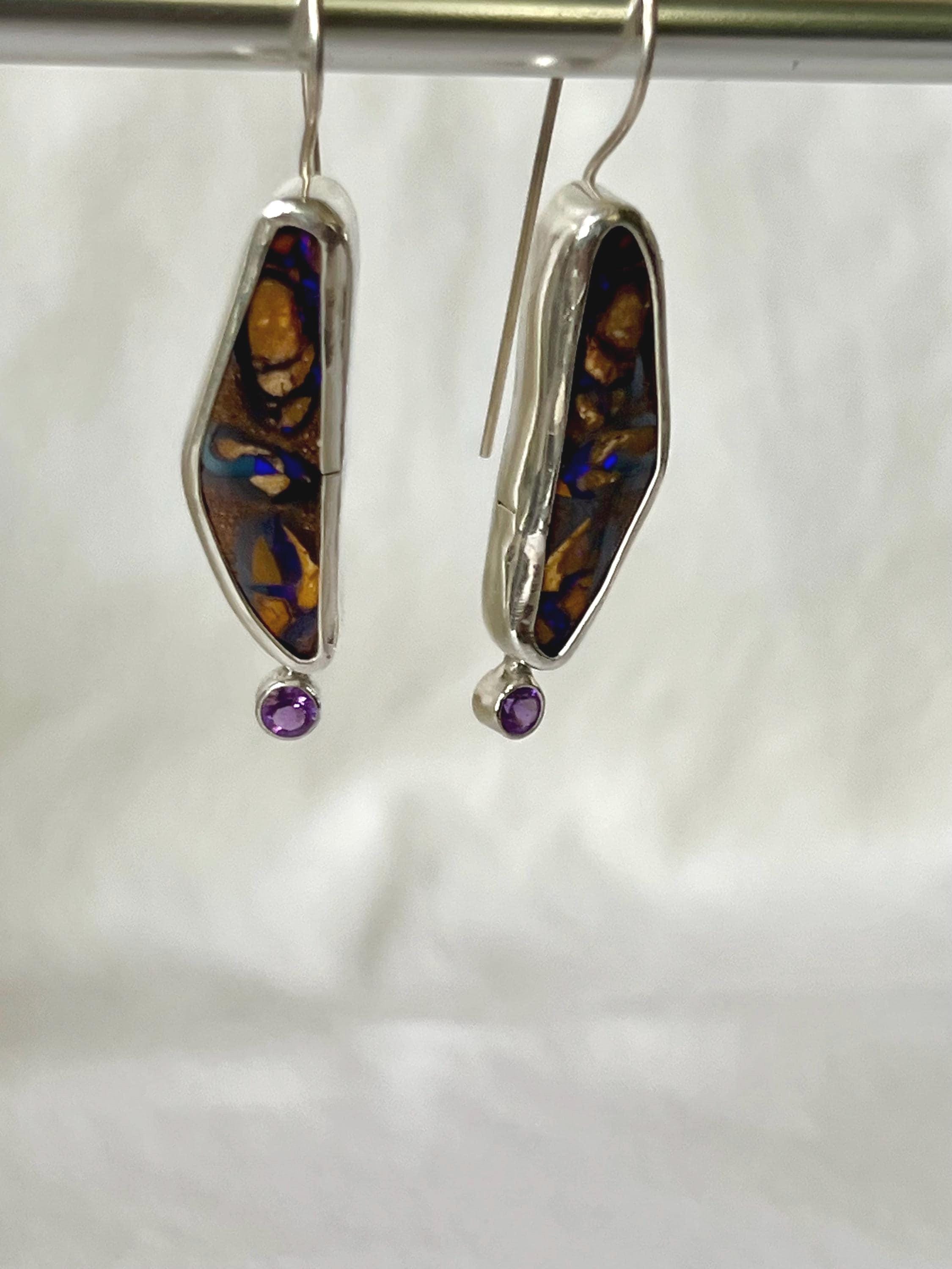 Presenting a pair of earrings characterized by their elongated, asymmetrical shapes that embrace natural irregularity with refined simplicity. At the core of each piece lies a polished Australian boulder opal, its deep, glossy surface revealing a complex pattern of warm browns and golds subtly interwoven with flashes of blue. This interplay of earth-toned warmth and cool hints creates a captivating focal point, balanced delicately within smooth sterling silver bezels that follow the contours of the stones without overpowering them.