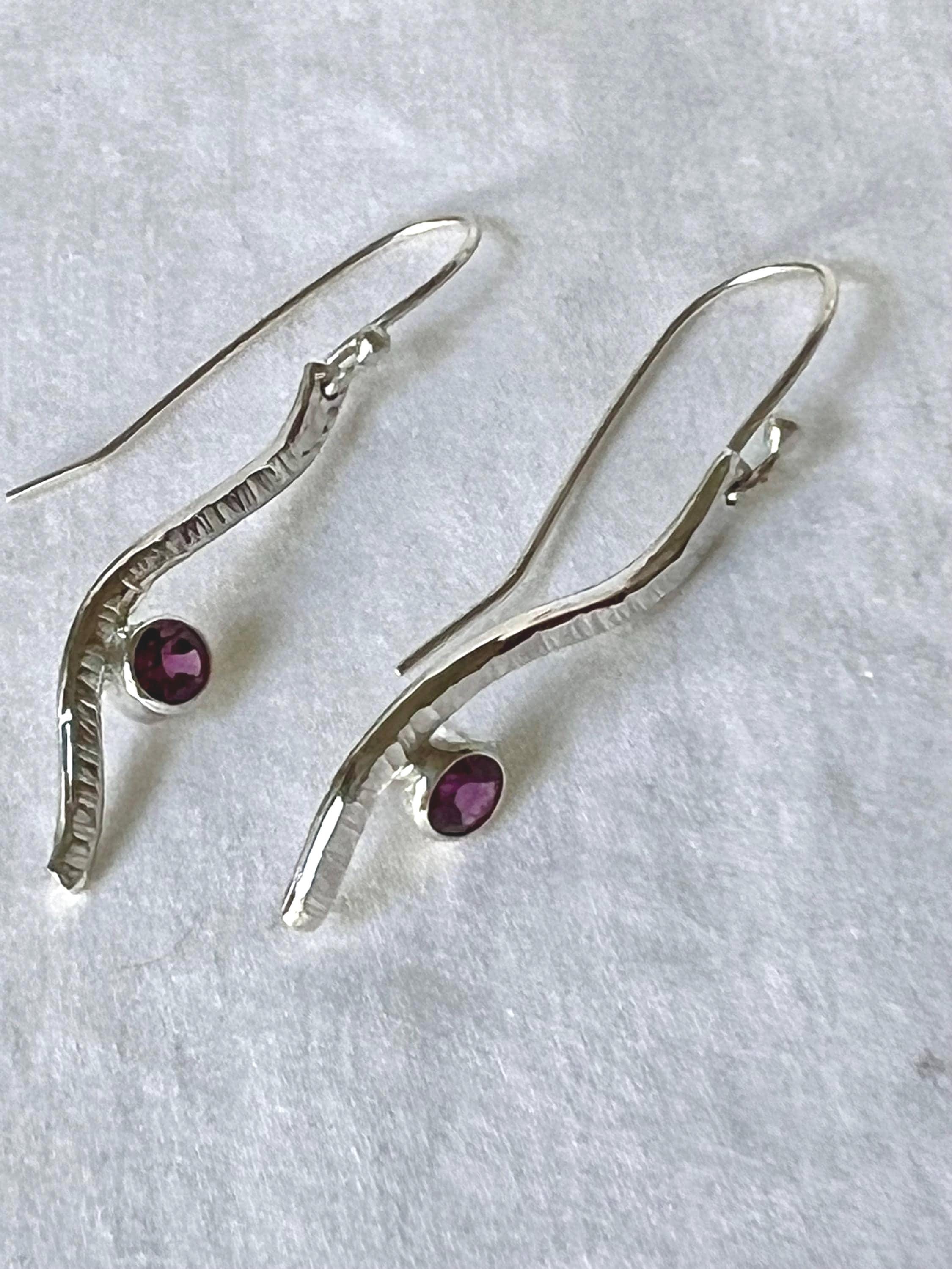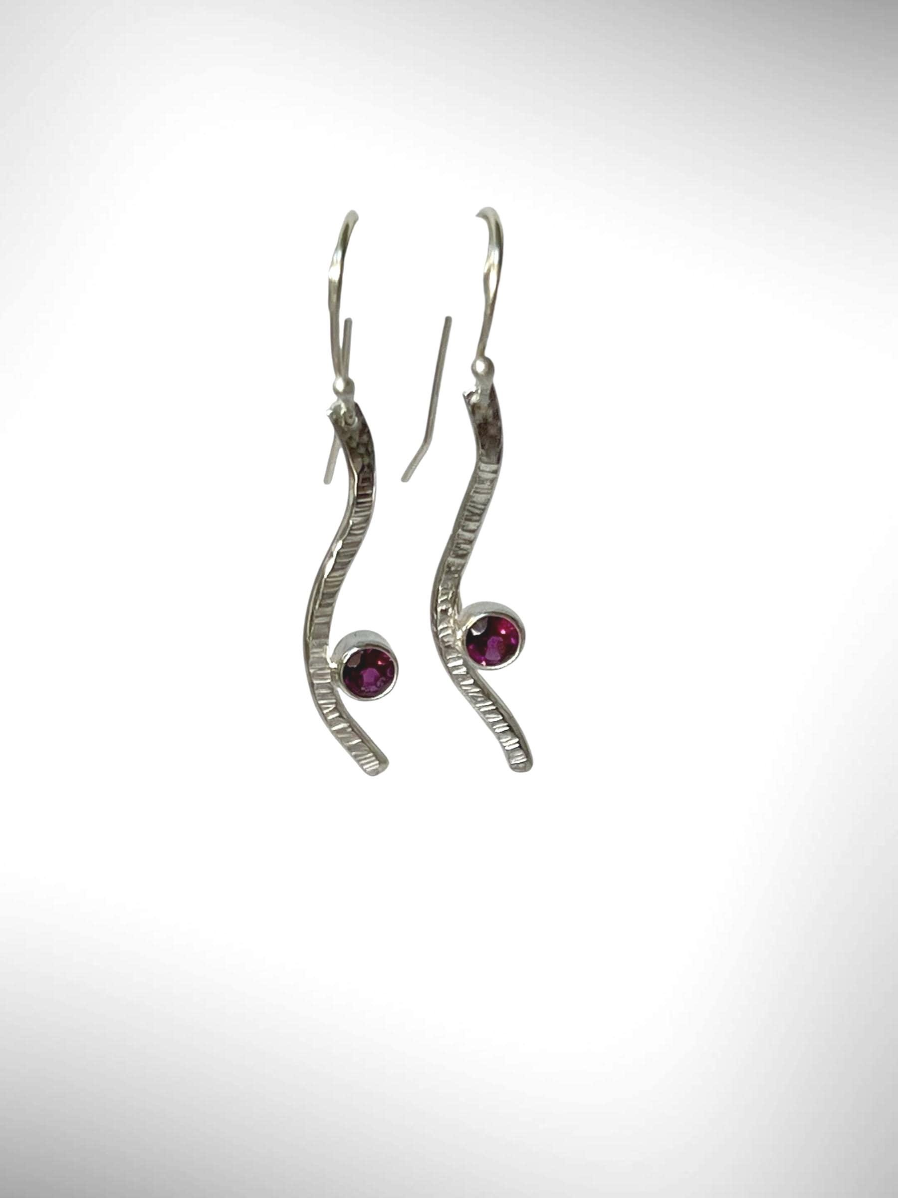I’m pleased to present my latest work, Sculpted Ripples and Royal Glow, a pair of earrings that explore form, texture, and contrast in a refined and modern expression. Crafted from sterling silver, each earring features an elongated, wavy shape with a finely textured surface that adds depth and tactile interest. Near the lower curve, I’ve set a round rhodolite garnet whose rich, deep pink color stands out vividly against the silver. The design balances simplicity and sophistication, with clean lines and hooks that ensure comfort and ease of wear. Throughout the process, I focused on how the textured metal interacts with light and how the gemstone’s color complements the movement suggested by the curves. This piece reflects my continued interest in marrying organic shapes with precise craftsmanship to create jewelry that feels both elegant and intentional.