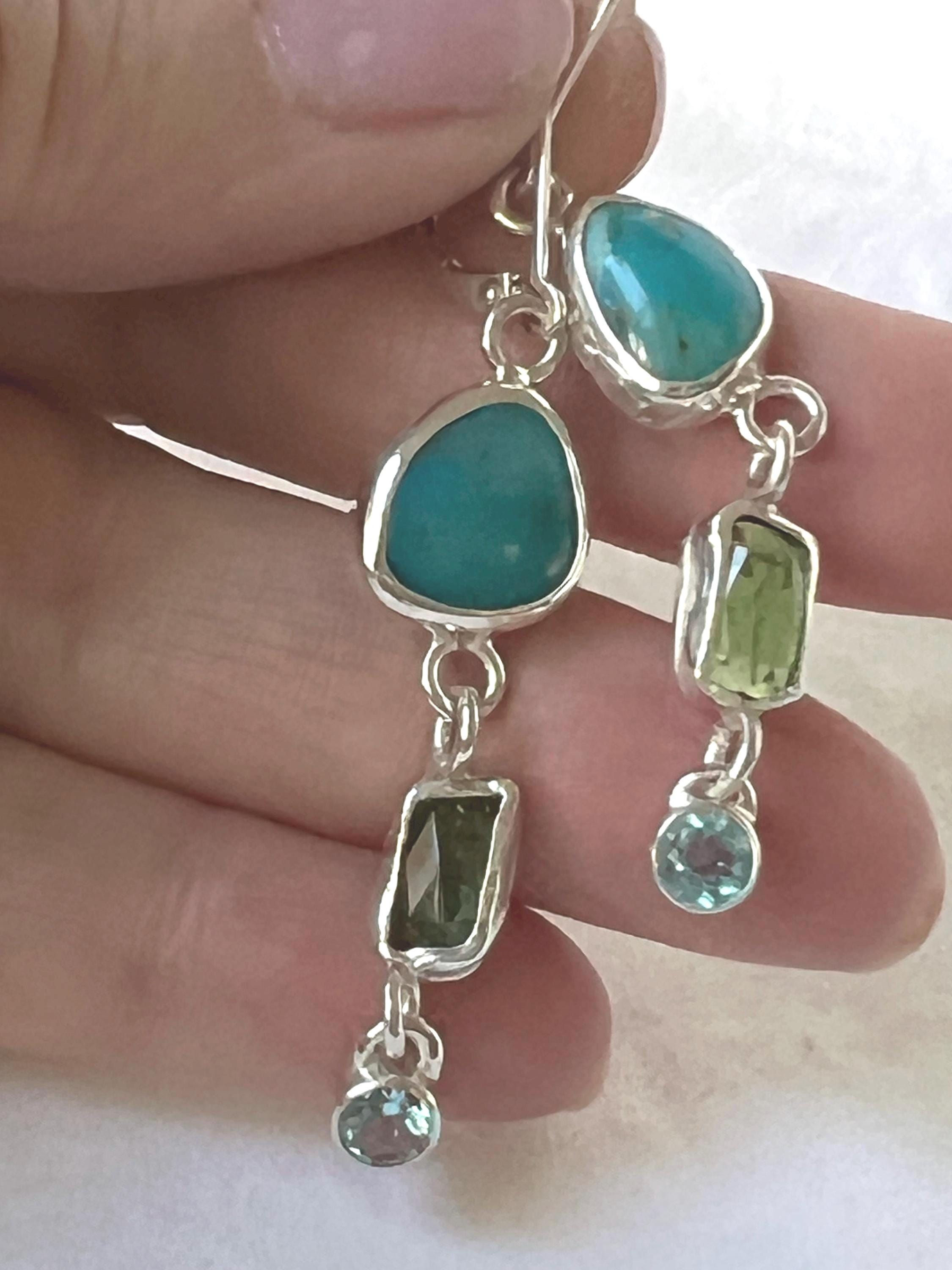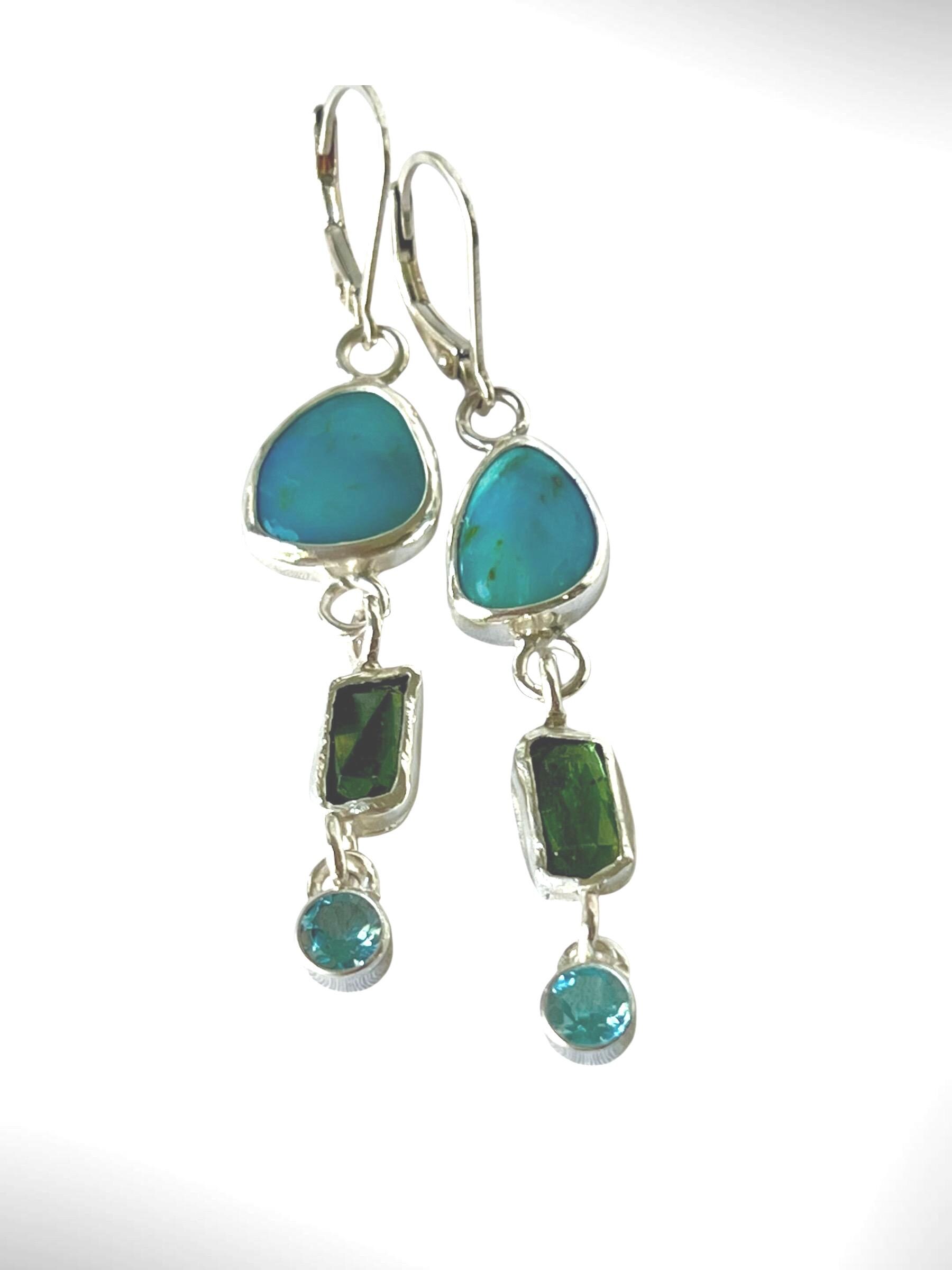 I’m pleased to introduce my new earrings, Geometric Cascade in Ocean Hues. This design features a thoughtful combination of Peruvian opal, tourmaline, and blue zircon, all set in sterling silver. Each earring consists of three carefully chosen stones: an irregular turquoise opal at the top framed by a simple silver bezel, followed by a rectangular green tourmaline that moves gently with wear, and finished with a small, round blue zircon that adds a subtle sparkle at the tip. The arrangement plays with contrasts between organic shapes and precise geometry, creating a balanced composition that highlights both color and form. Throughout the process, I focused on how these varied elements interact visually and physically, aiming for a design that feels both refined and dynamic. This piece reflects my ongoing exploration of blending natural textures with structured craftsmanship to create jewelry that invites closer observation and meaningful wear.