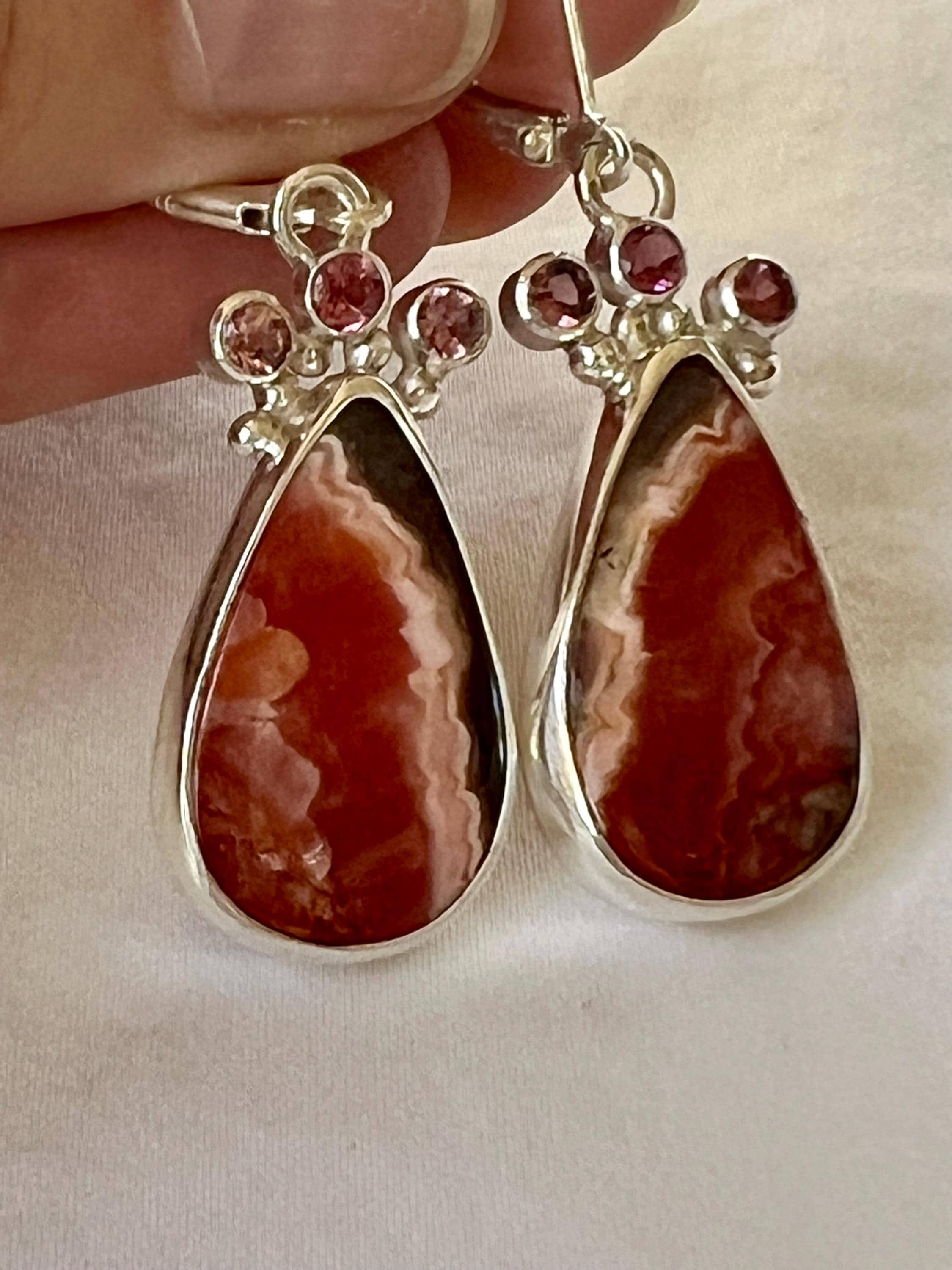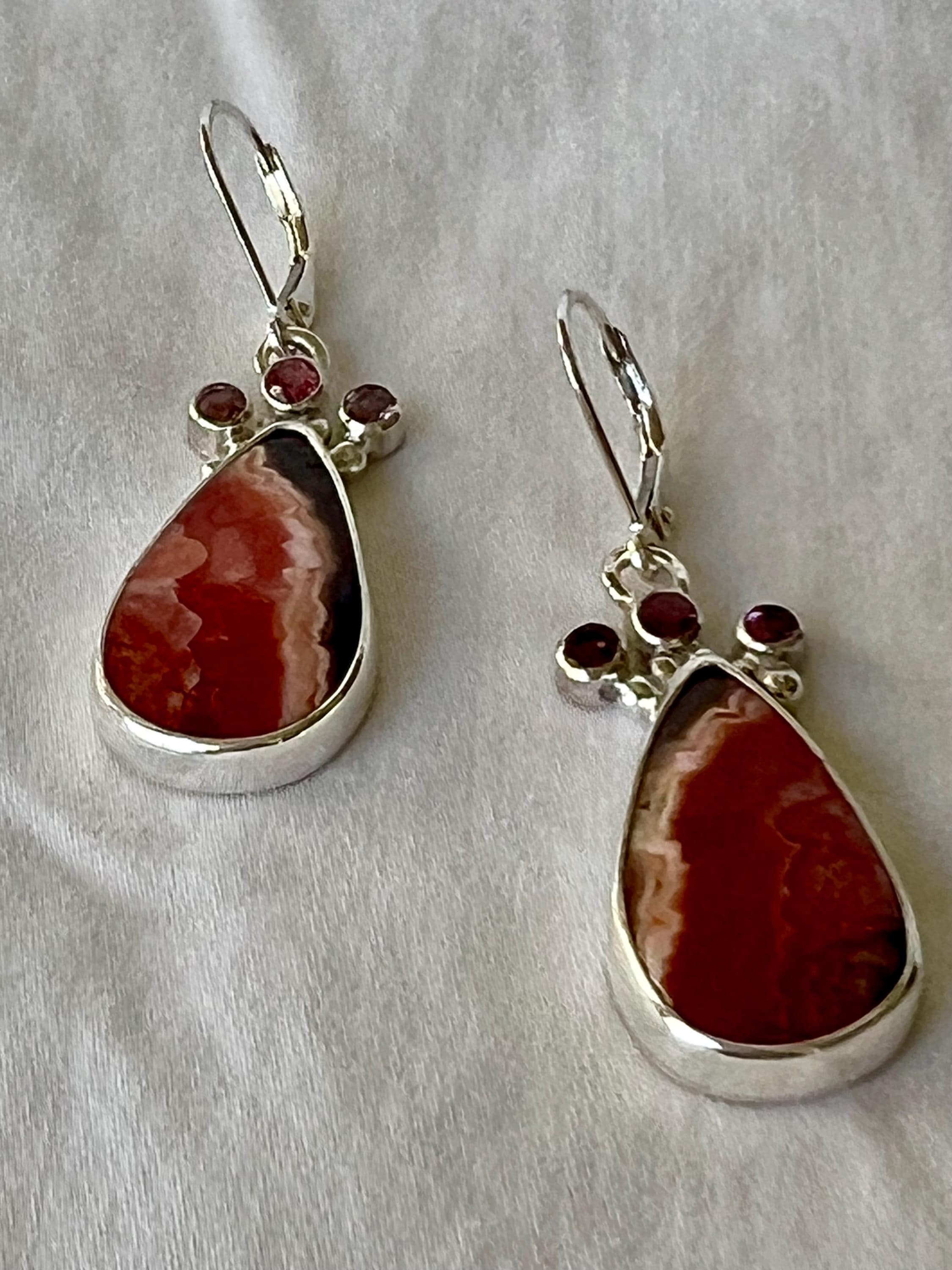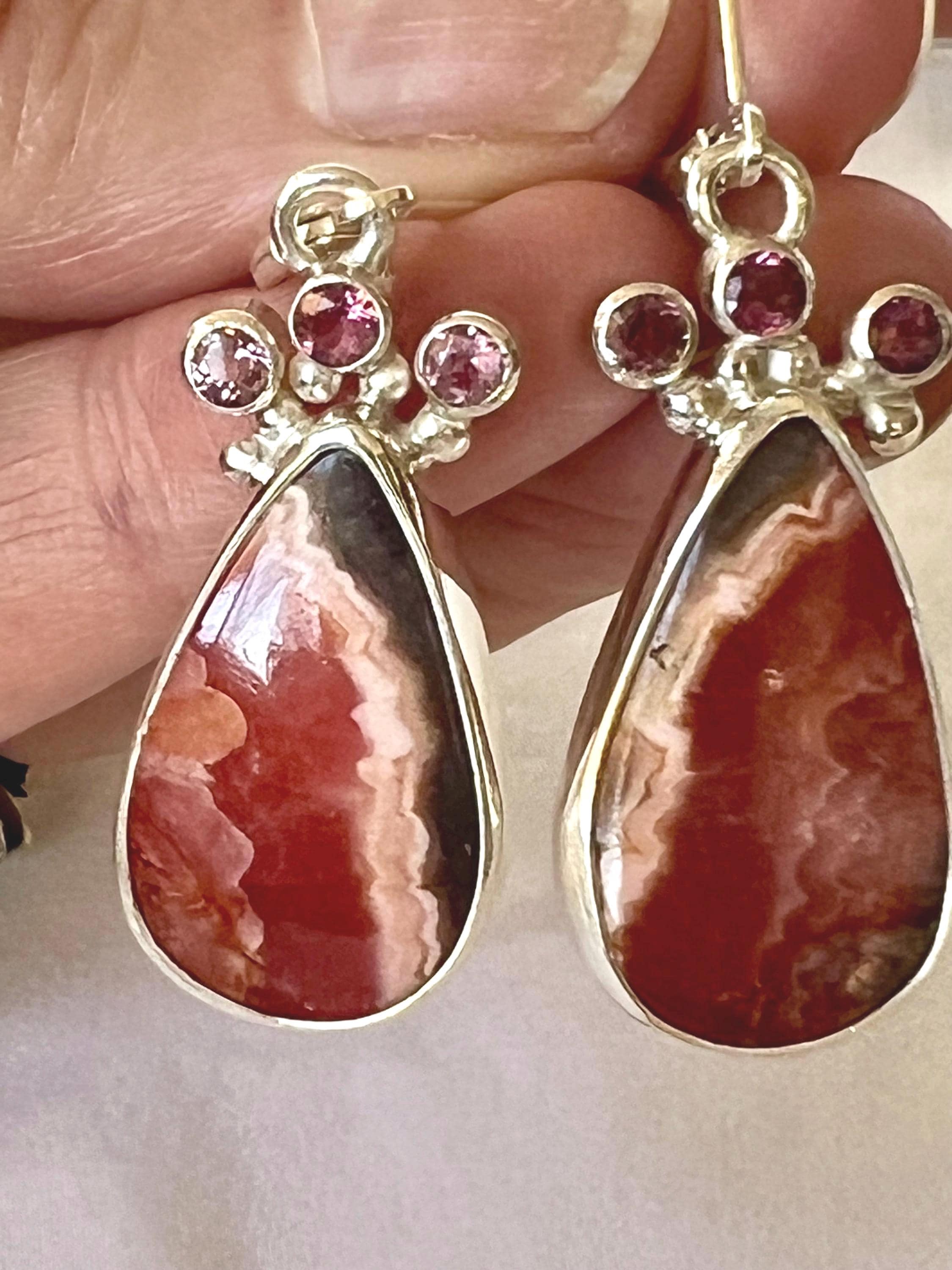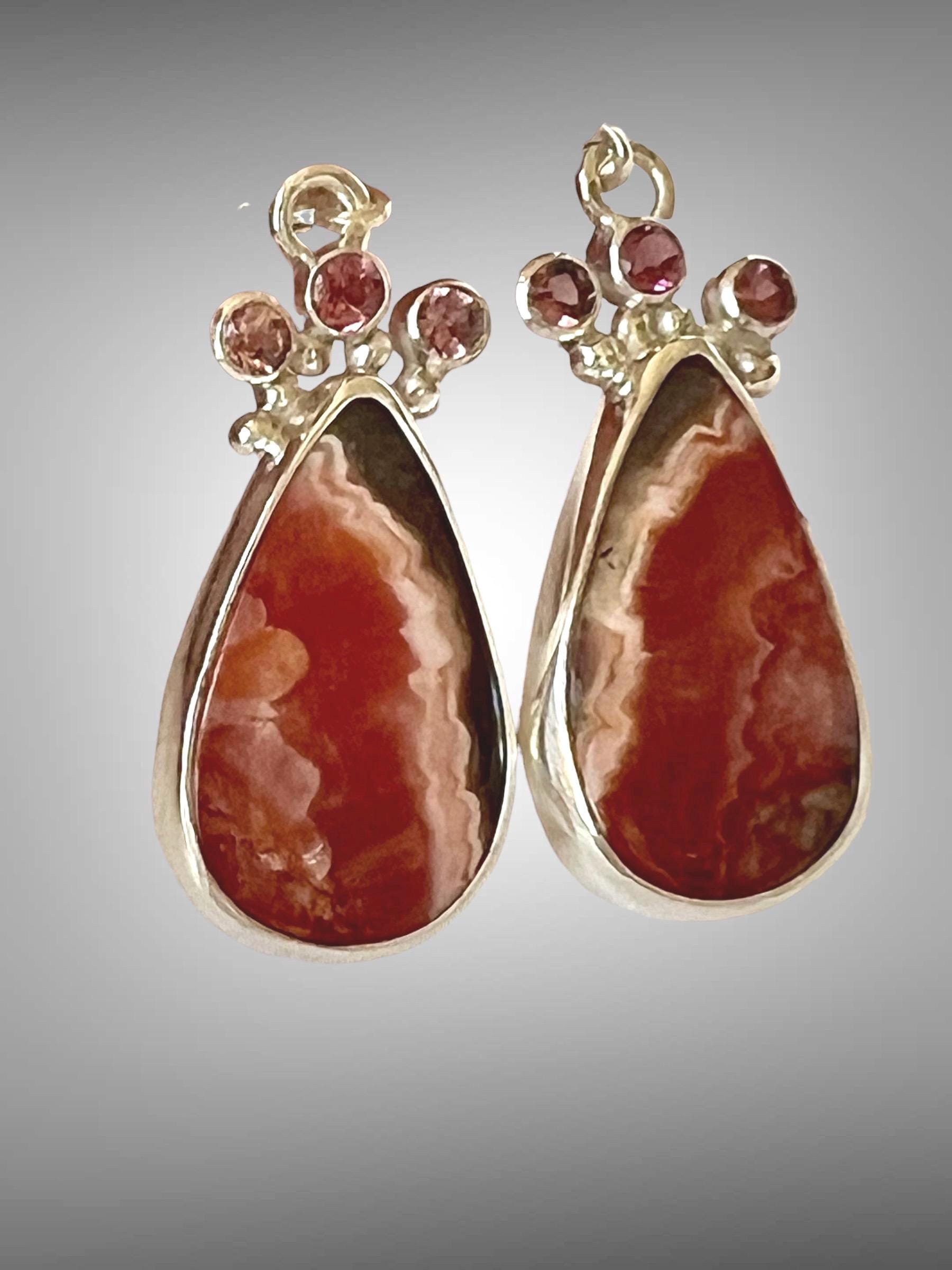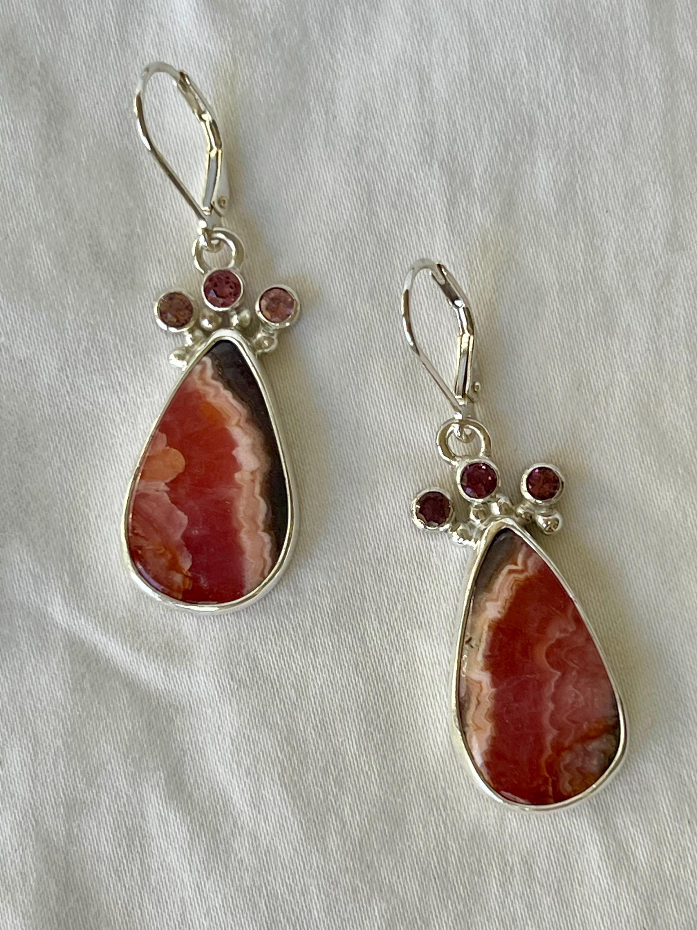 Beautifully patterned pink and brown, vertically striped rhodochrosite from Argentinia. These pear shaped stones are topped with 3 small faceted pink tourmaline on each earring. All are bezel set in sterling silver.