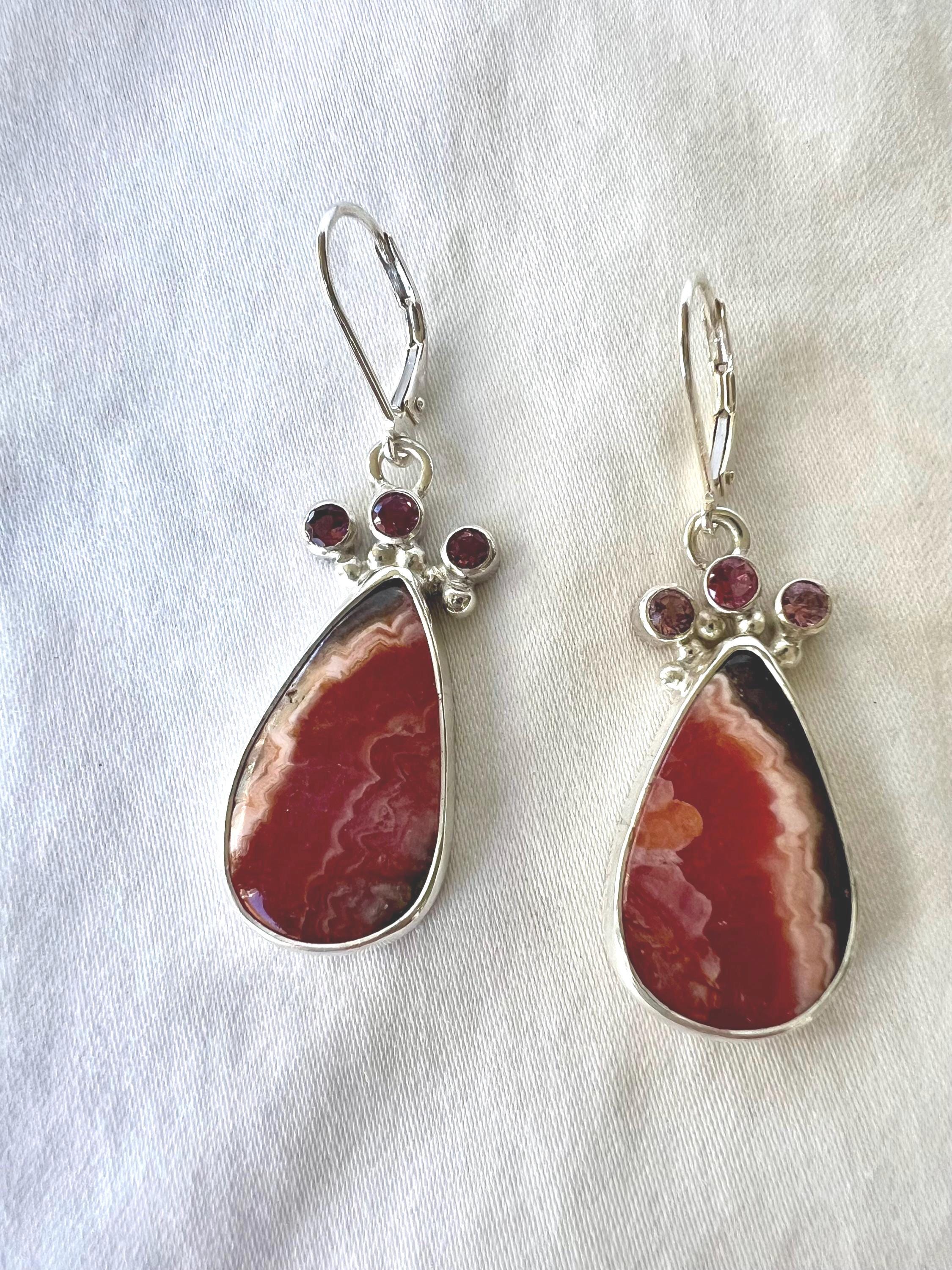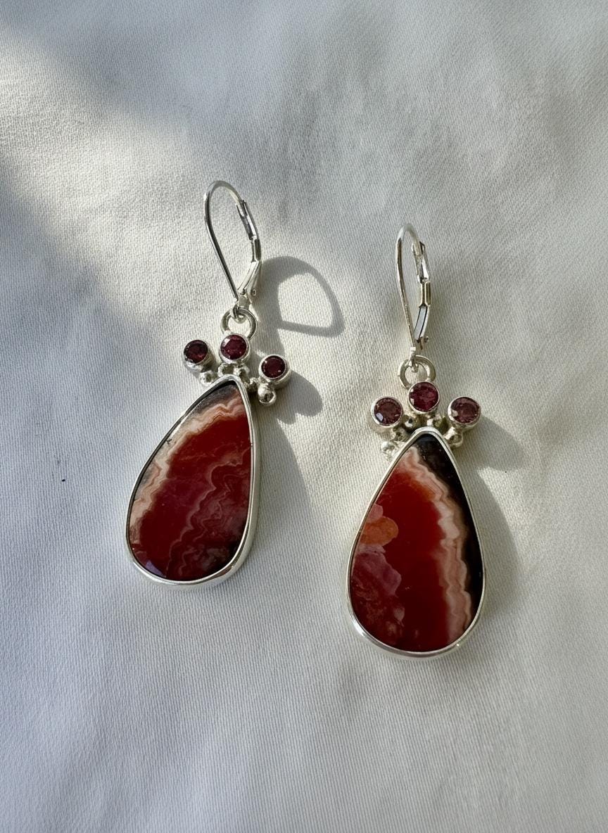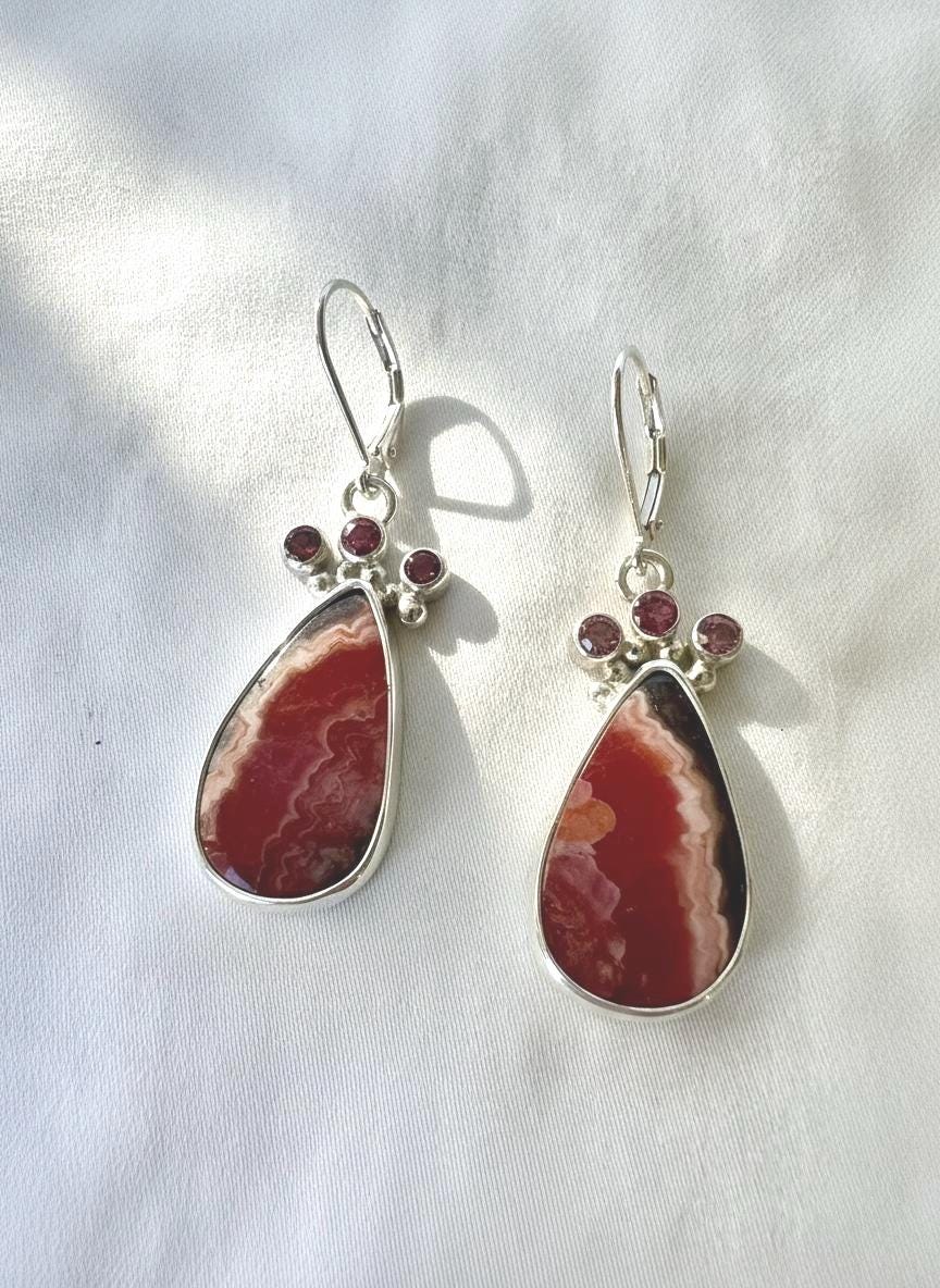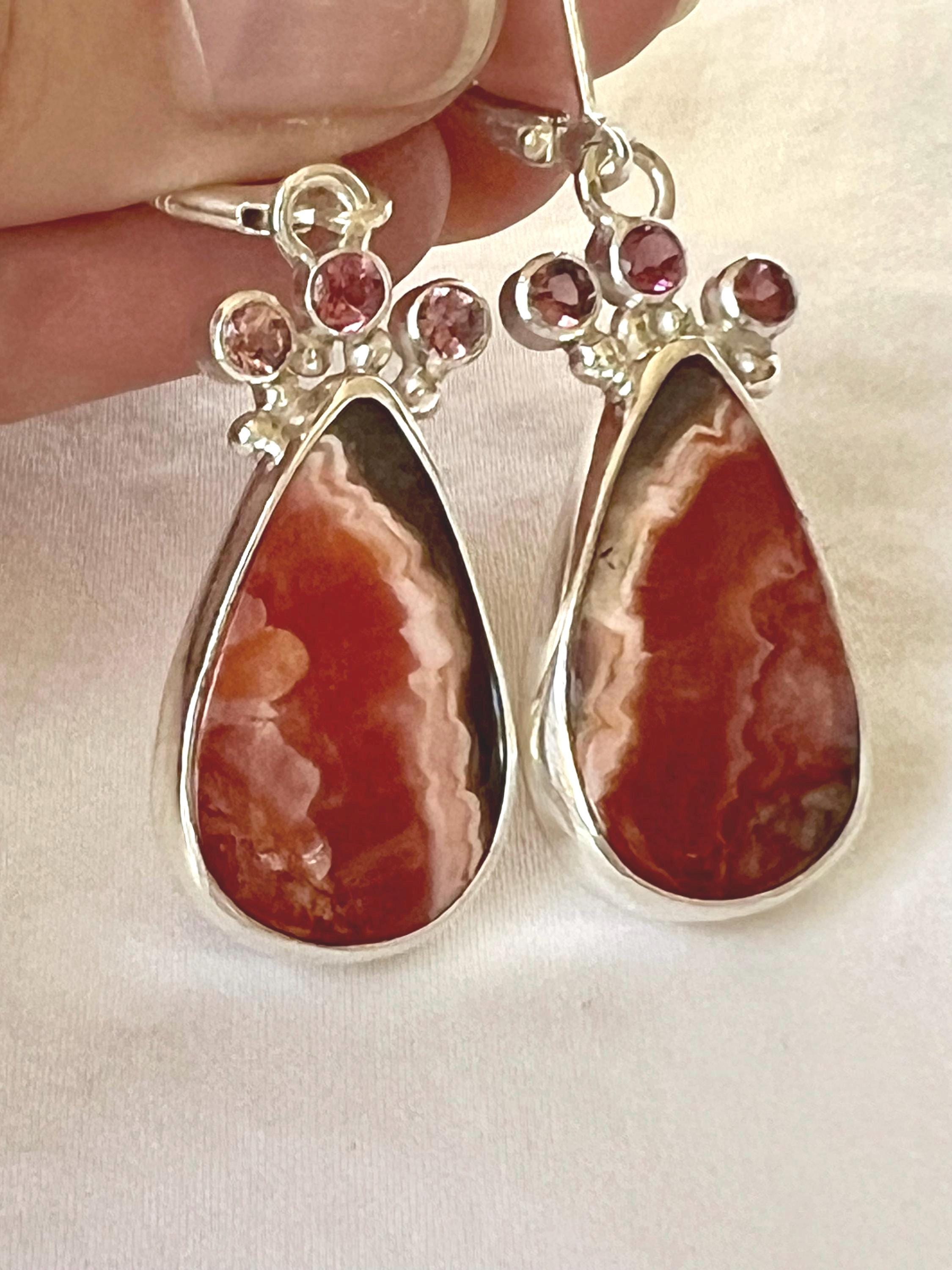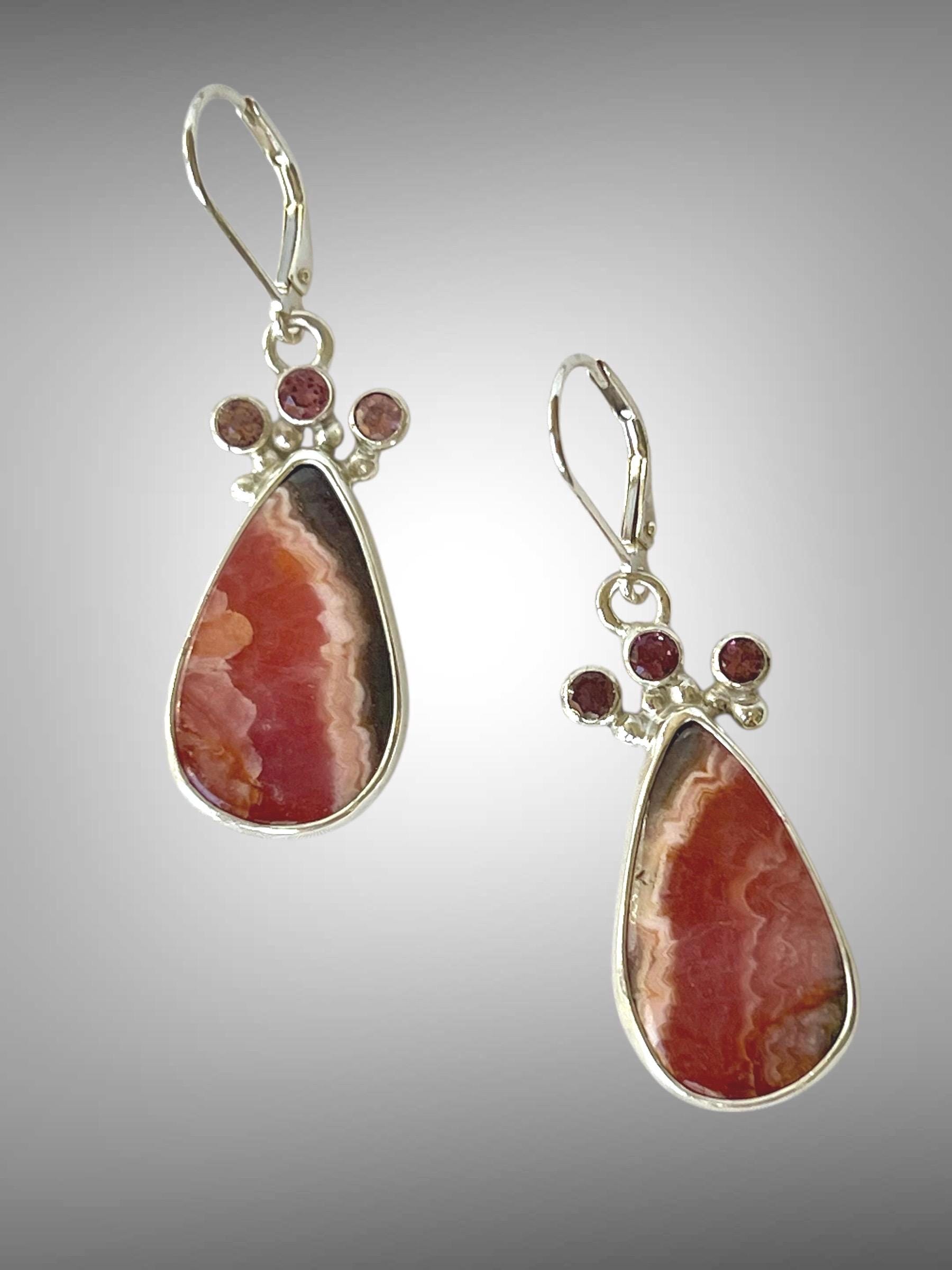 Beautifully patterned pink and brown, vertically striped rhodochrosite from Argentinia. These pear shaped stones are topped with 3 small faceted pink tourmaline on each earring. All are bezel set in sterling silver.