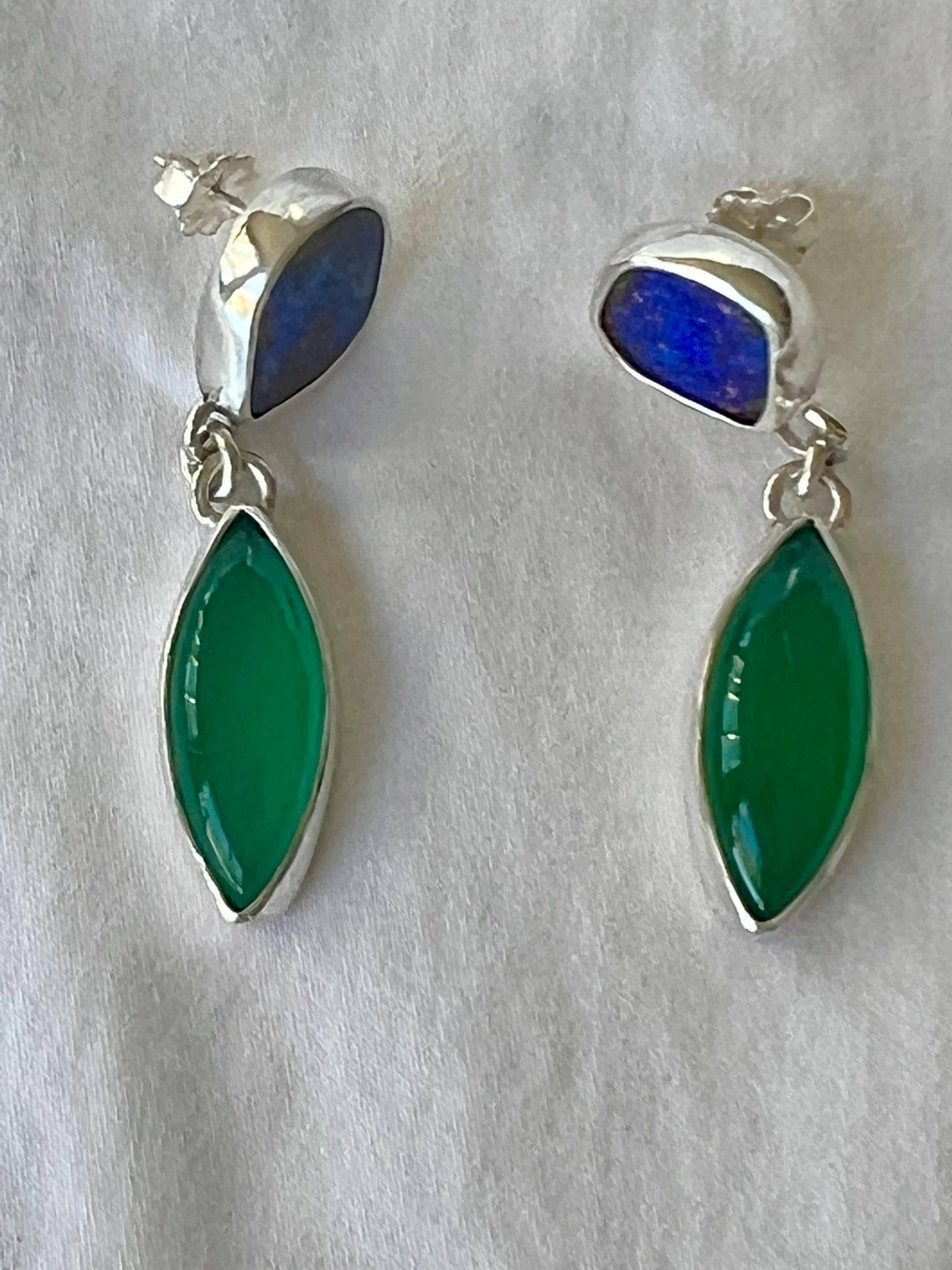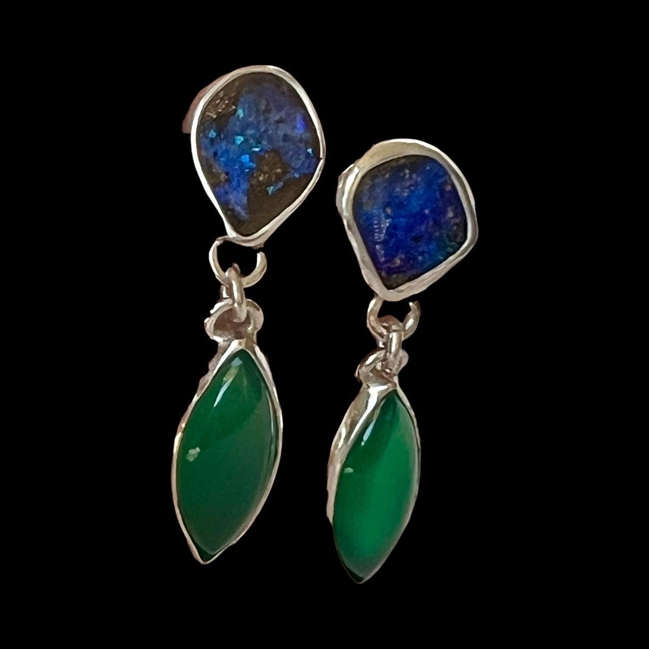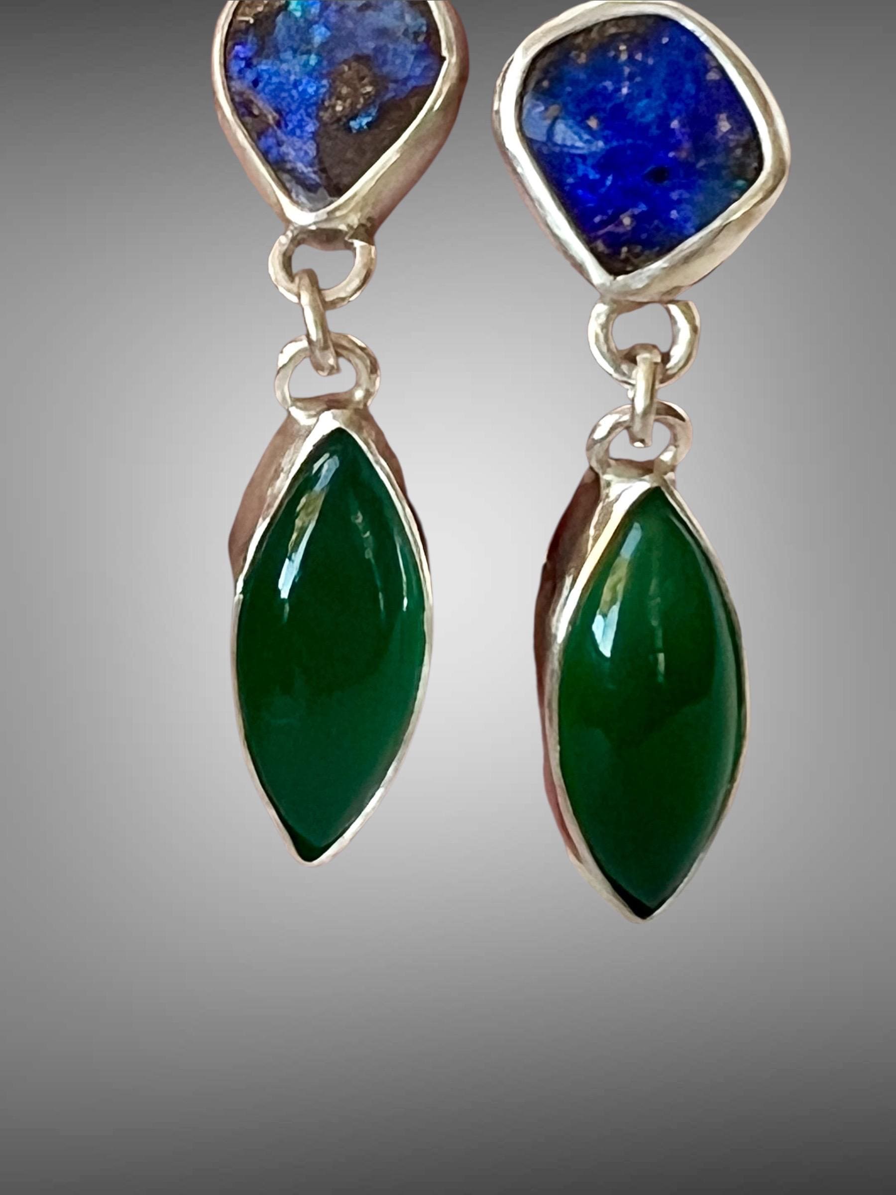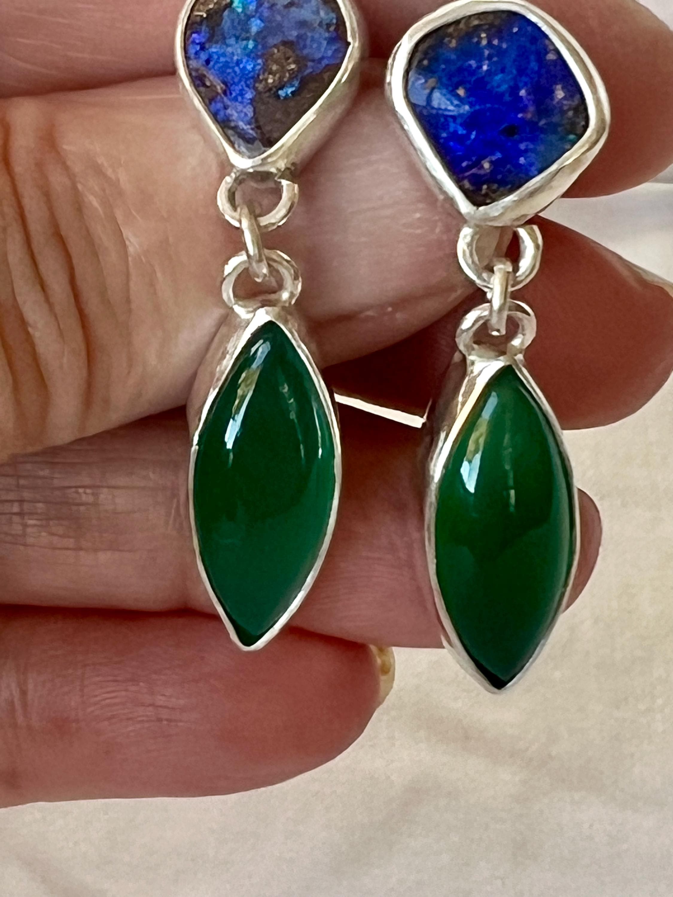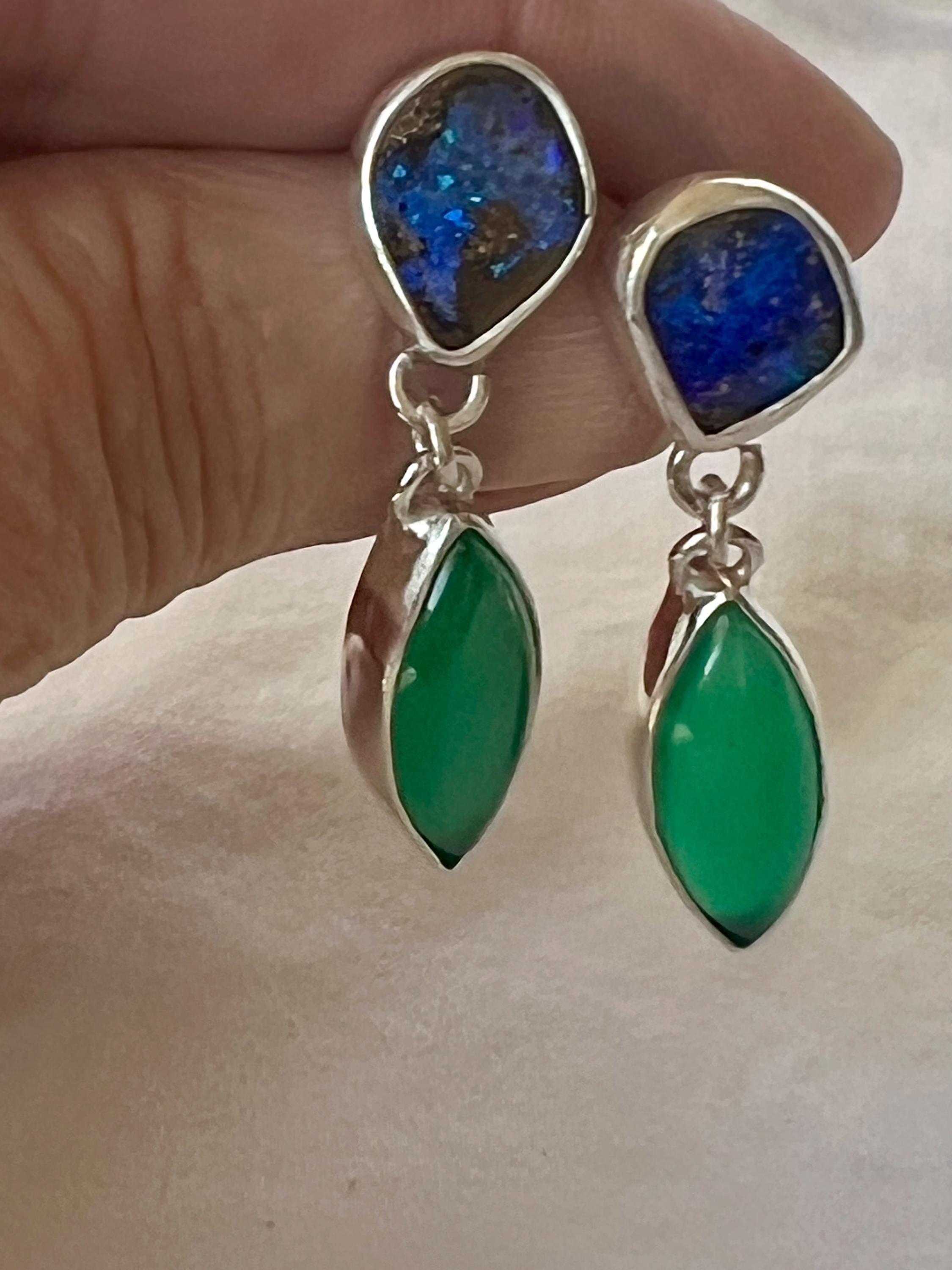 Nice blue Australian boulder opals set a top Marquis shaped green chalcedony. All are set in sterling silver with a push back post, also sterling silver.