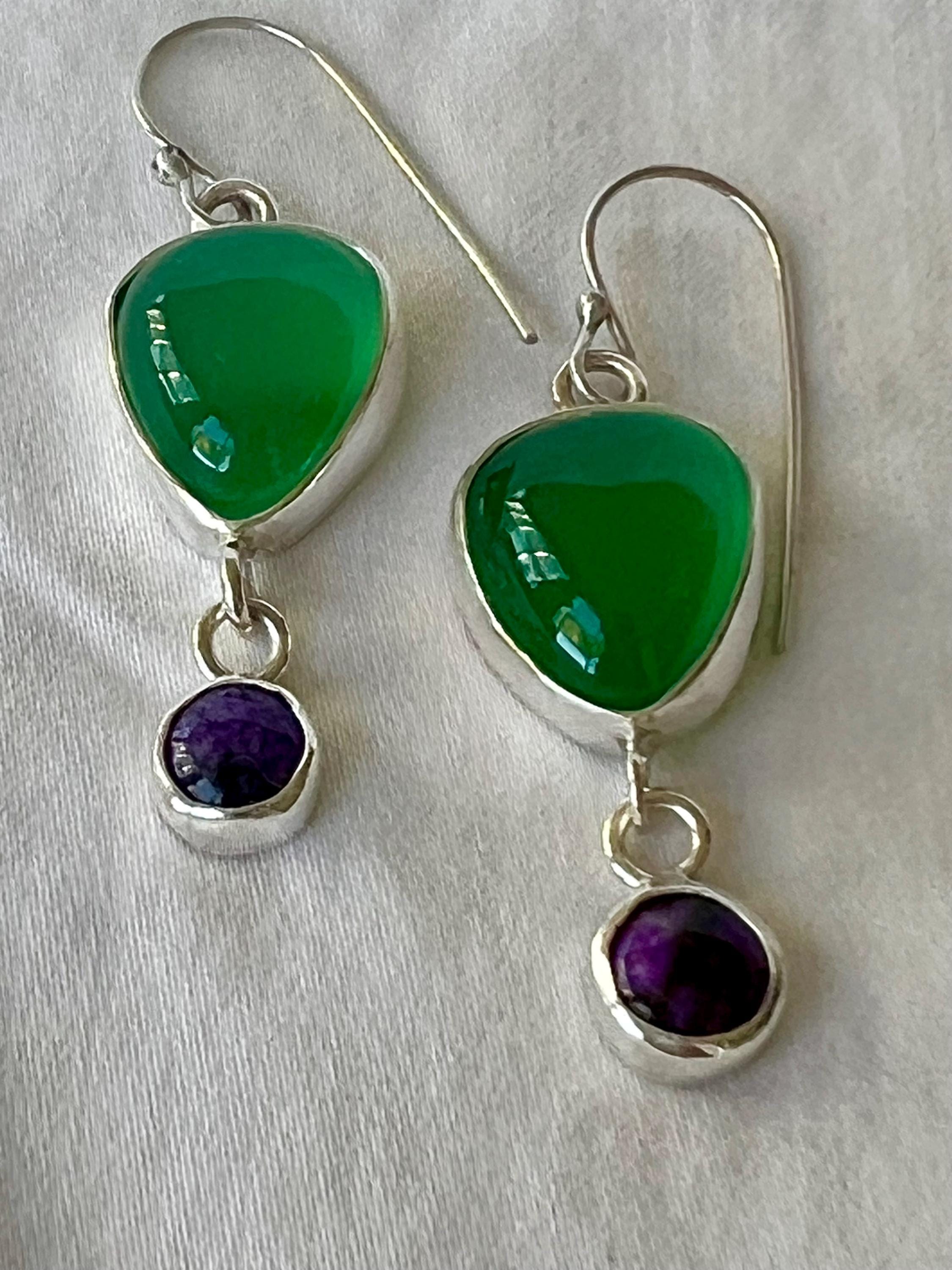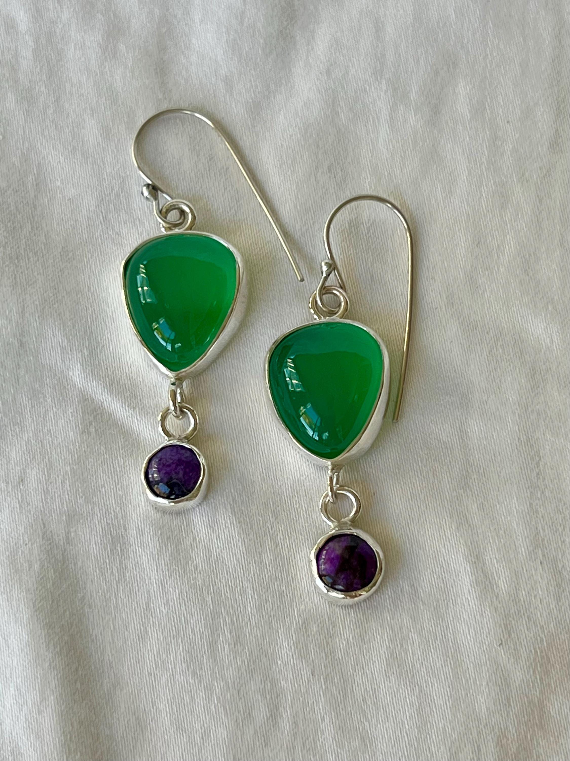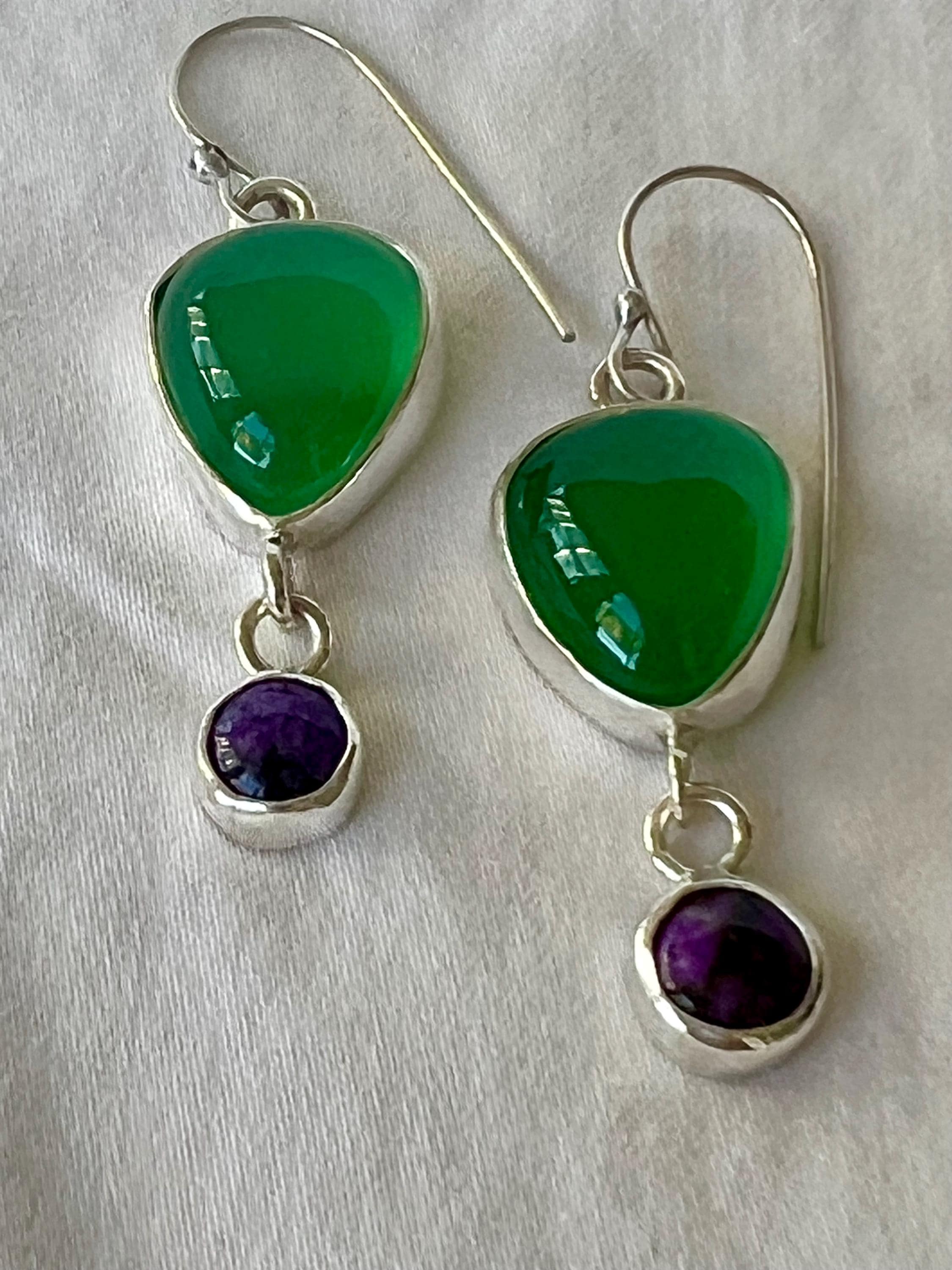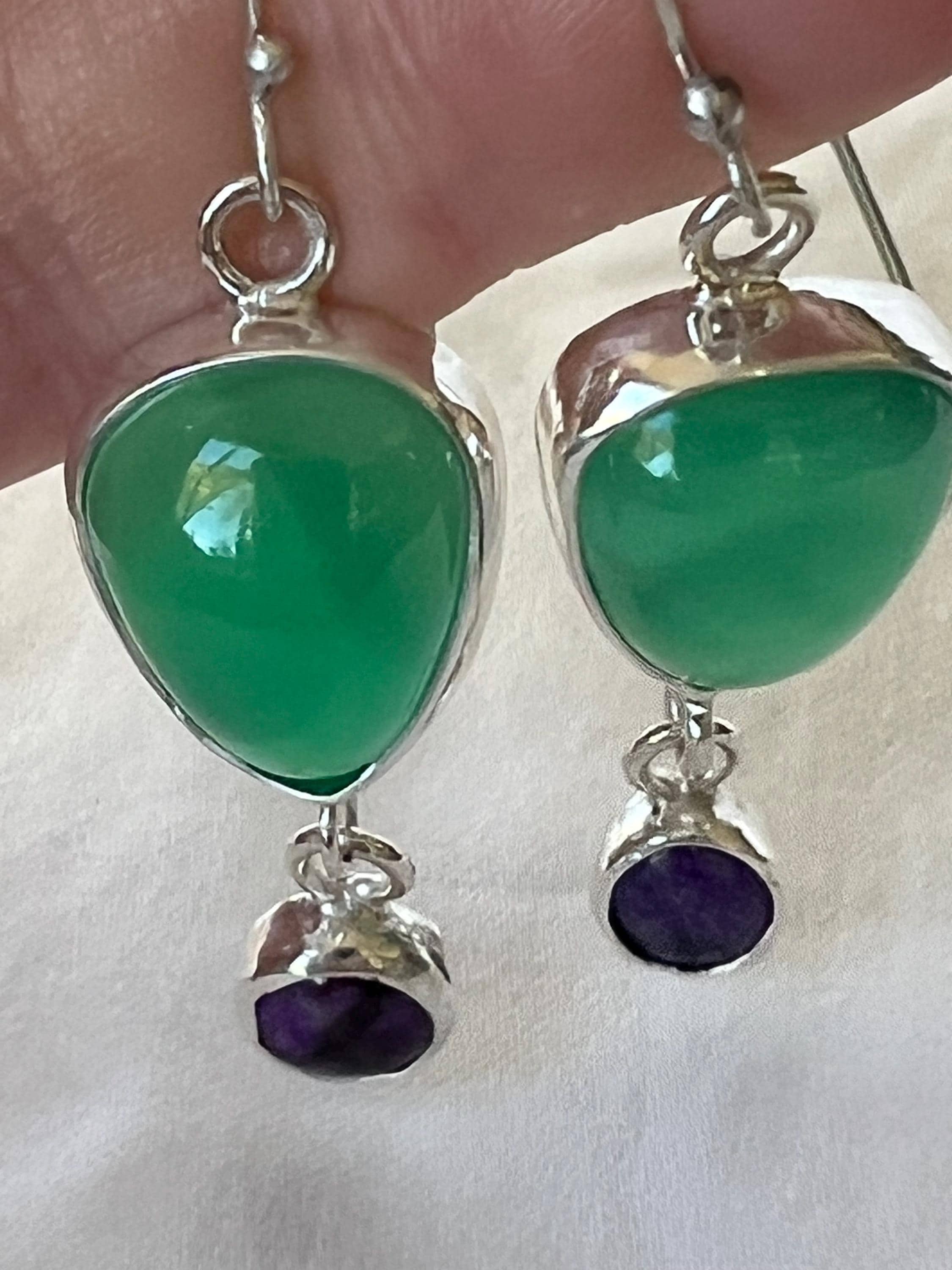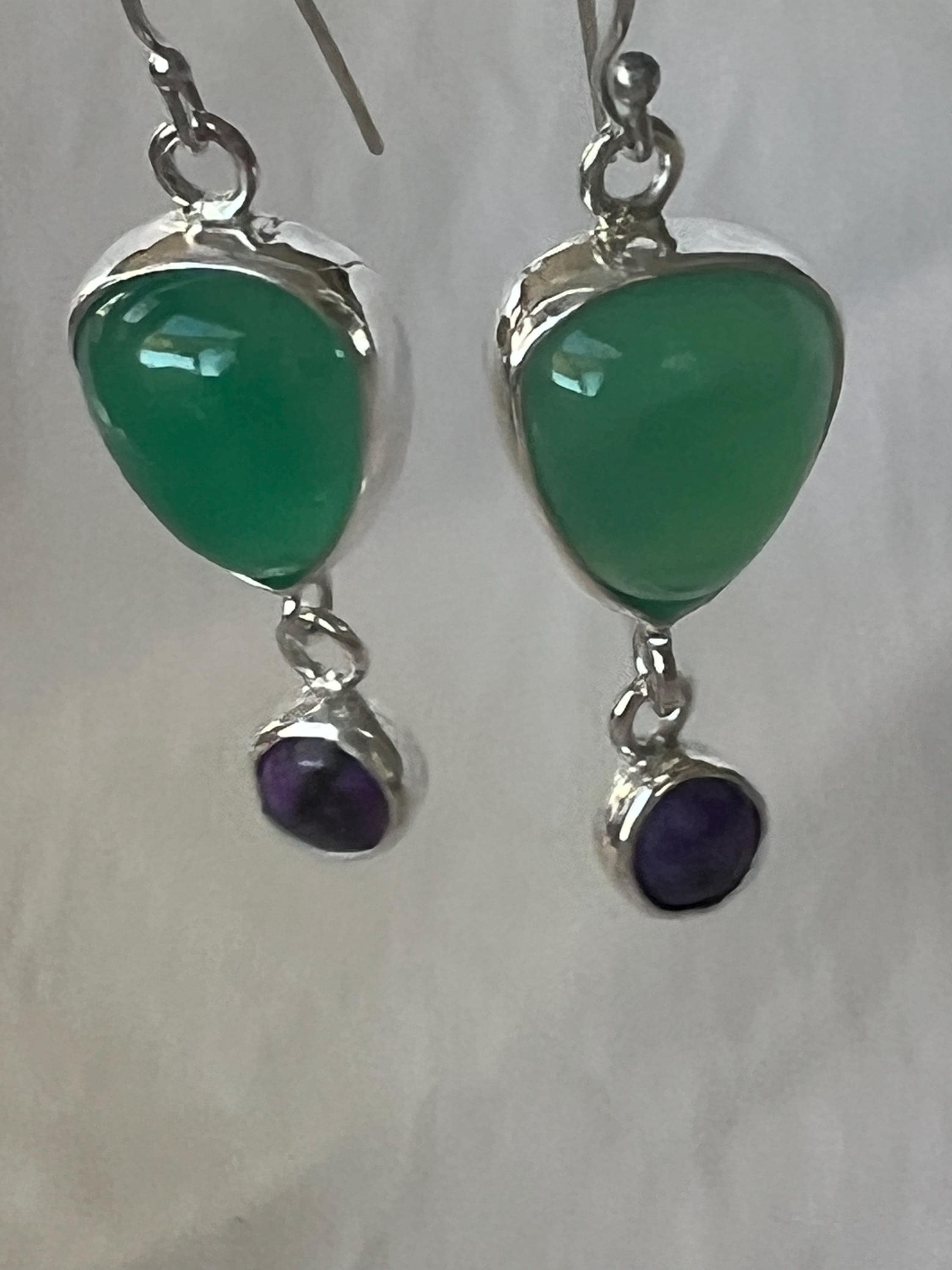 Pear shaped green chalcedony on top of round sugilite. All are set in sterling silver with sterling silver ear wires.