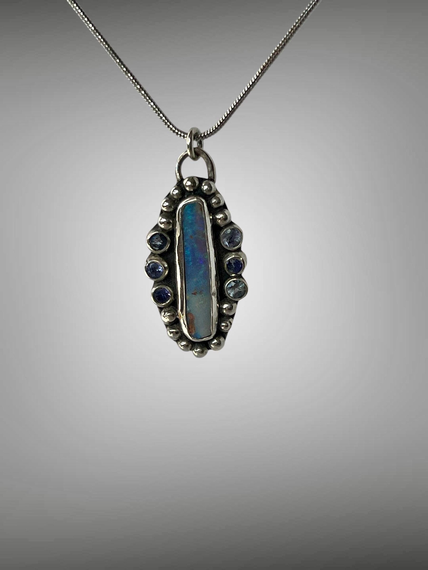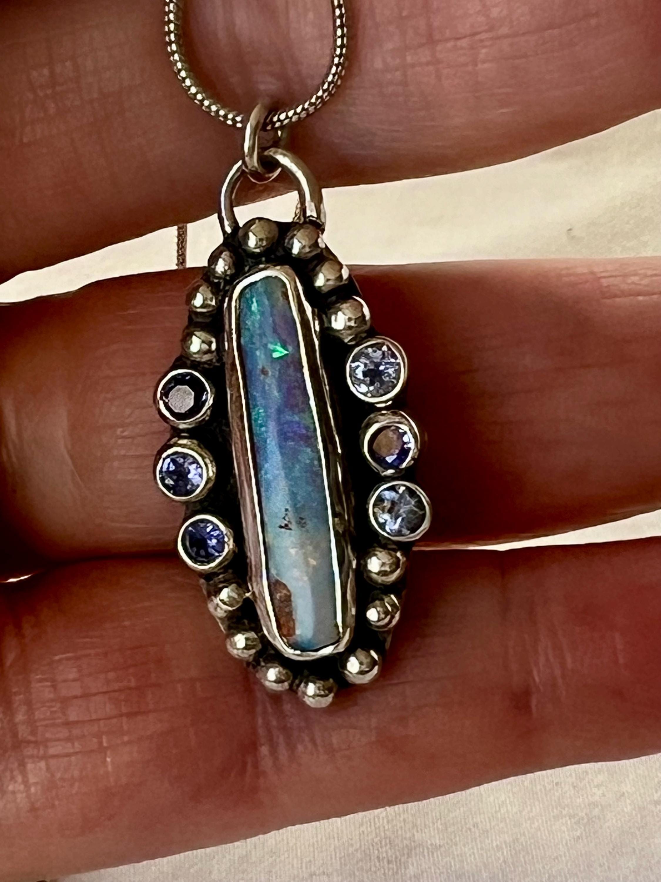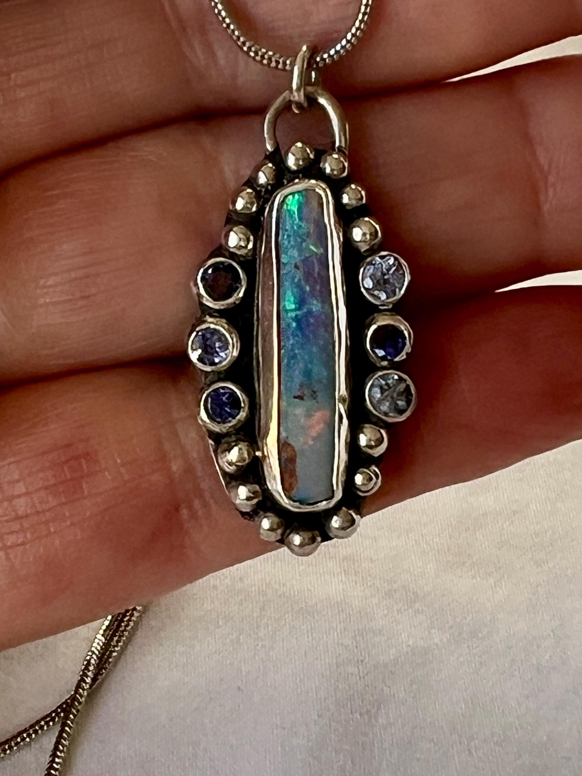 Beautiful translucent crystal opal in blues with flashes of pink and green. Flanked by six 3mm faceted tanzanite and silver granules. Bezel set, all in sterling silver.