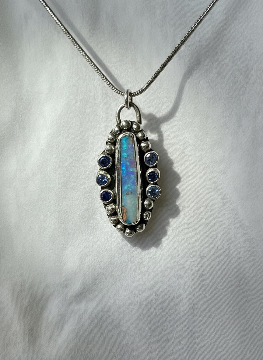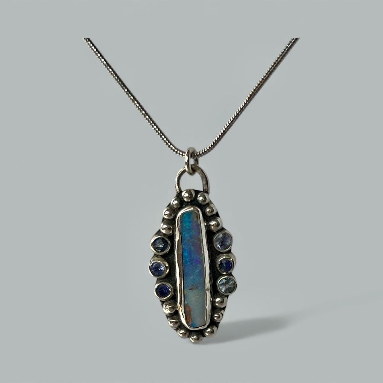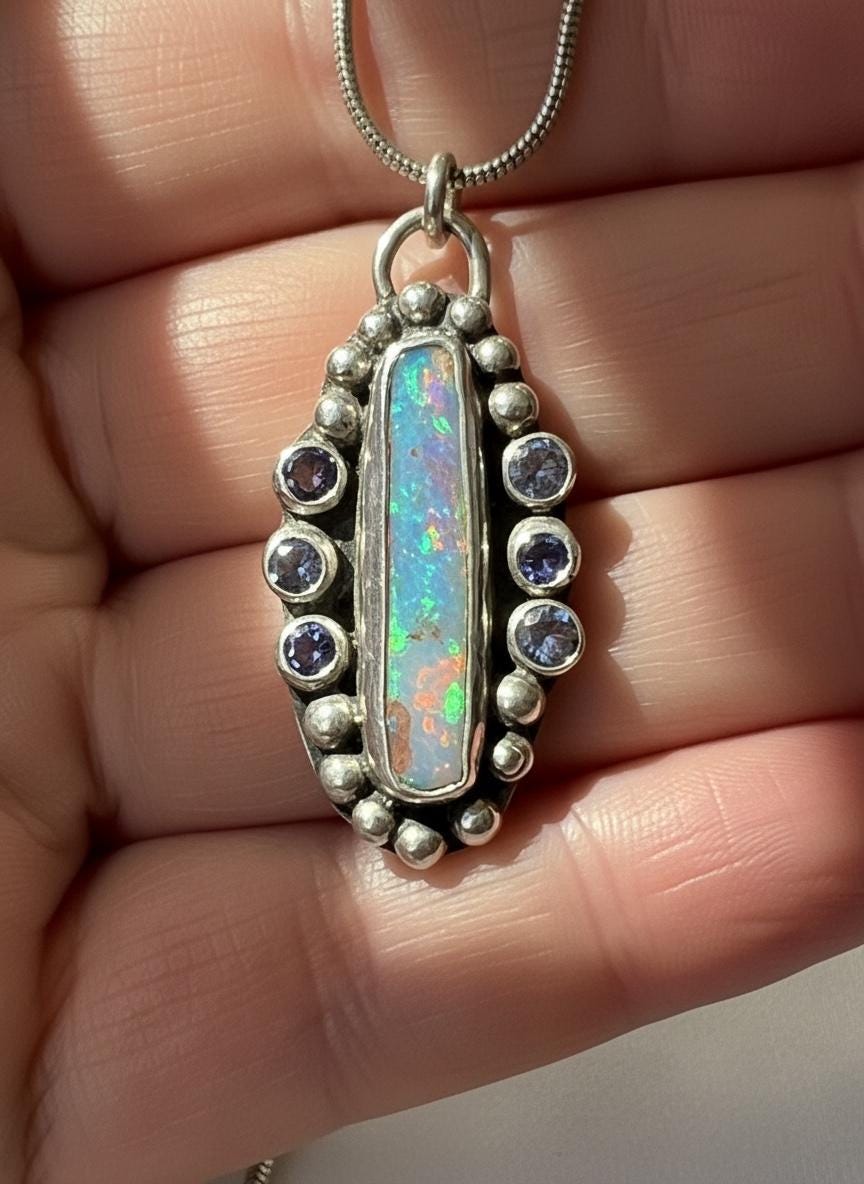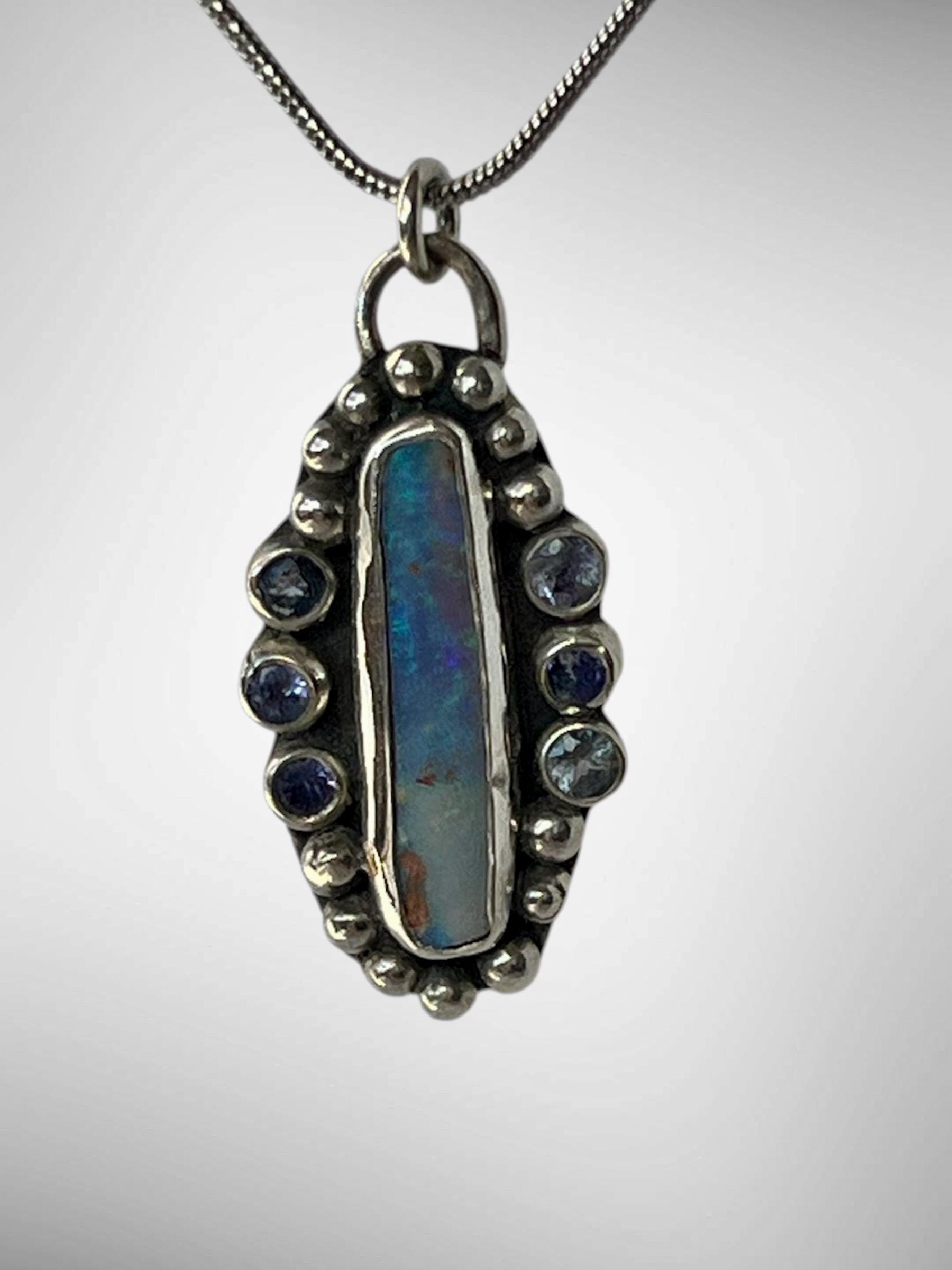 Beautiful translucent crystal opal in blues with flashes of pink and green. Flanked by six 3mm faceted tanzanite and silver granules. Bezel set, all in sterling silver.