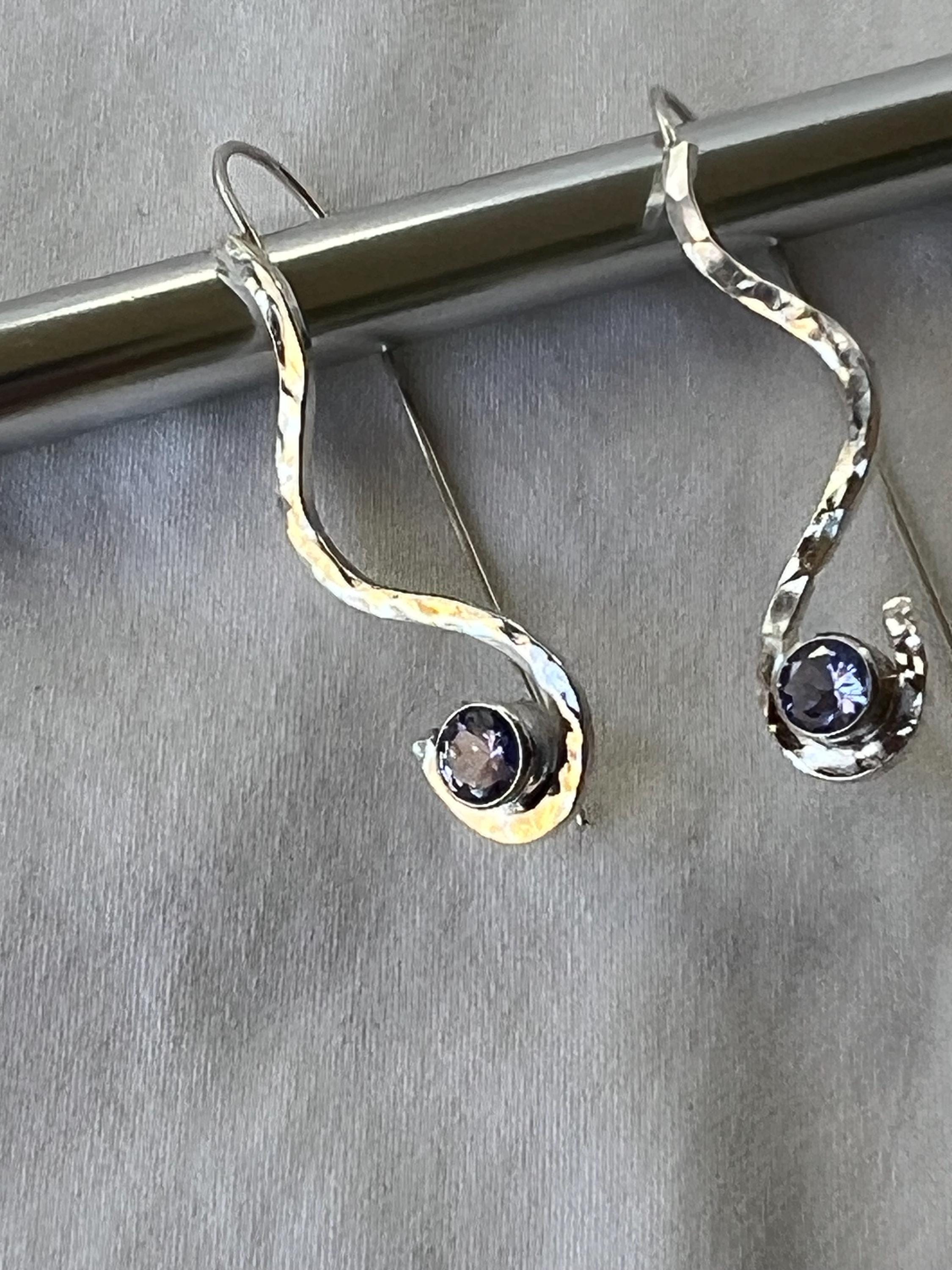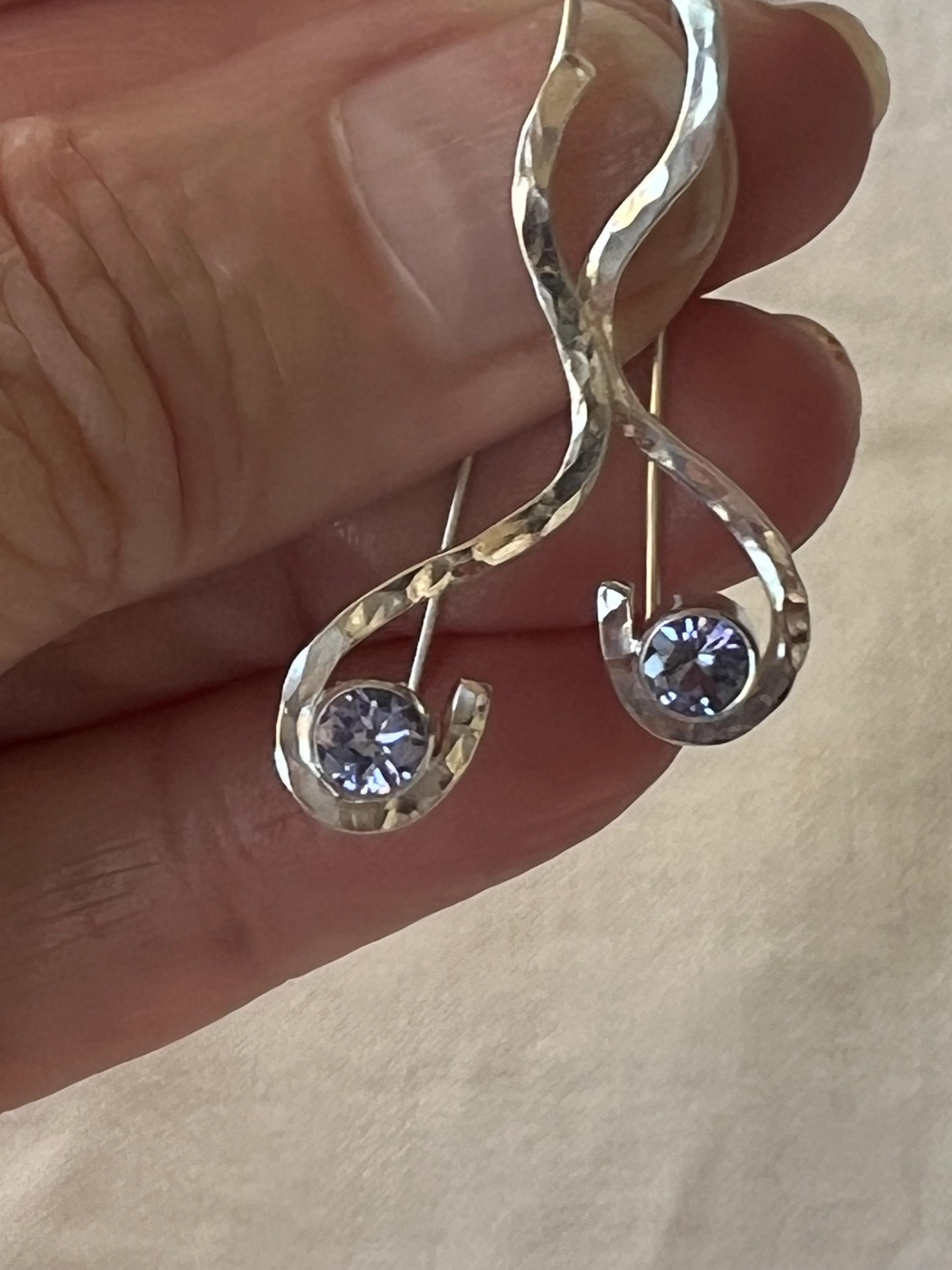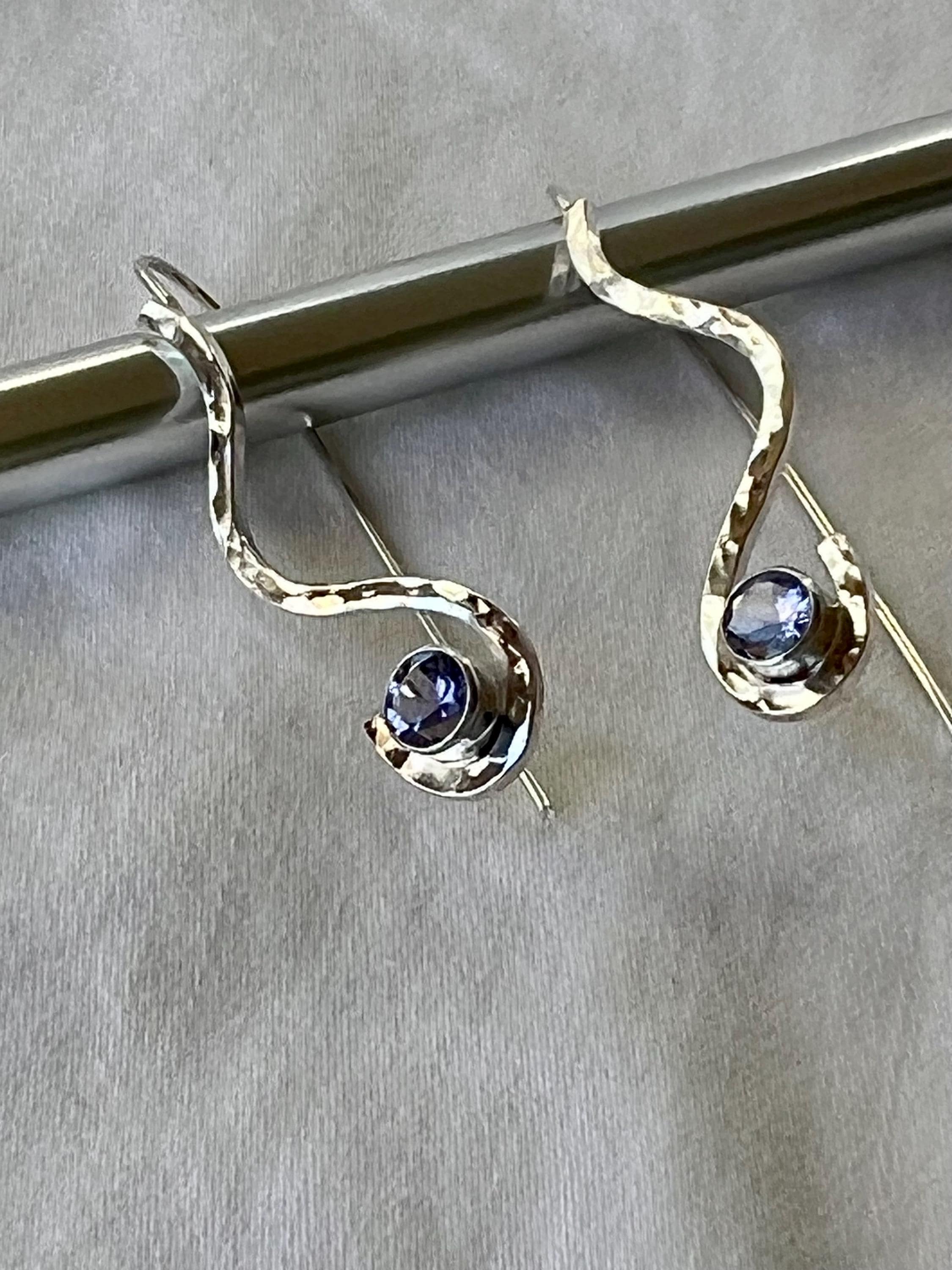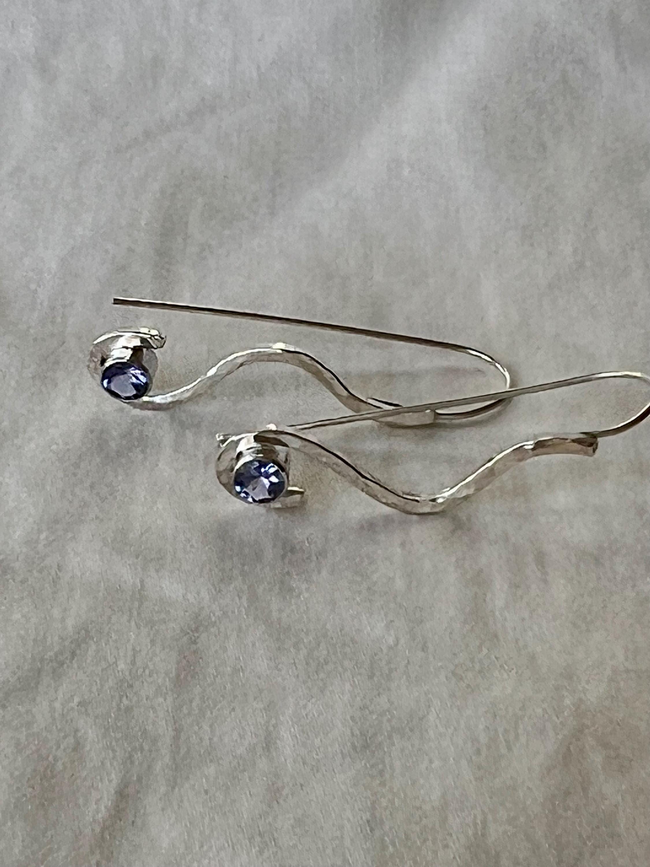 I’m excited to share my newest work, Tanzanite on curved hammered silver. This pair of earrings features a sleek, twisting form crafted from sterling silver, with subtle linear hammered texture that adds depth to the metal. Near the lower curve of each piece, I’ve set a round faceted tanzanite, its rich lavender / blue tone creates a strong yet elegant contrast against the polished silver. The design balances fluid, organic shapes with a modern, refined aesthetic, inviting attention to both the motion of the metal and the vibrant color of the stones. Throughout the process, I focused on achieving a harmony between the textured surface and the smooth gemstone, aiming to create a piece that feels both sculptural and wearable.
