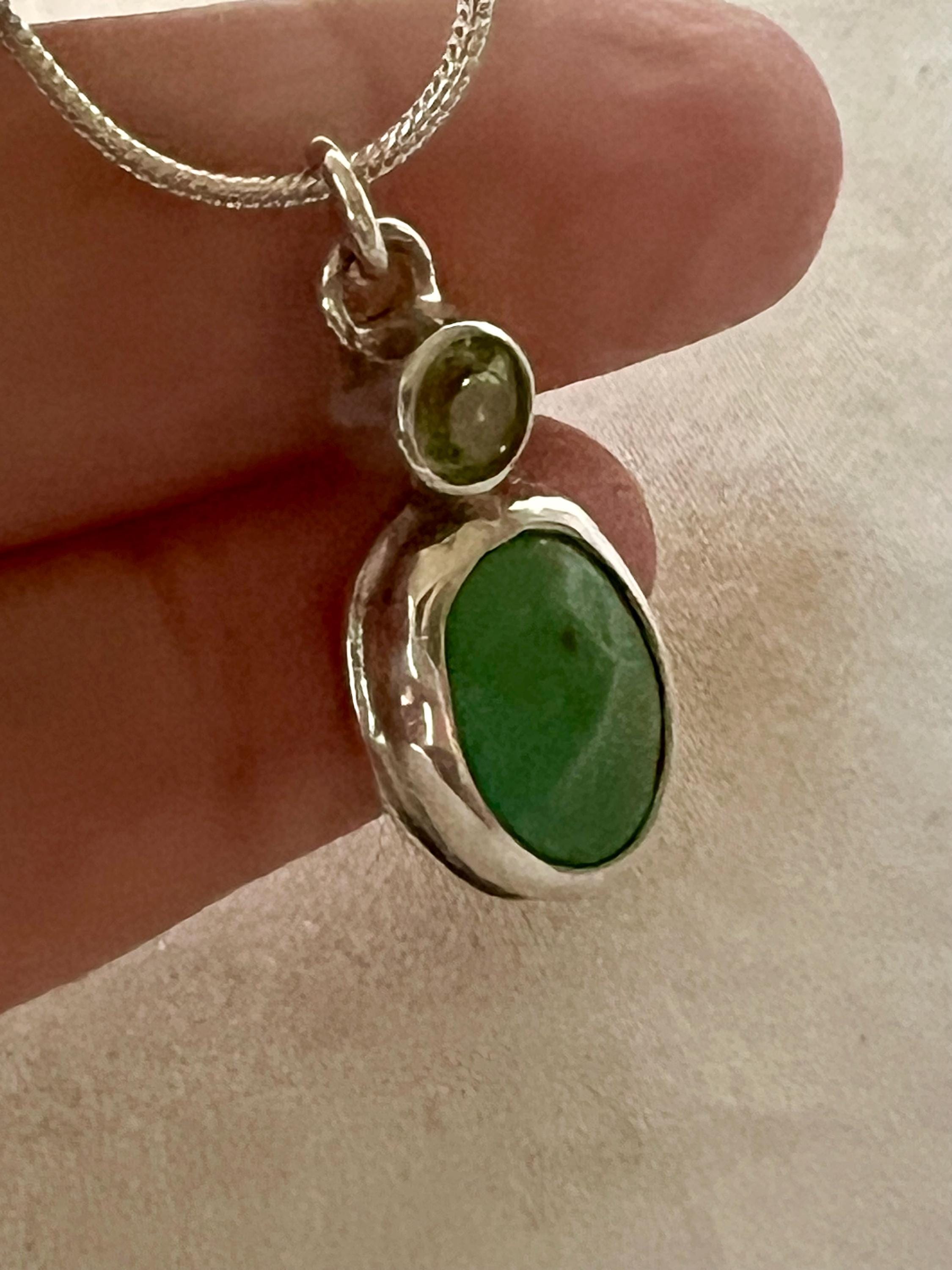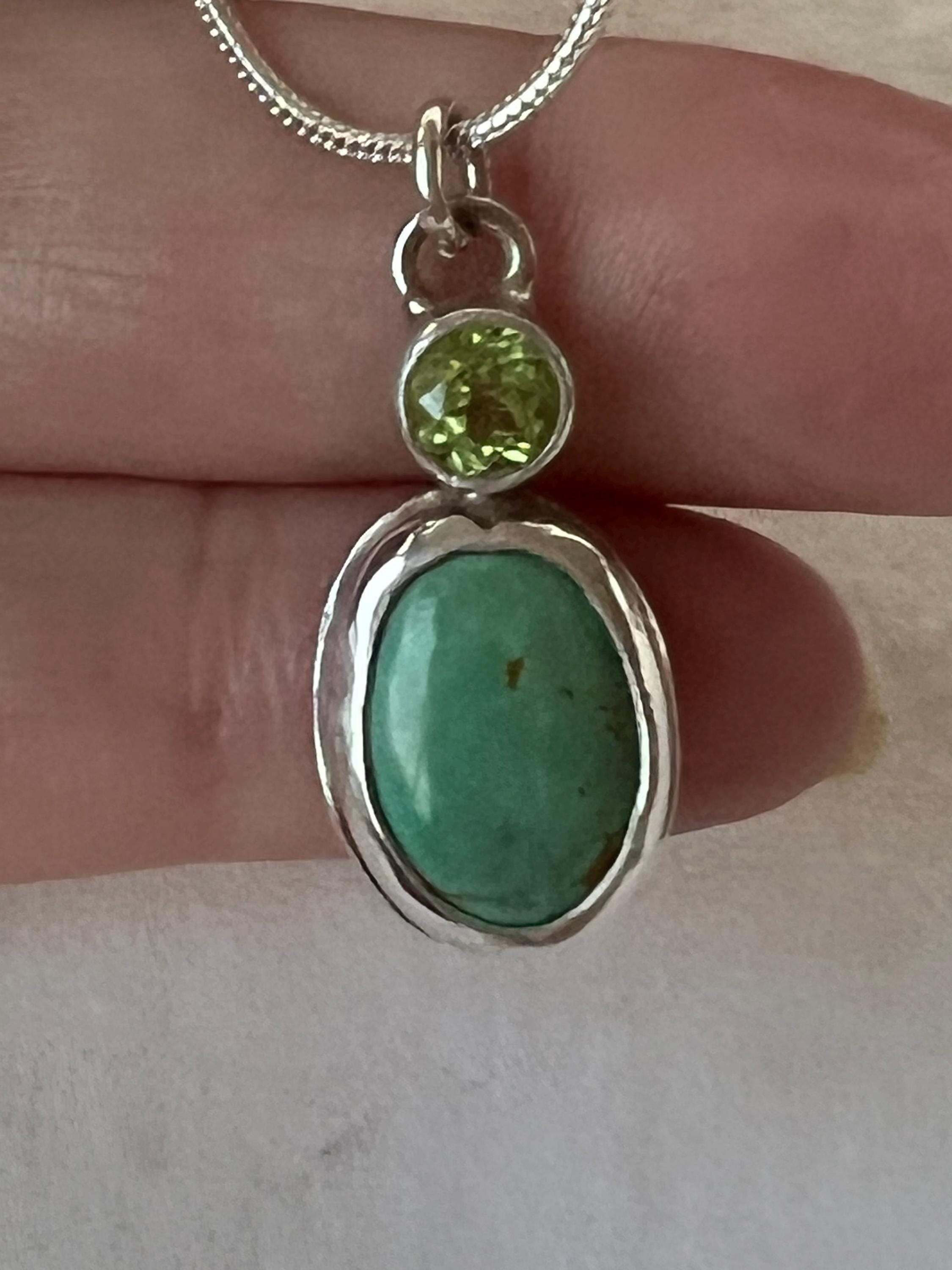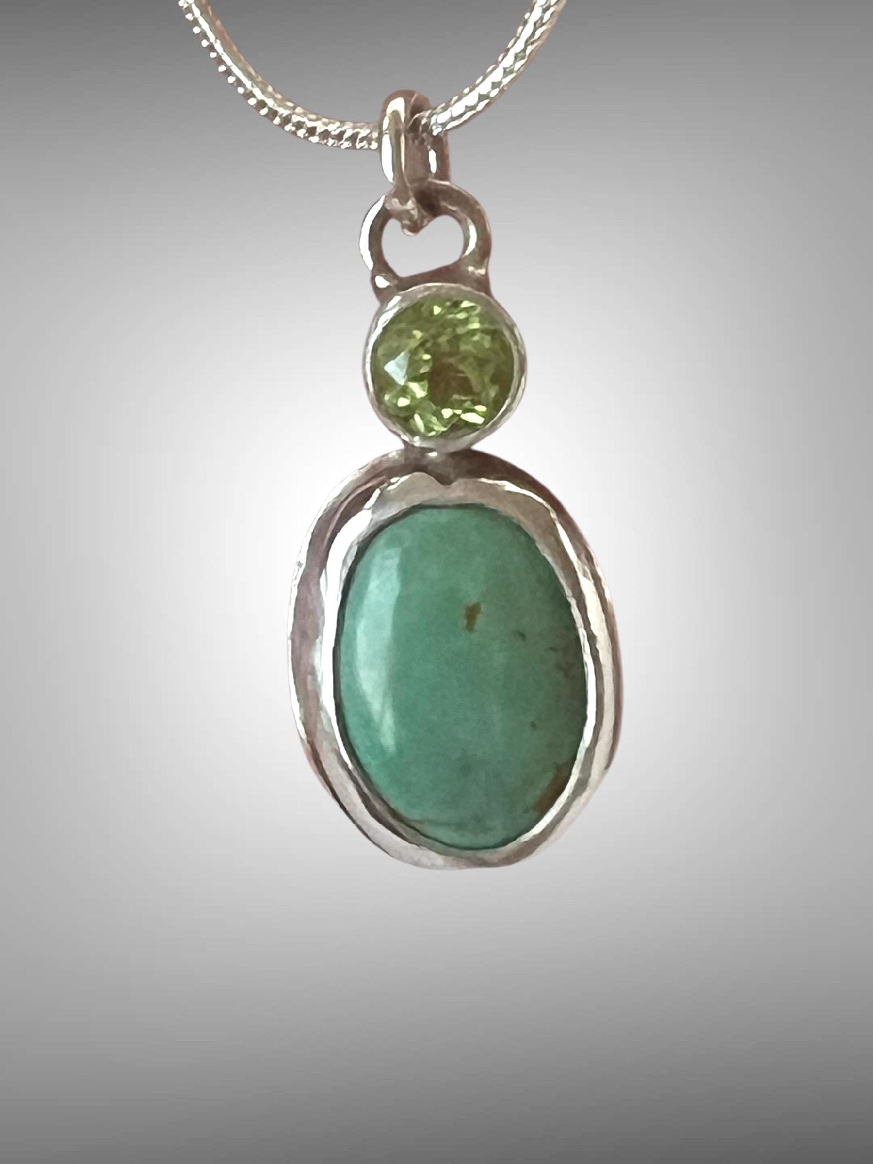 Sweet pendant with turquoise and peridot. It measures approximately 3/4” high by 1/2” wide. A silver chain is included.