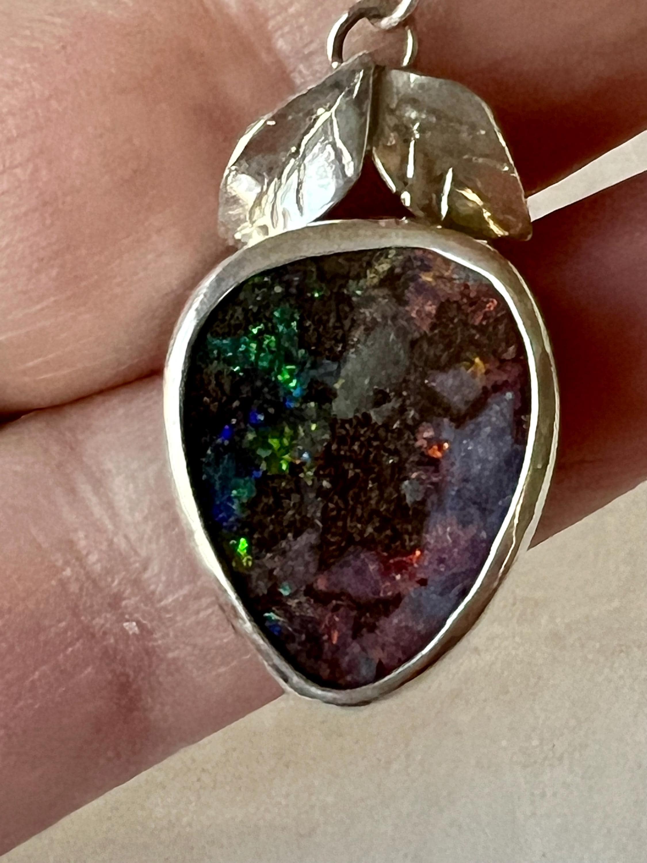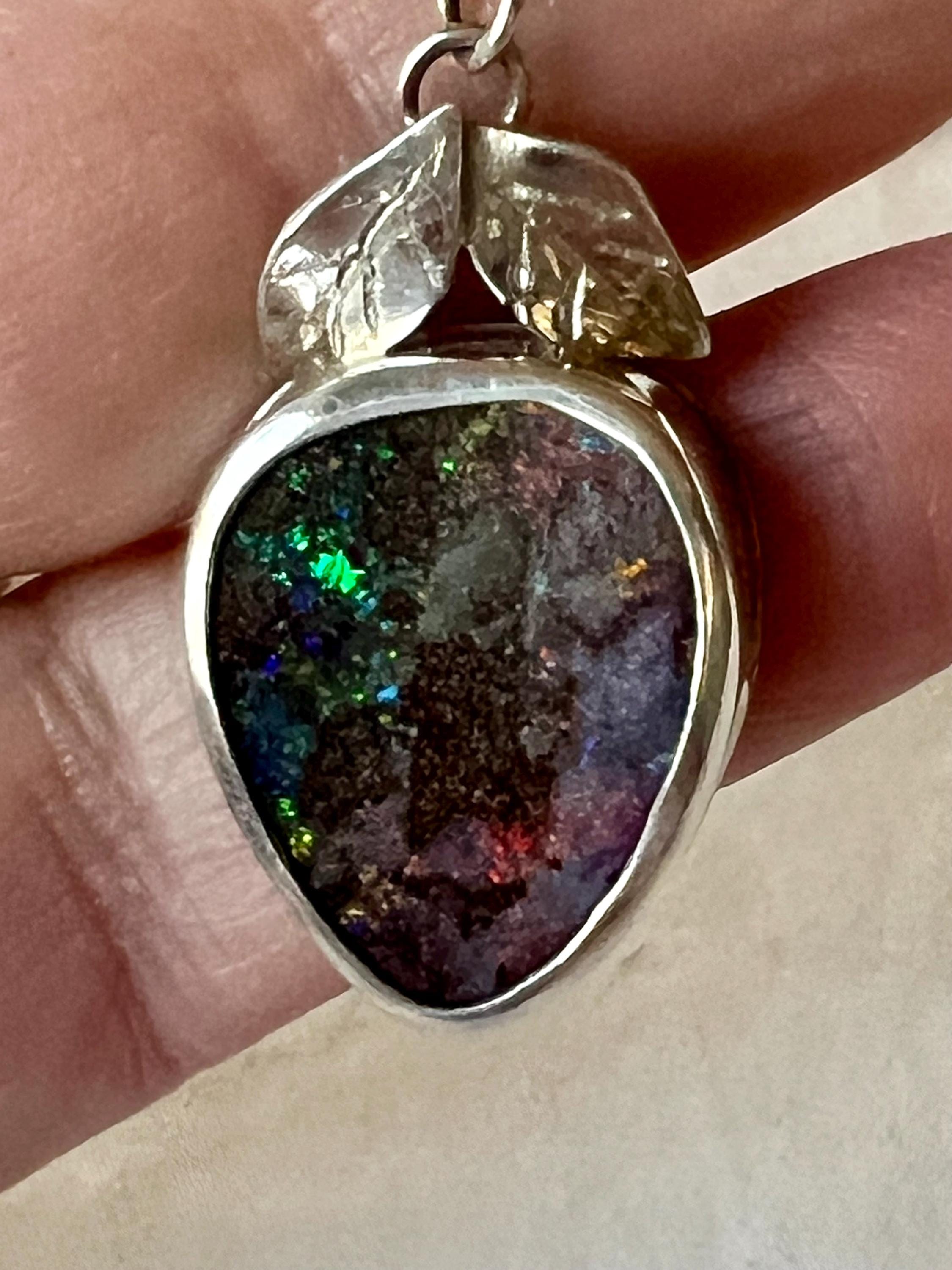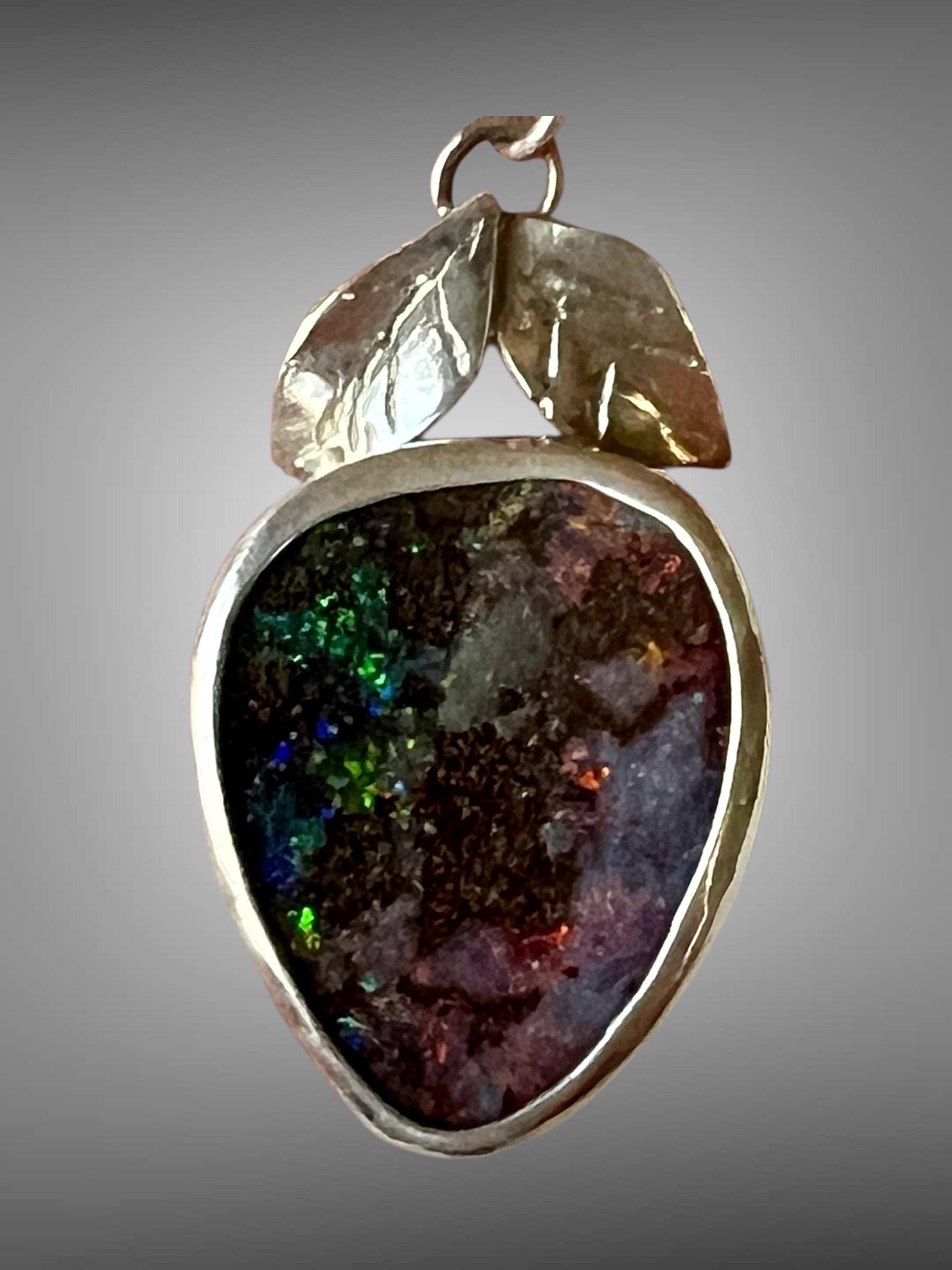 Australian Boulder Opal set in sterling silver. Two hand carved silver leaves set a top the stone. It looks like a berry! Measures approximately 1-1/4” high by 3/4” wide. A silver chain is included.