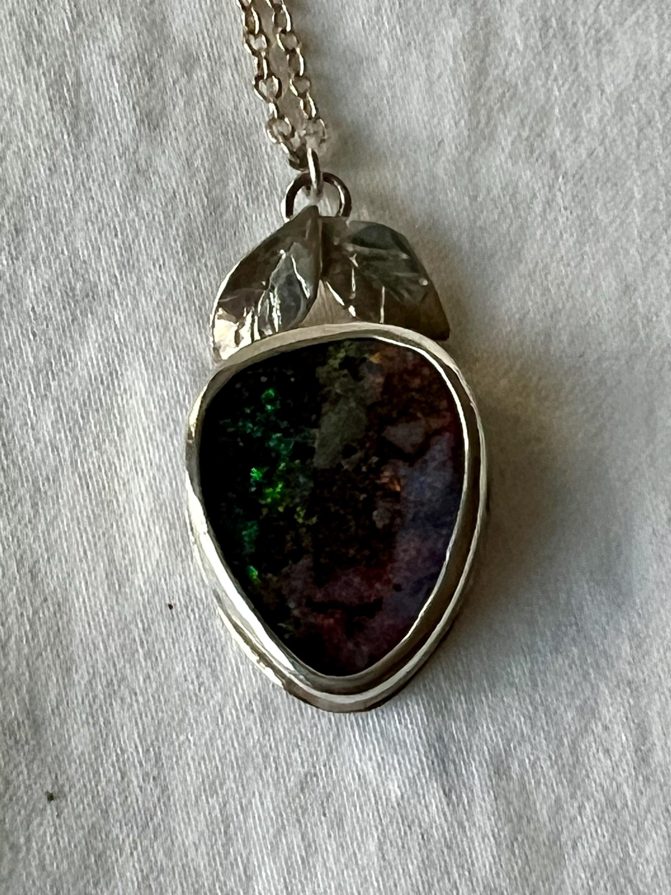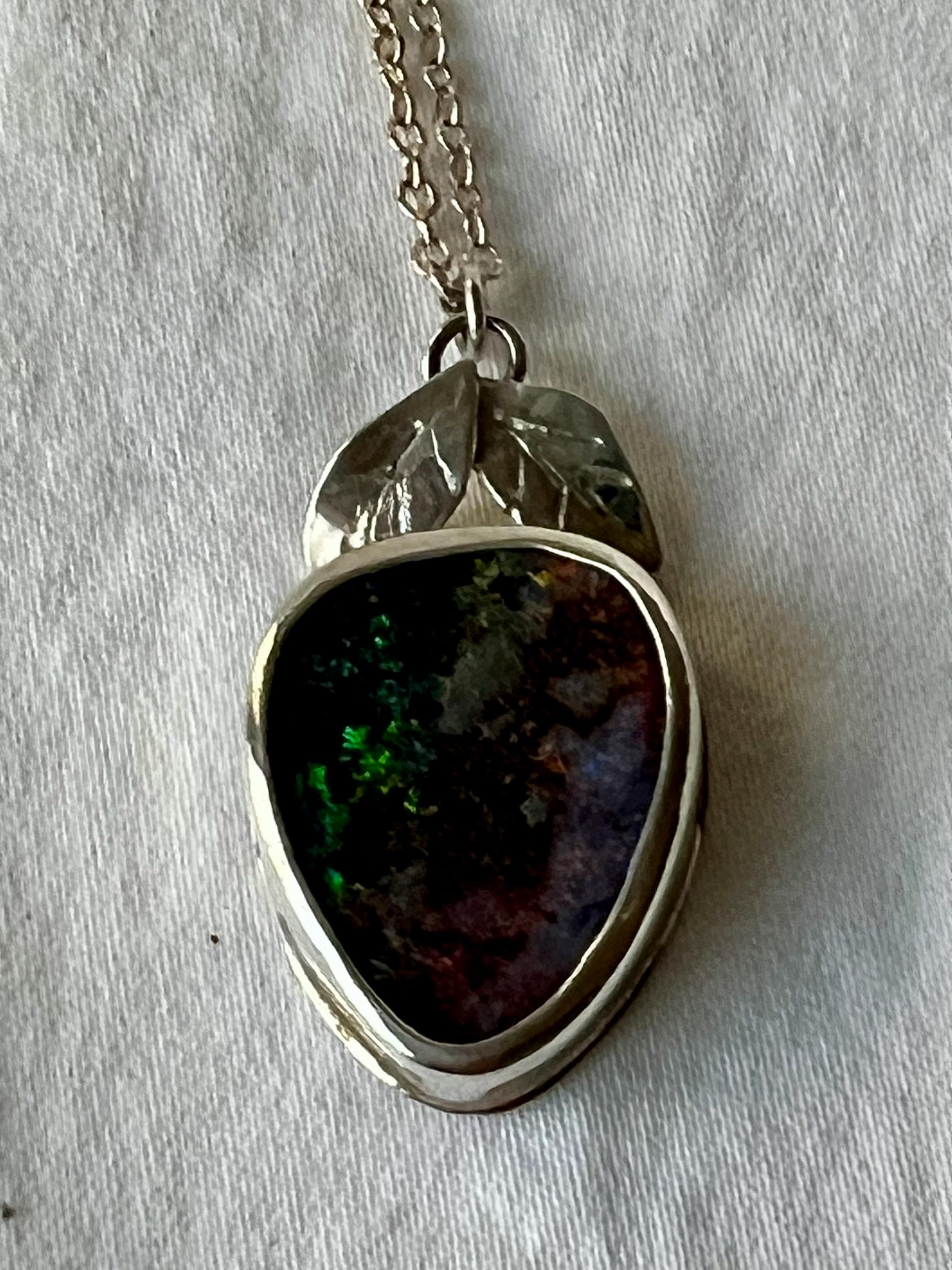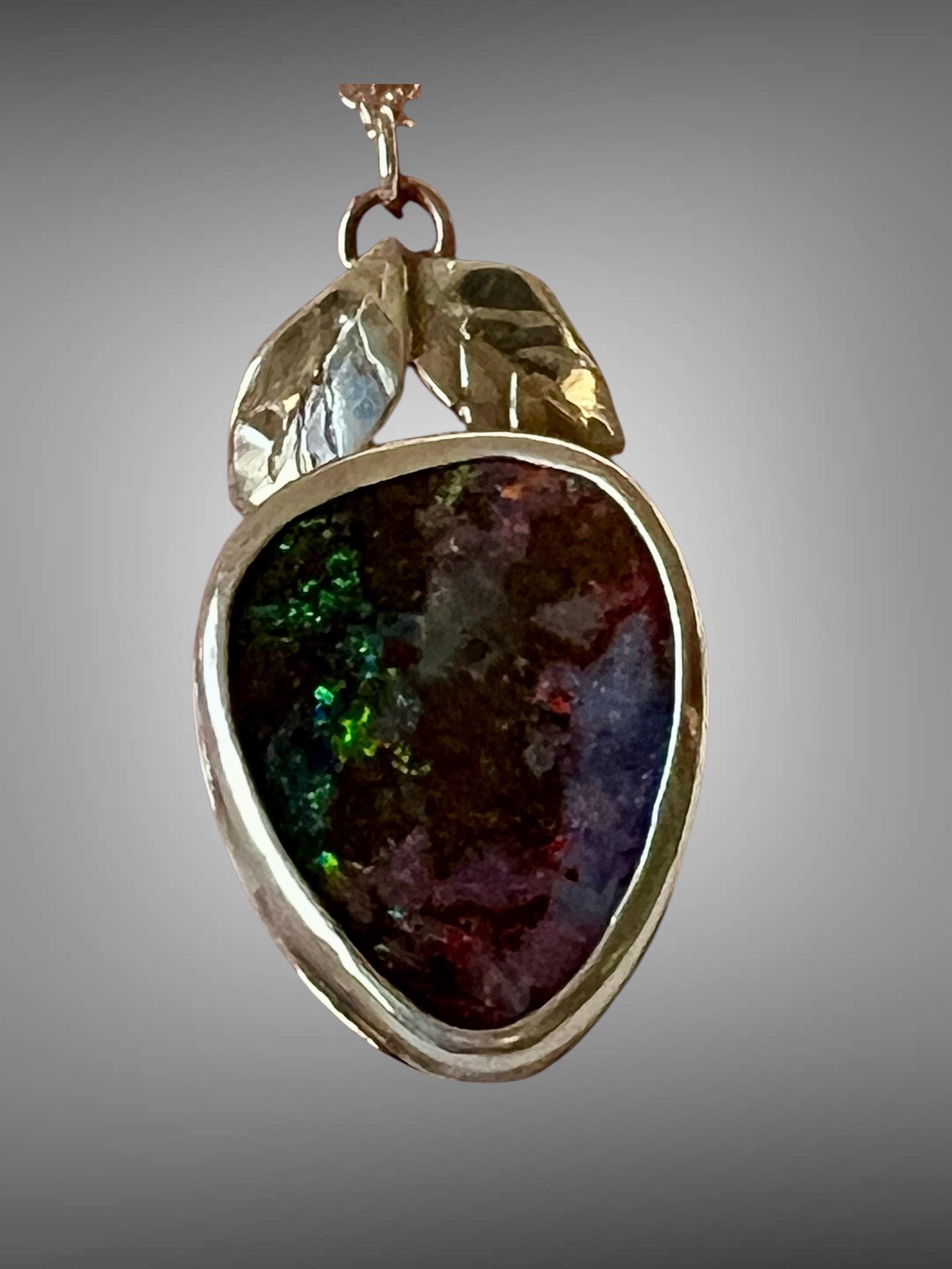 Australian Boulder Opal set in sterling silver. Two hand carved silver leaves set a top the stone. It looks like a berry! Measures approximately 1-1/4” high by 3/4” wide. A silver chain is included.