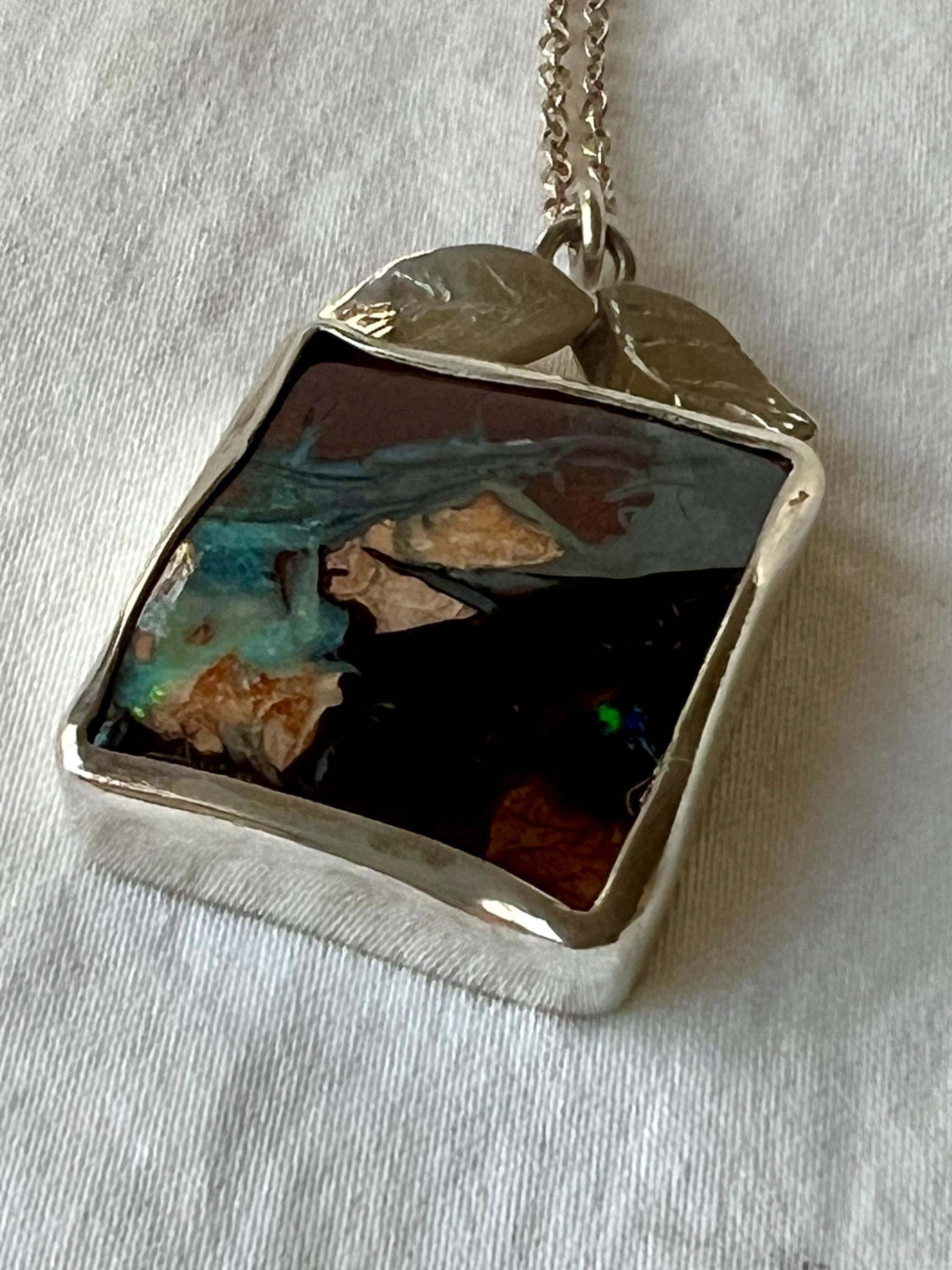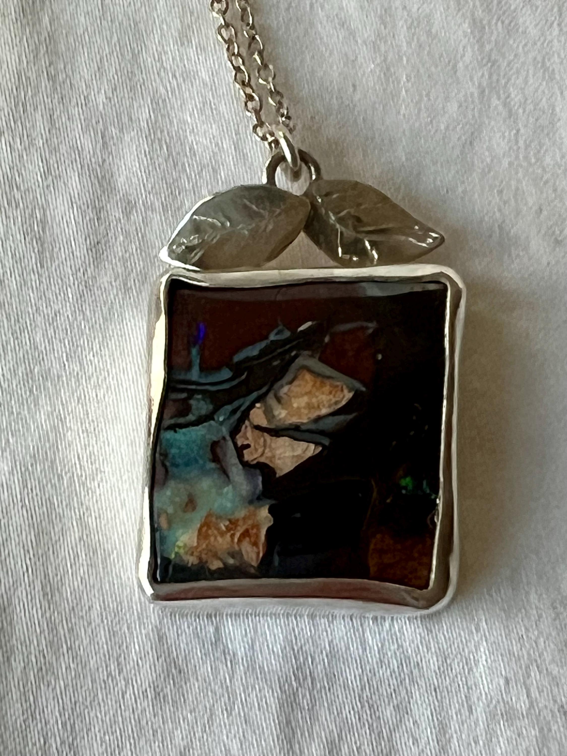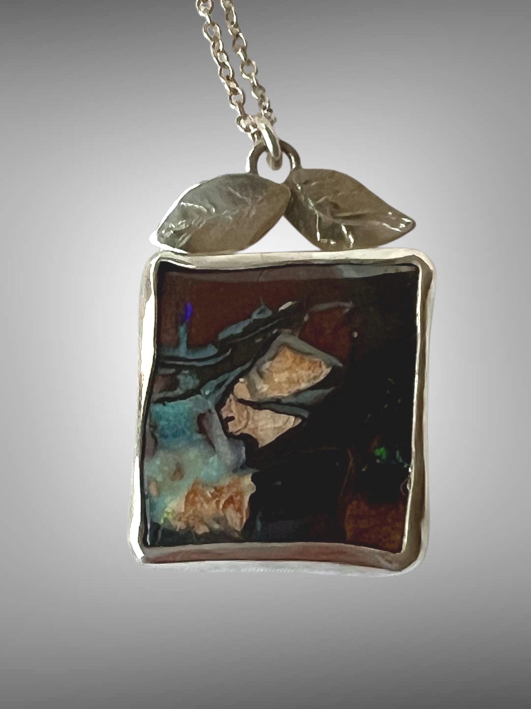 Highly polished Australian Boulder picture Opal, bezel set in sterling silver. Hand carved silver leaves are set a top the stone for interest. The piece measures approximately 1-1/4” x 1”. A silver chain is included.