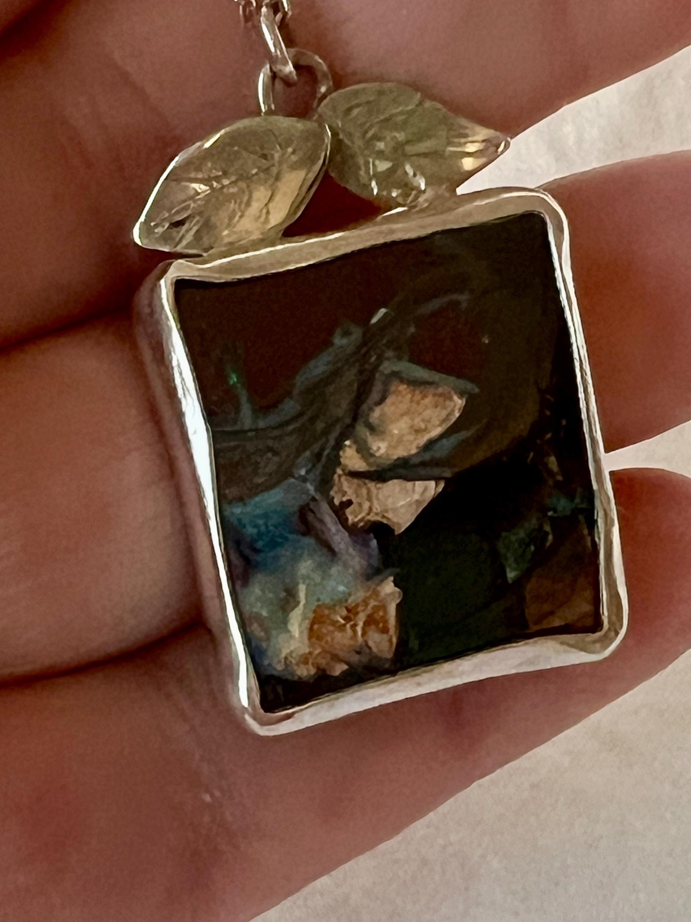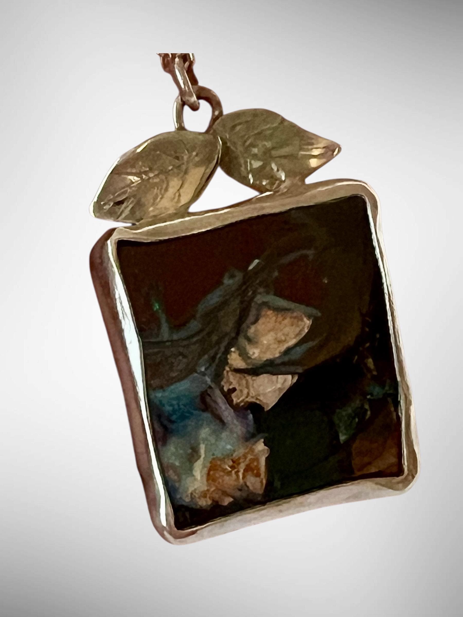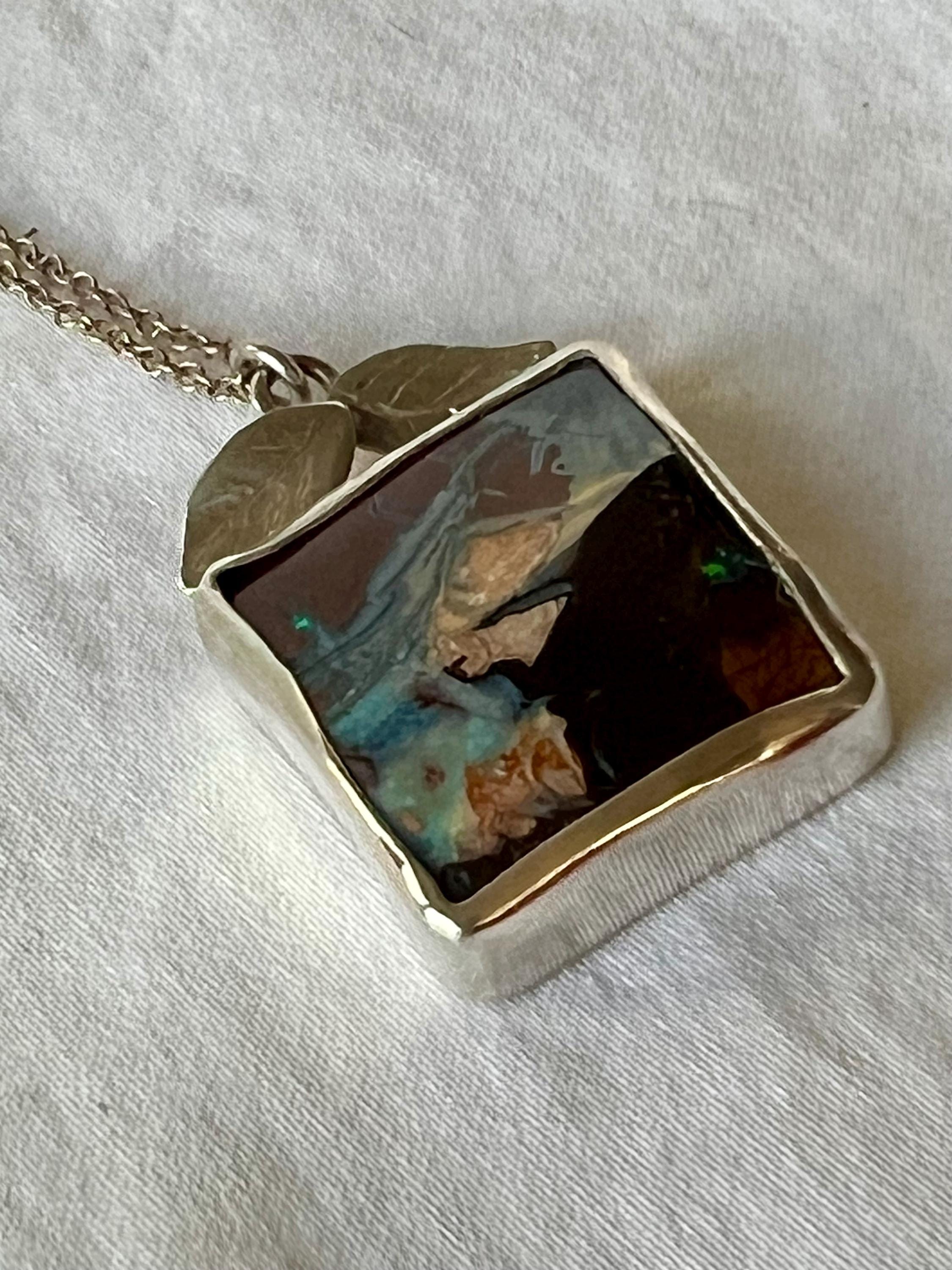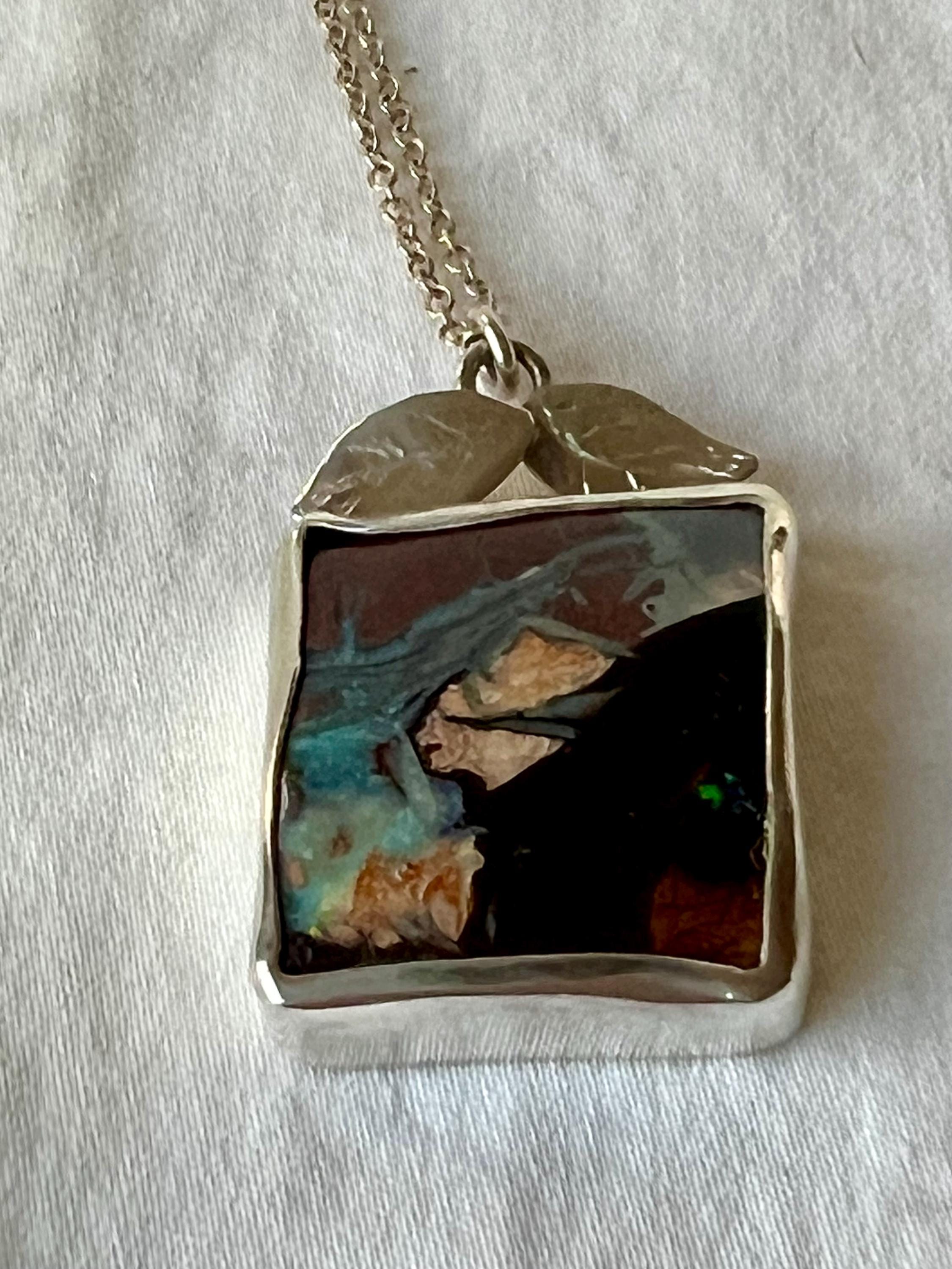 Highly polished Australian Boulder picture Opal, bezel set in sterling silver. Hand carved silver leaves are set a top the stone for interest. The piece measures approximately 1-1/4” x 1”. A silver chain is included.