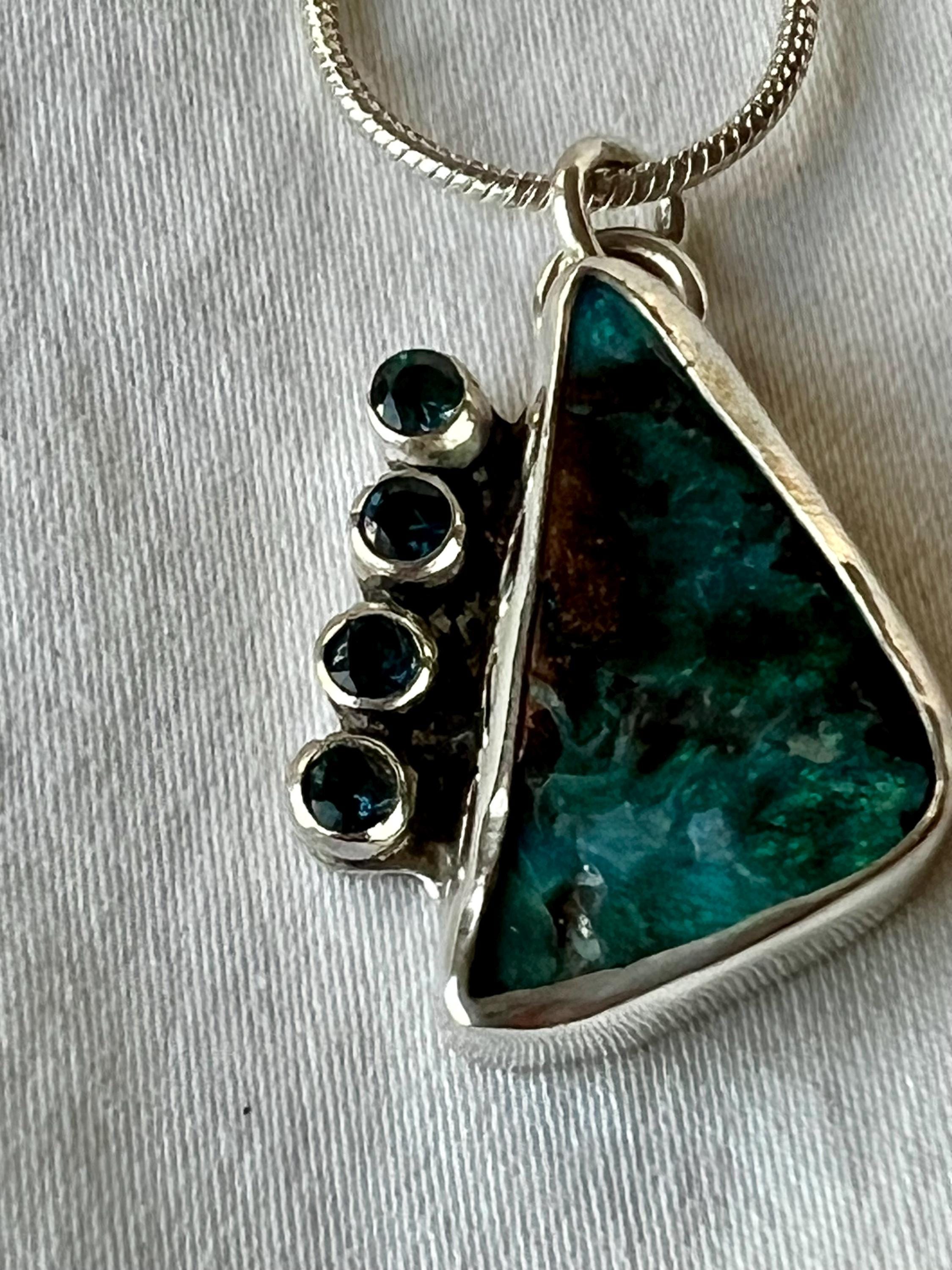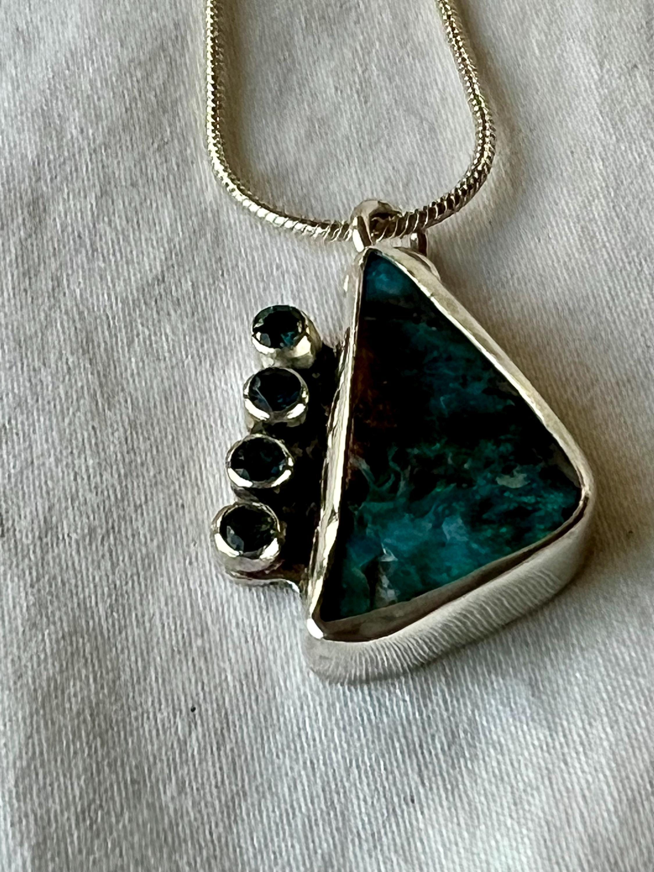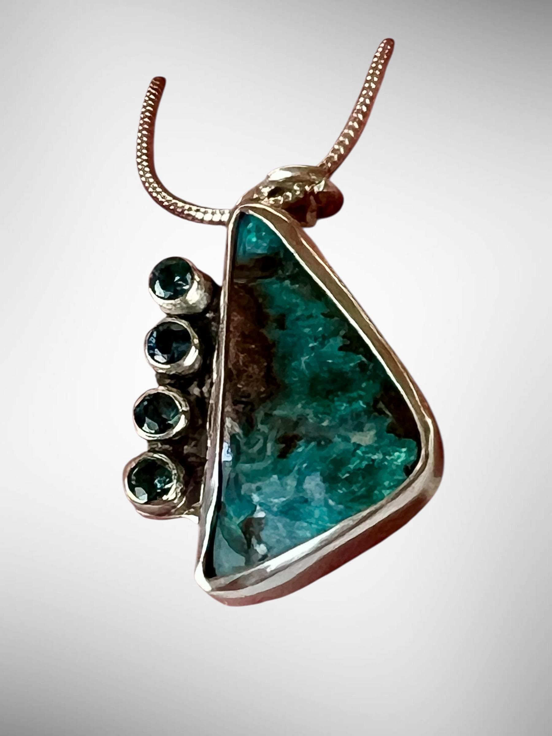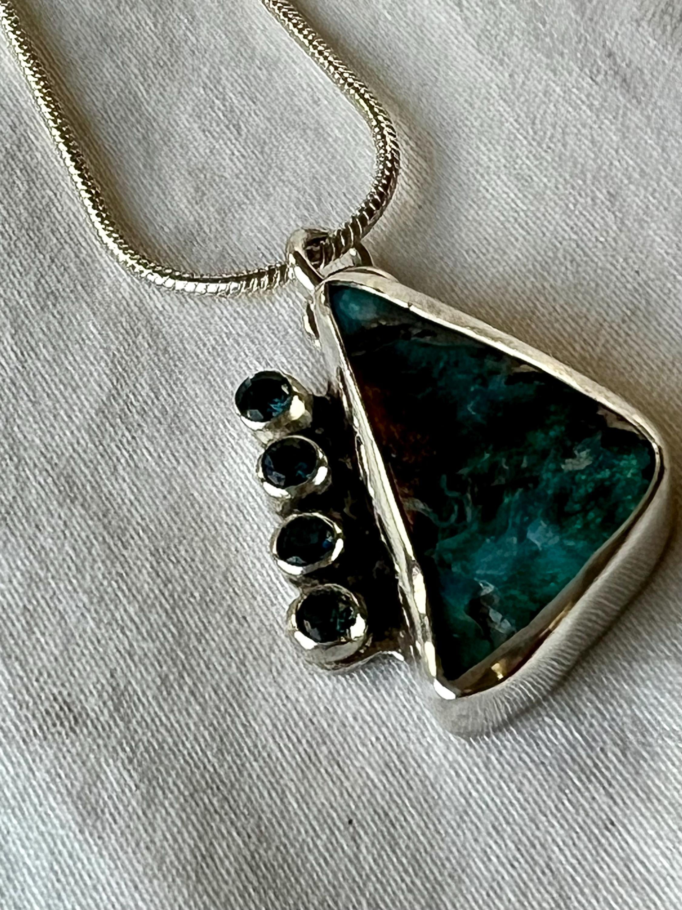 This opal looks like the deep blue sea or a galaxy. It’s free form with four 3mm dark blue sapphires set next to it. All is set in sterling silver and measures approximately 1-1/4” x 1” wide. A silver chain is included.