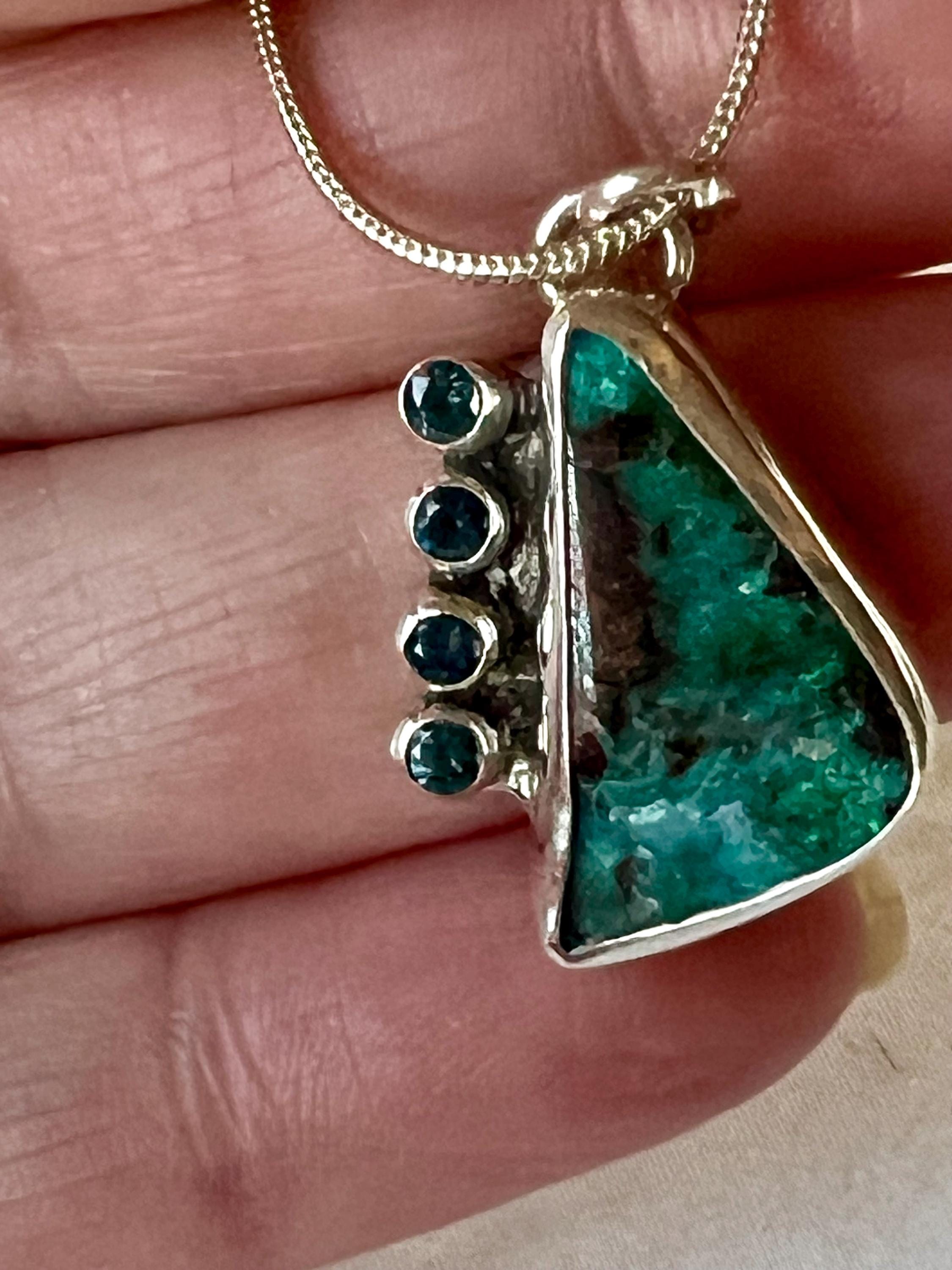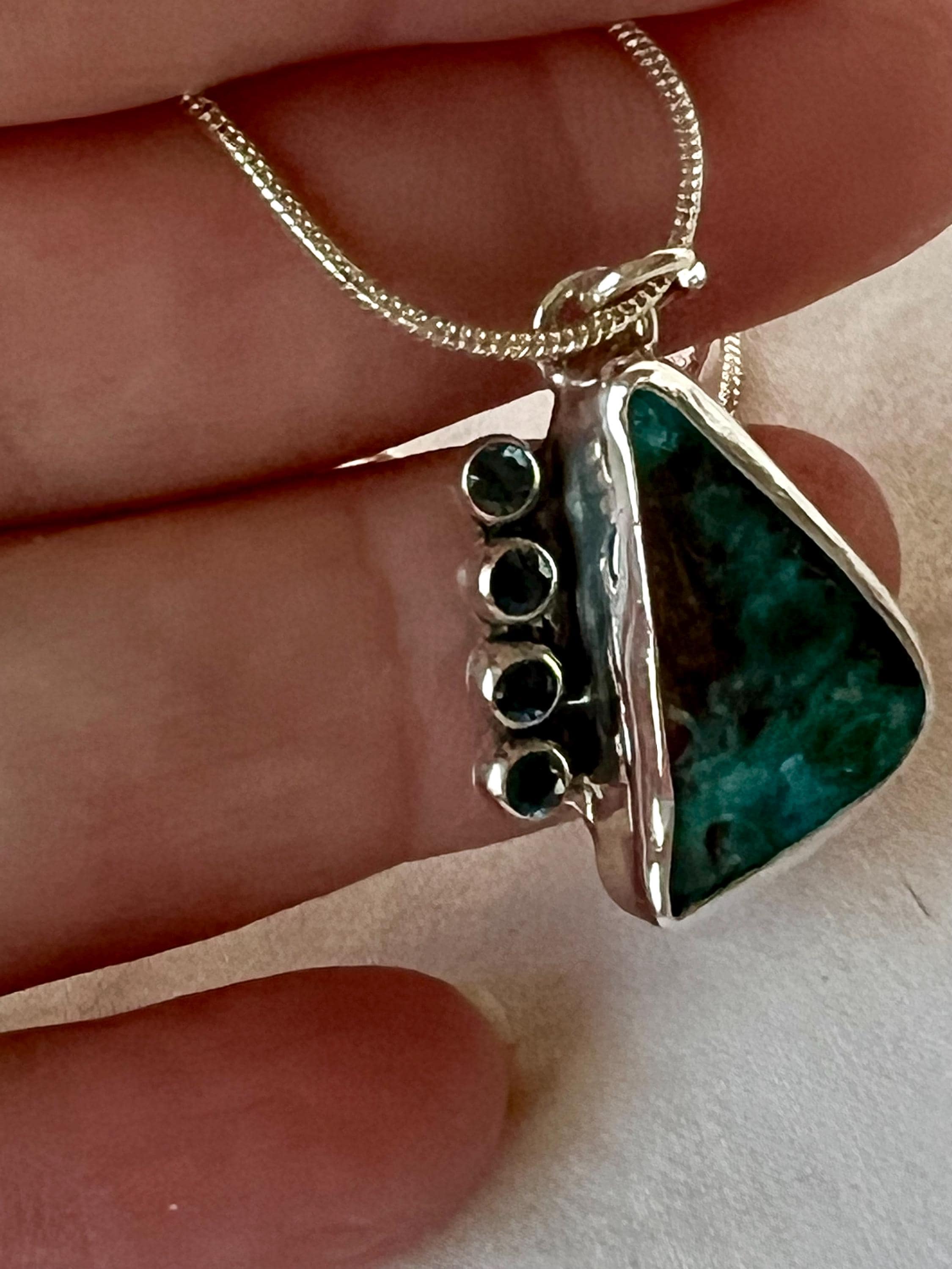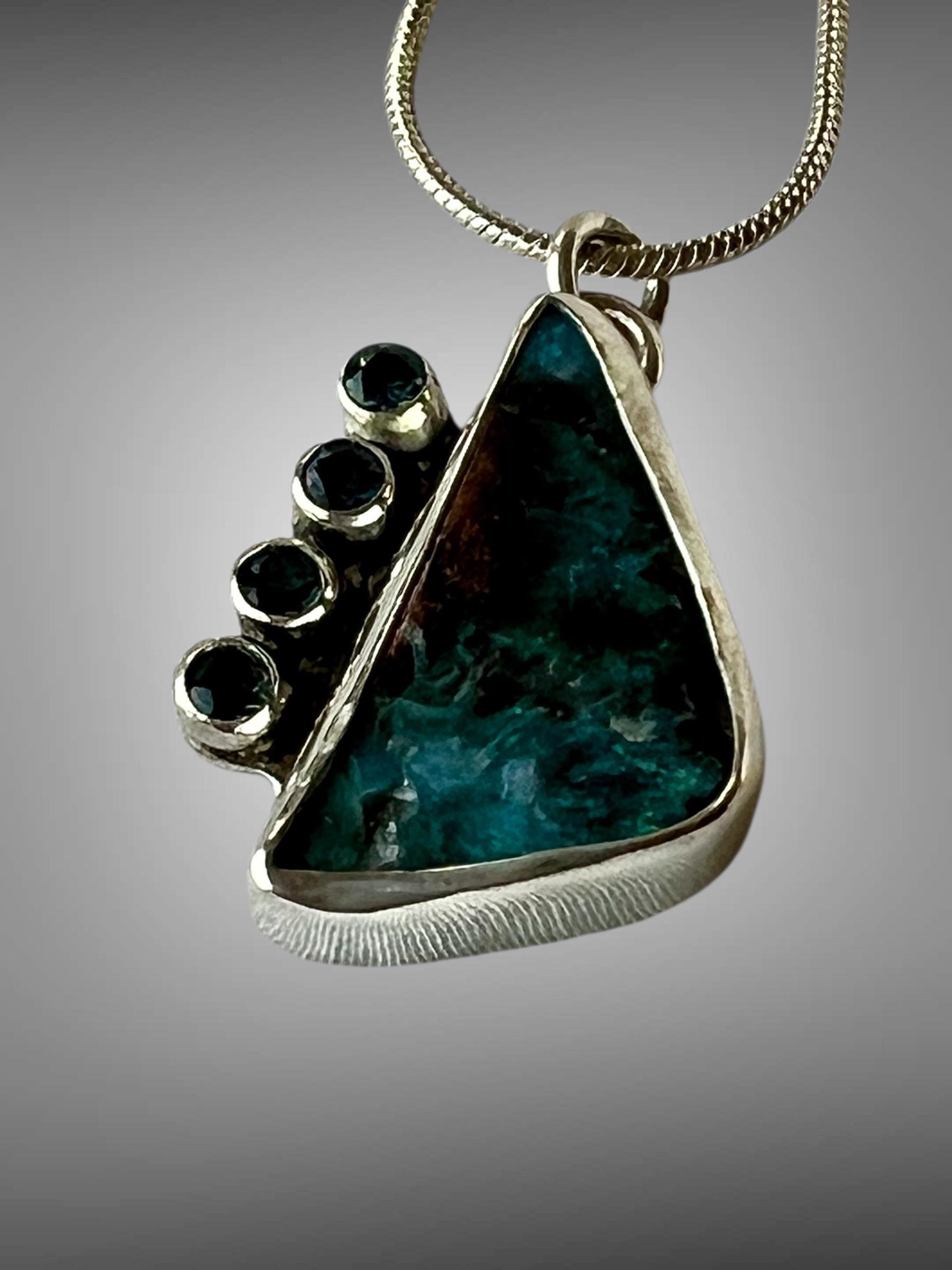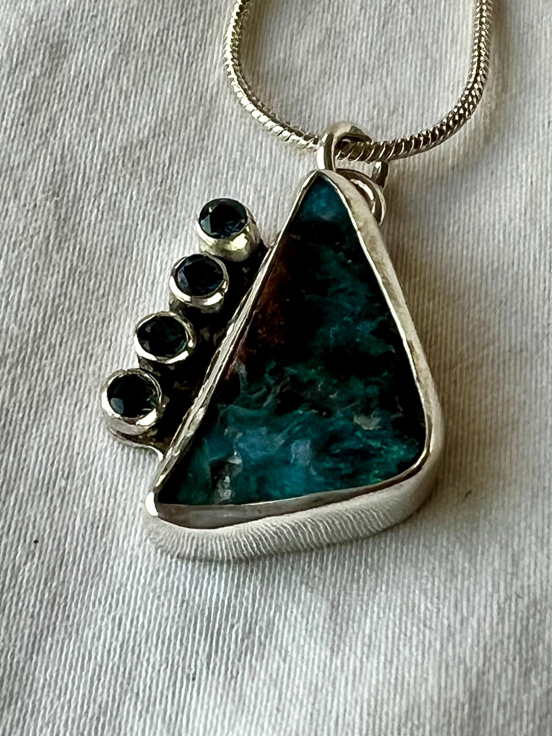 This opal looks like the deep blue sea or a galaxy. It’s free form with four 3mm dark blue sapphires set next to it. All is set in sterling silver and measures approximately 1-1/4” x 1” wide. A silver chain is included.