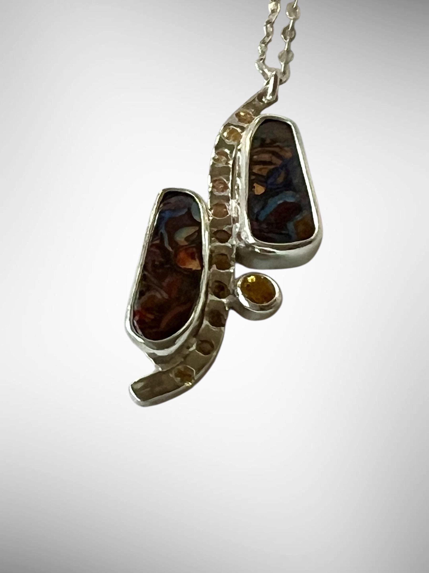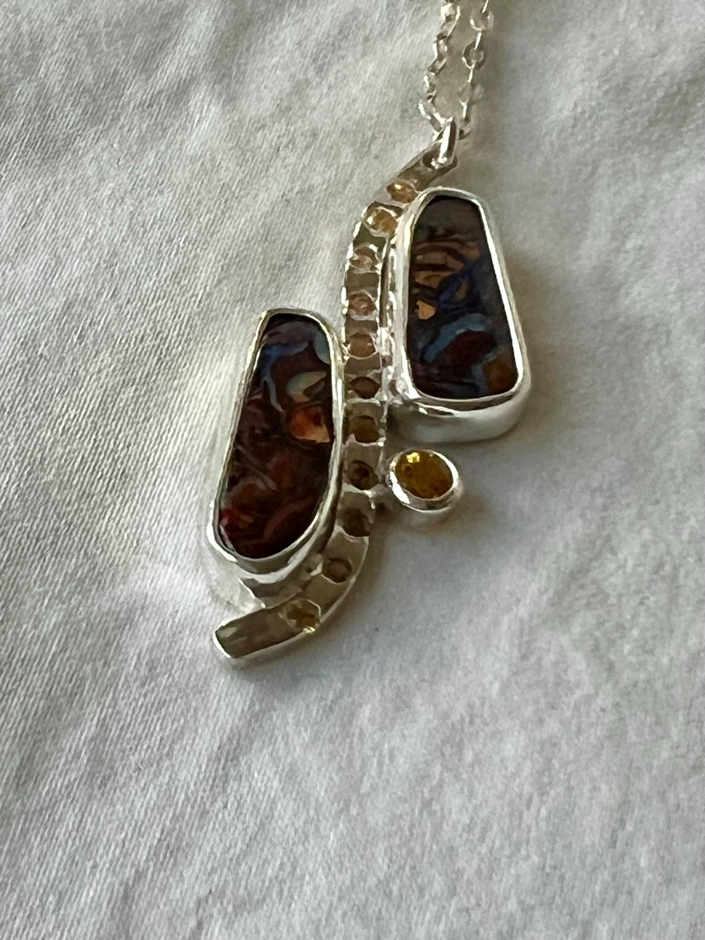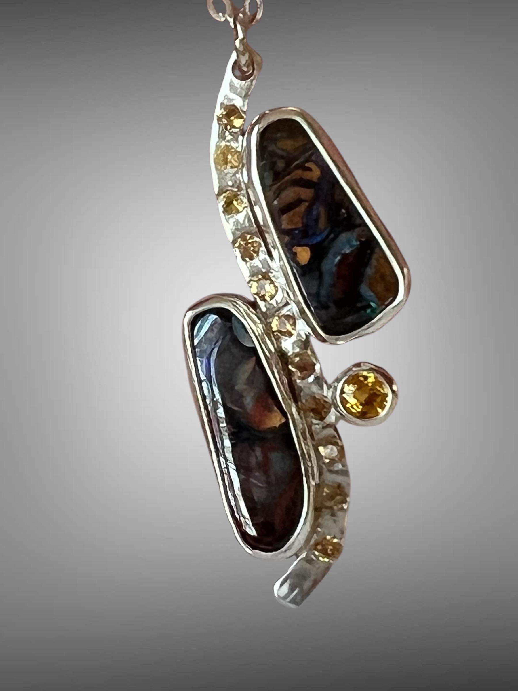 This is a unique pendant with two boulder opals set on either side of an “s” curve. The curve has 10 flush set yellow sapphires along it. A 4mm citrine is set beneath one of the opals. The opals are nicely patterned and colored with brown, blue and yellow/orange. All is set in sterling silver. The pendant measures approximately 1-3/4” high by 3/4” wide. A silver chain is included.