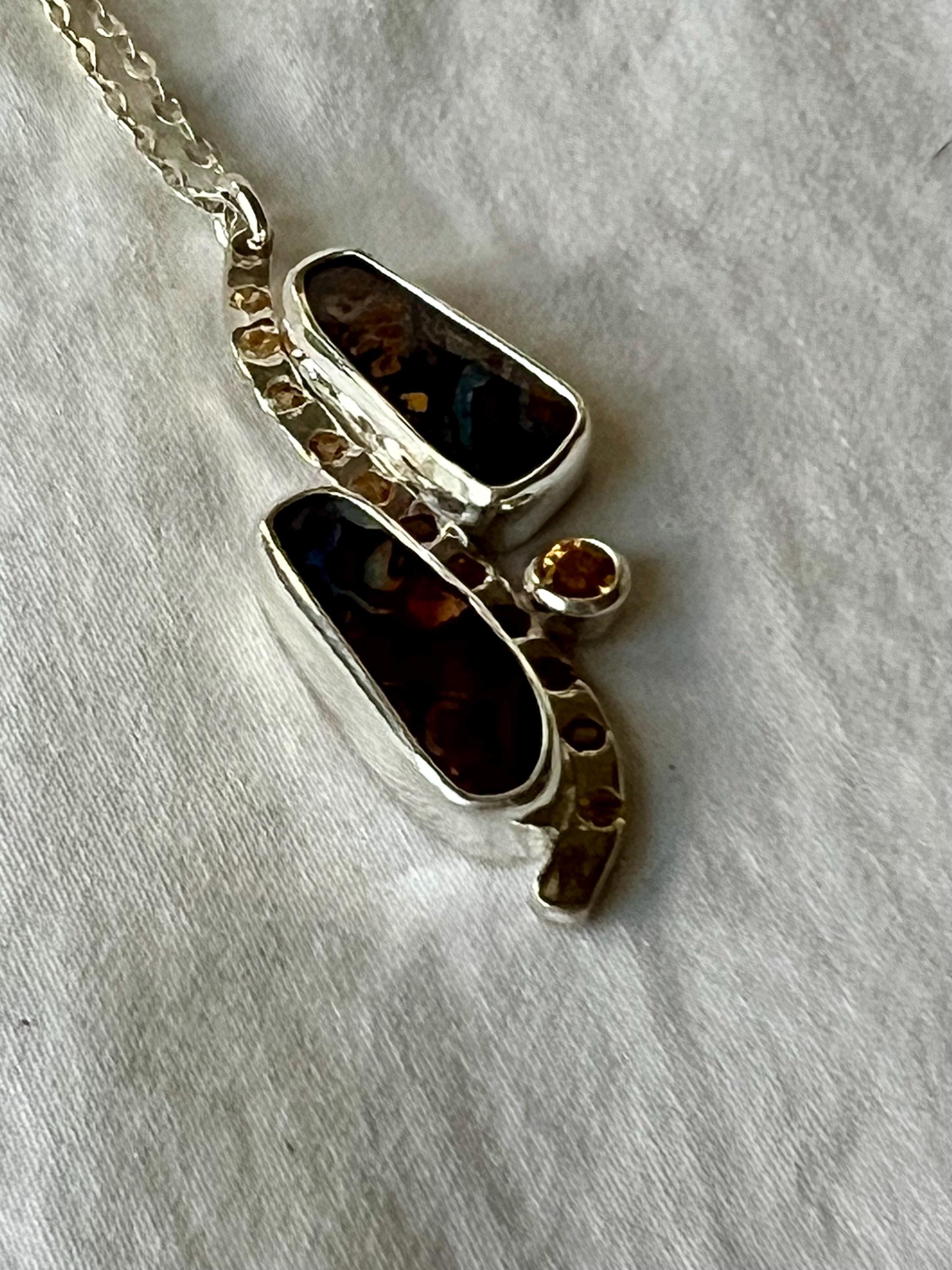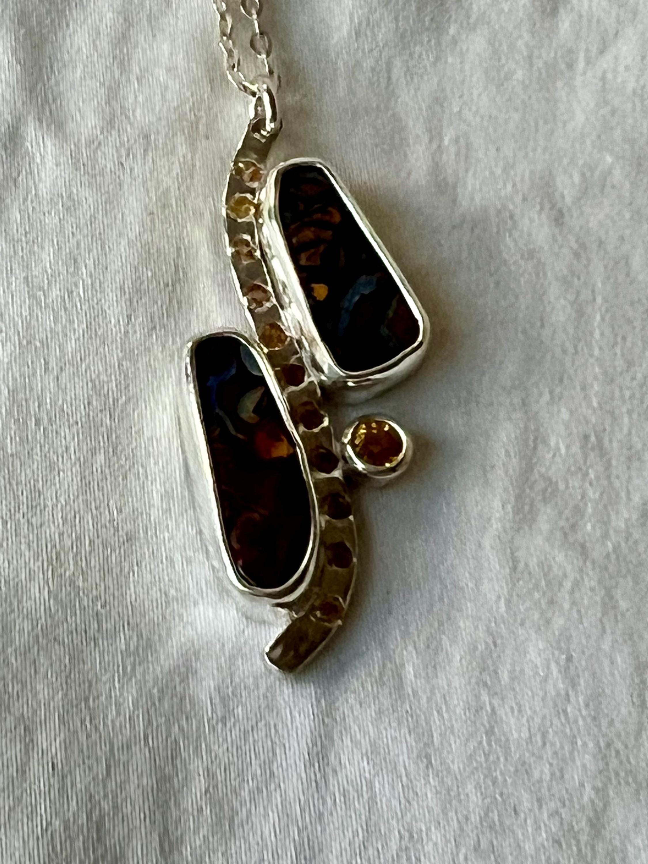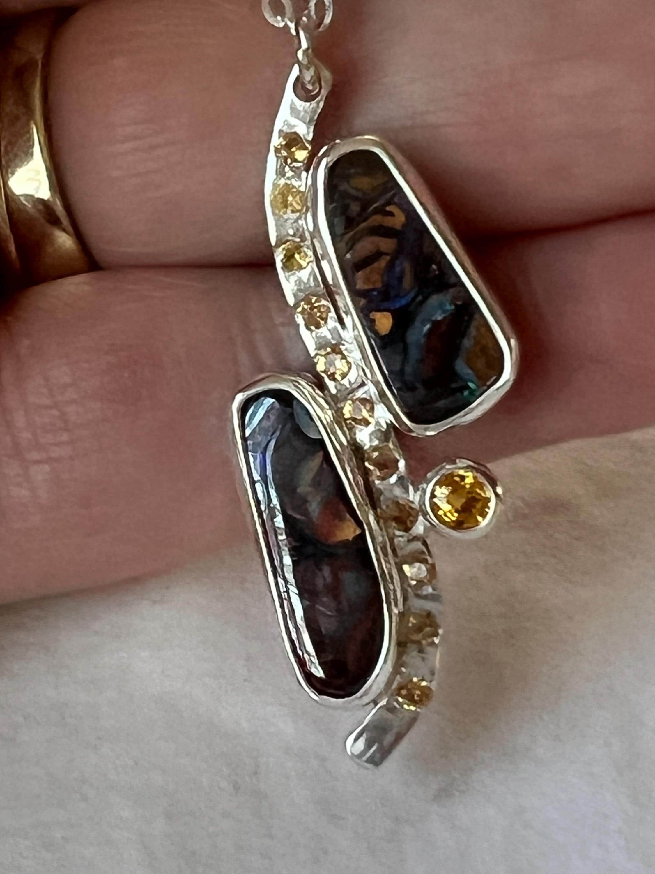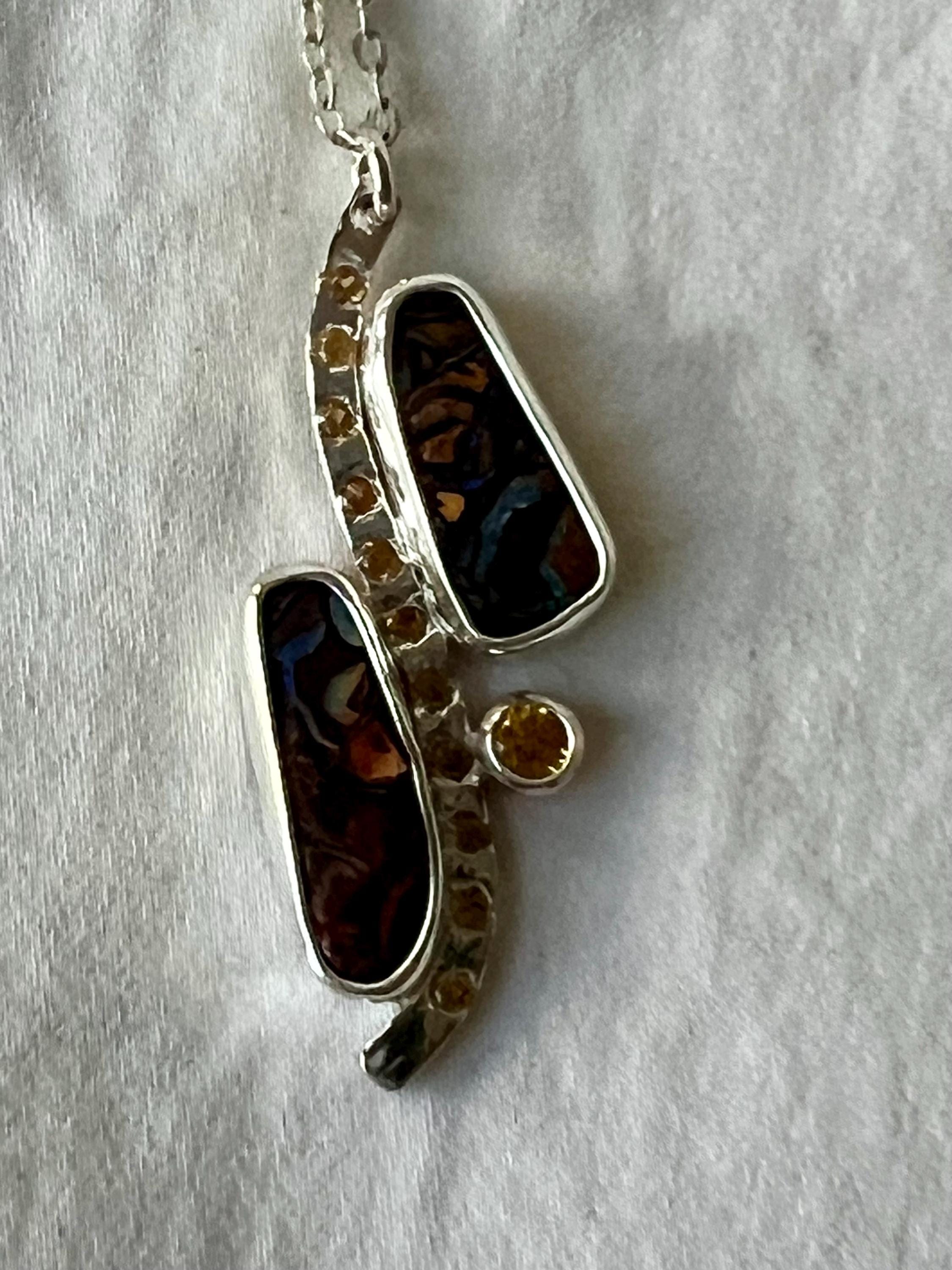 This is a unique pendant with two boulder opals set on either side of an “s” curve. The curve has 10 flush set yellow sapphires along it. A 4mm citrine is set beneath one of the opals. The opals are nicely patterned and colored with brown, blue and yellow/orange. All is set in sterling silver. The pendant measures approximately 1-3/4” high by 3/4” wide. A silver chain is included.