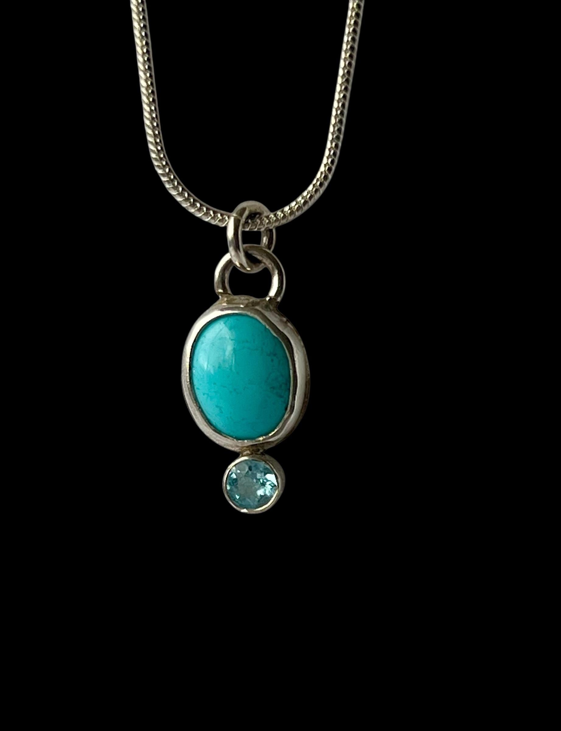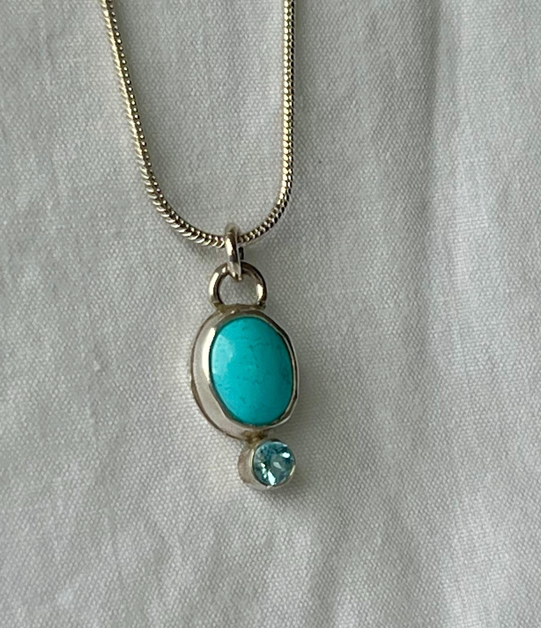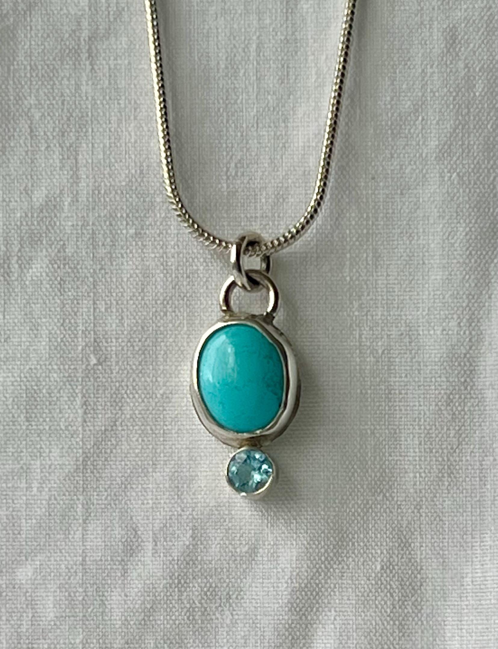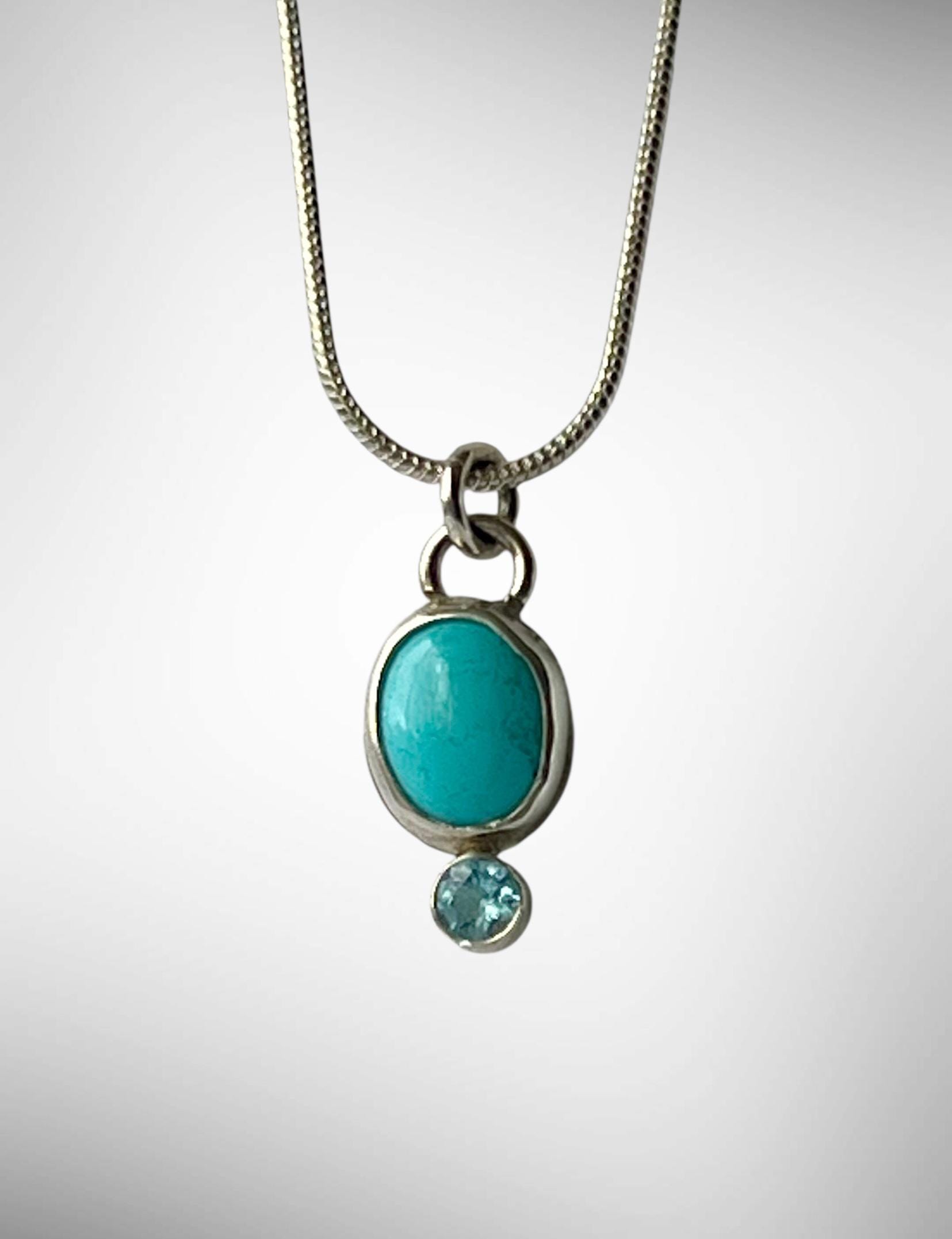 This small turquoise and topaz pendant is small and unassuming, but stunning! The turquoise is a Robbin’s egg blue (light blue). It measures approximately 10 x 8mm. The topaz is a 4mm faceted Swiss blue. Both are bezel set in sterling silver. A silver plated chain is included.