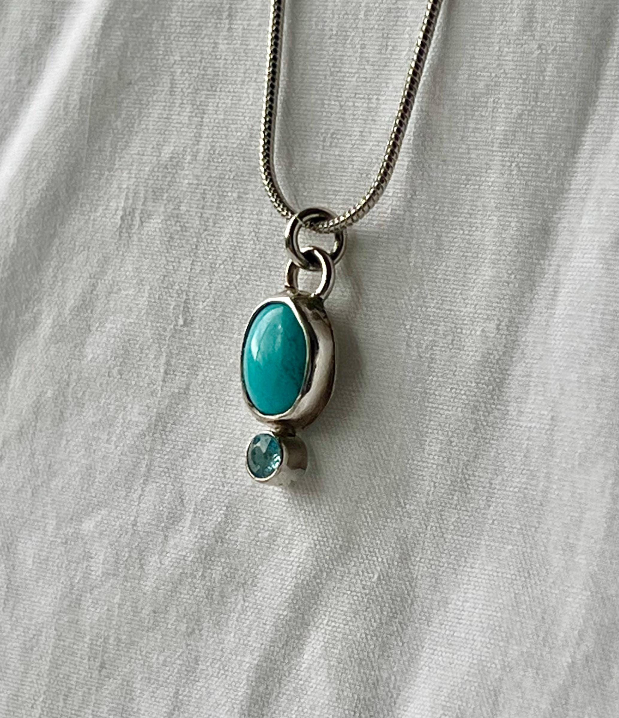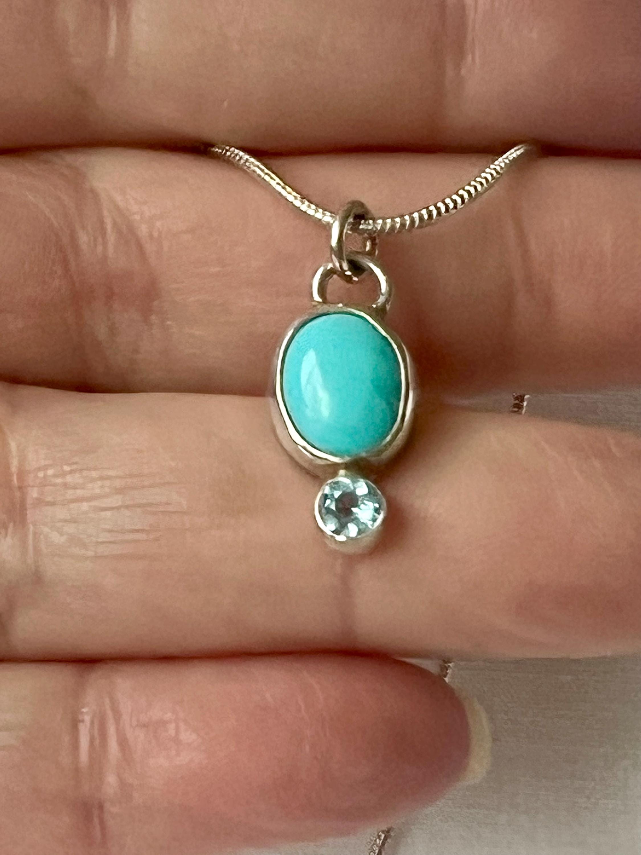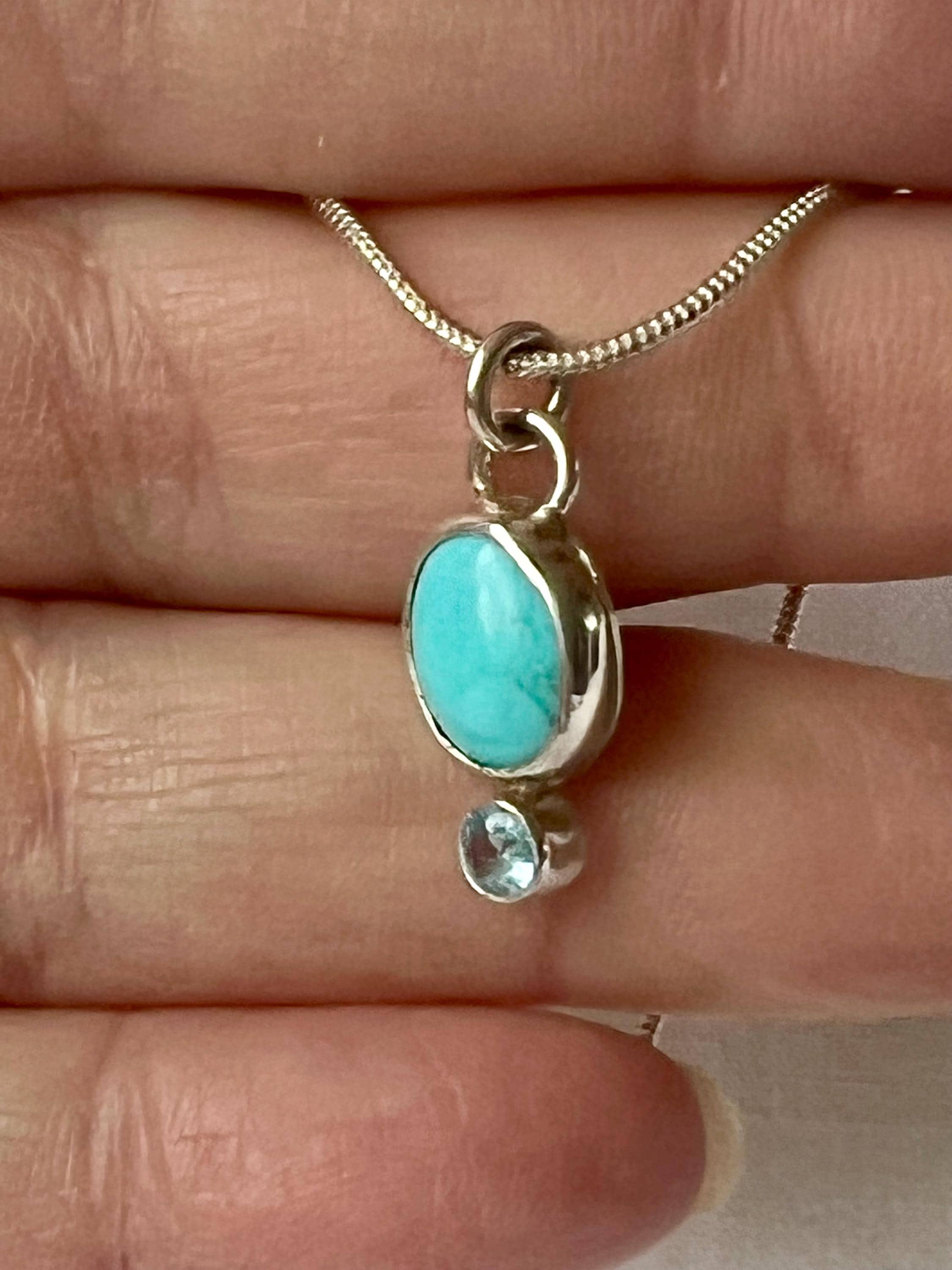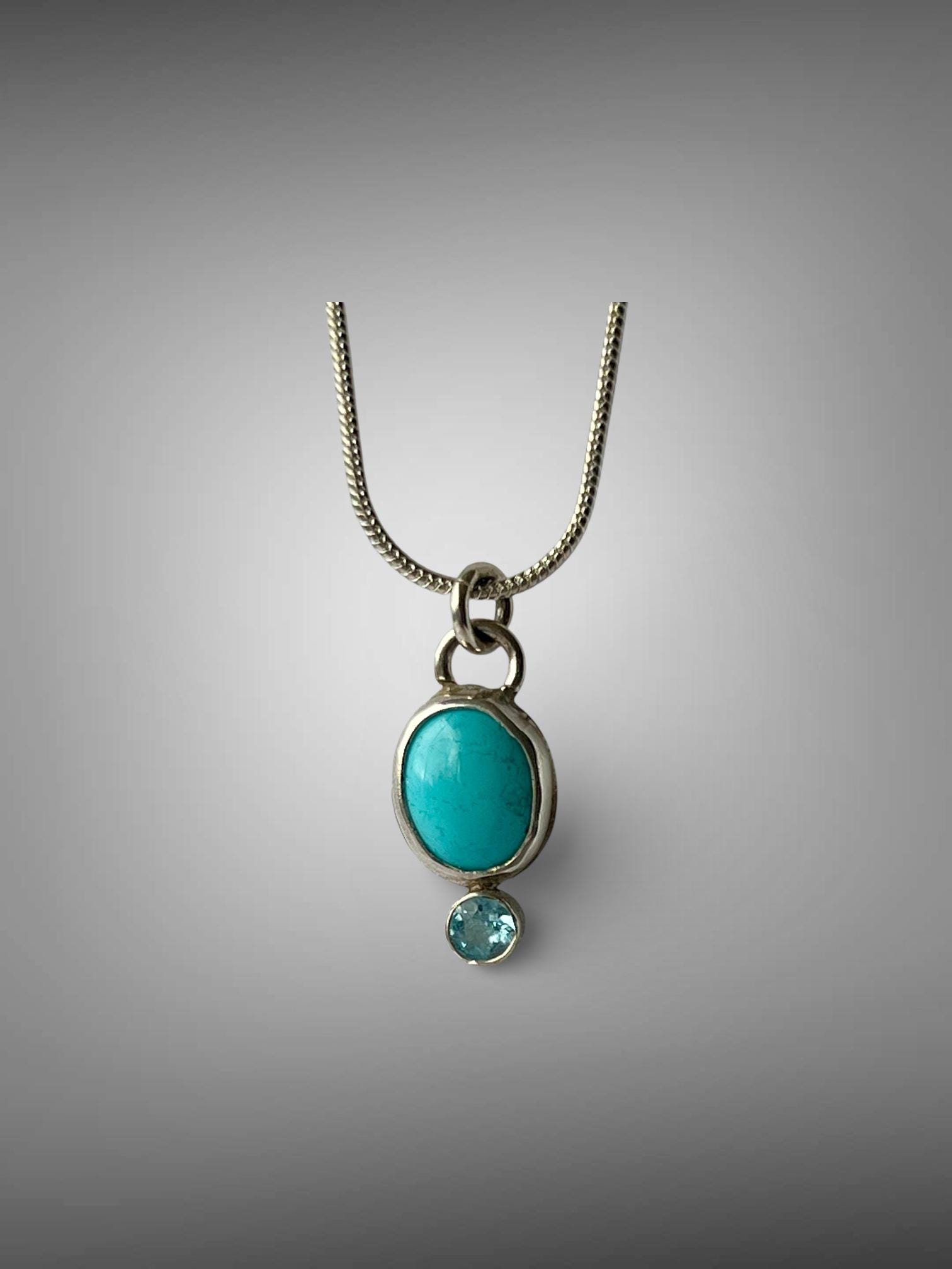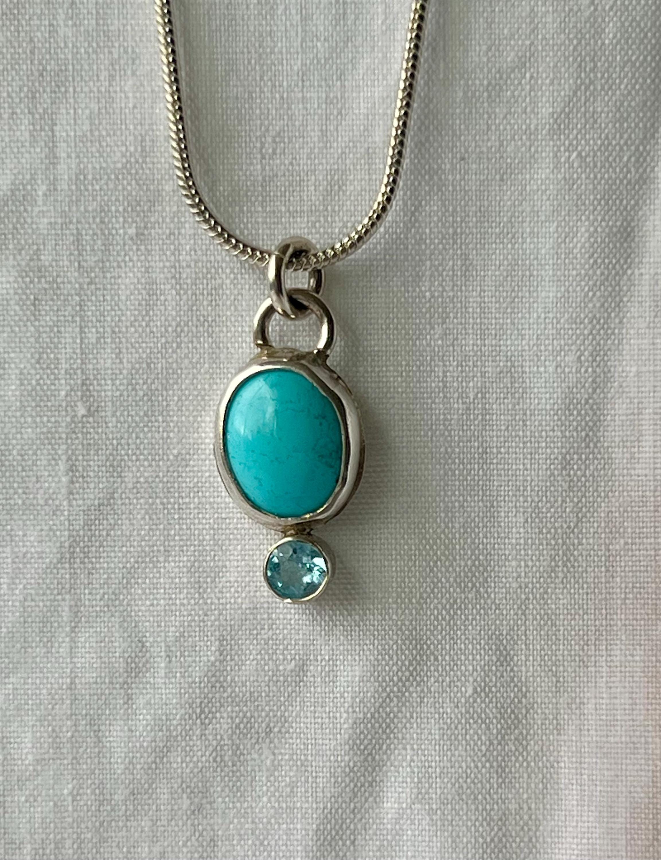 This small turquoise and topaz pendant is small and unassuming, but stunning! The turquoise is a Robbin’s egg blue (light blue). It measures approximately 10 x 8mm. The topaz is a 4mm faceted Swiss blue. Both are bezel set in sterling silver. A silver plated chain is included.
