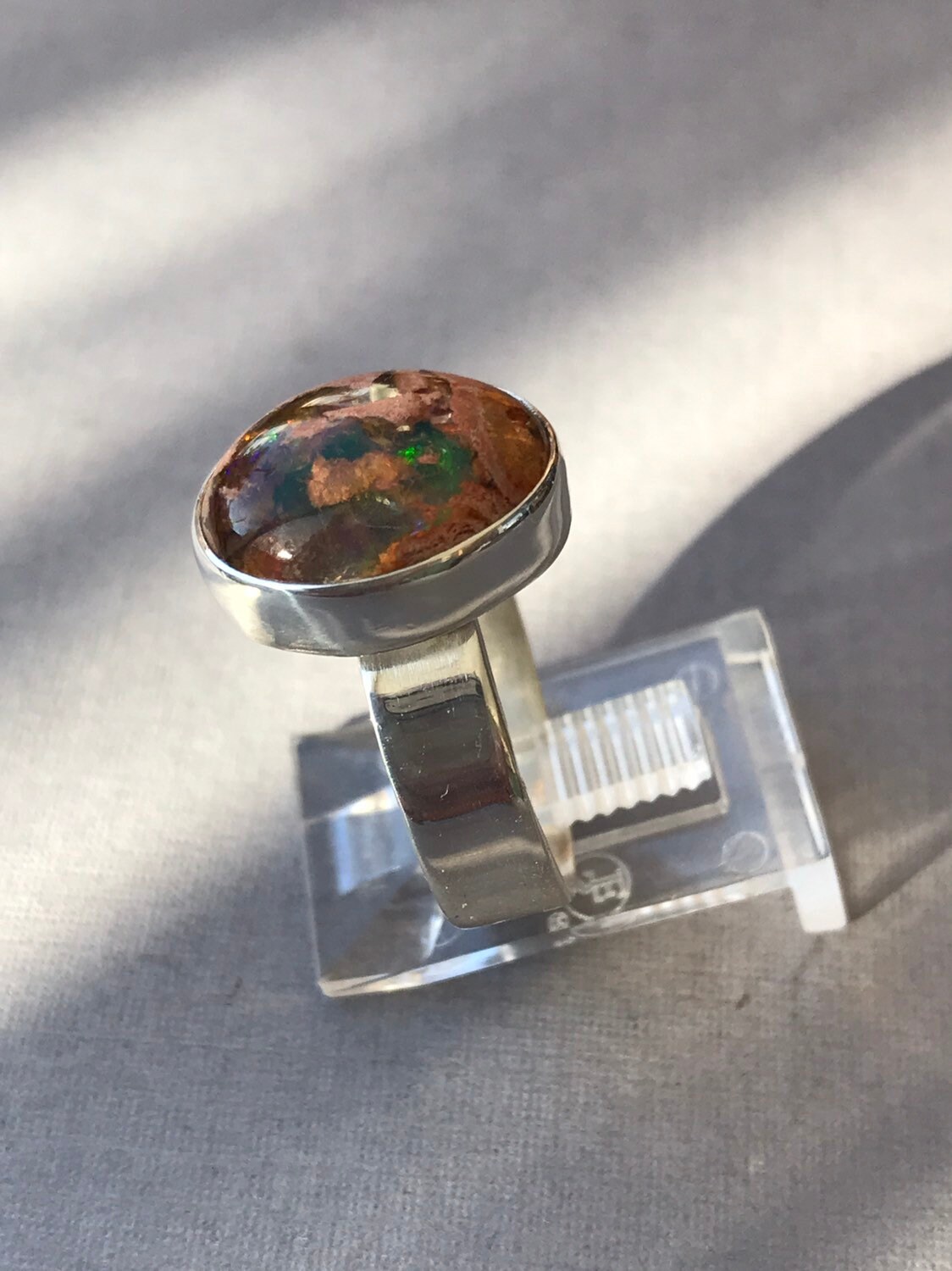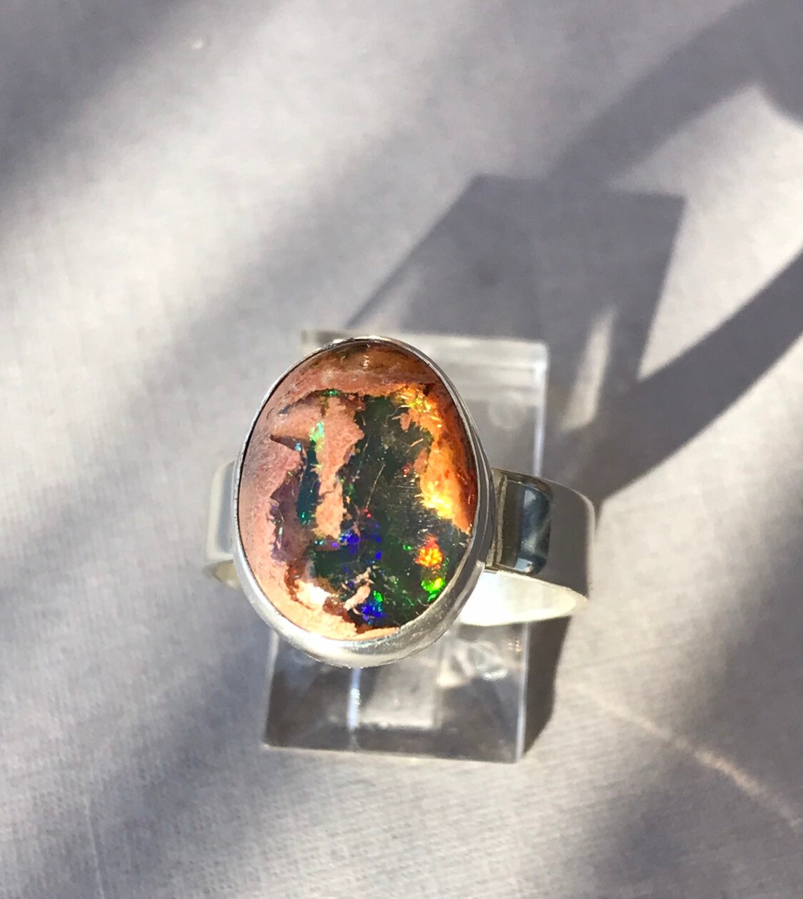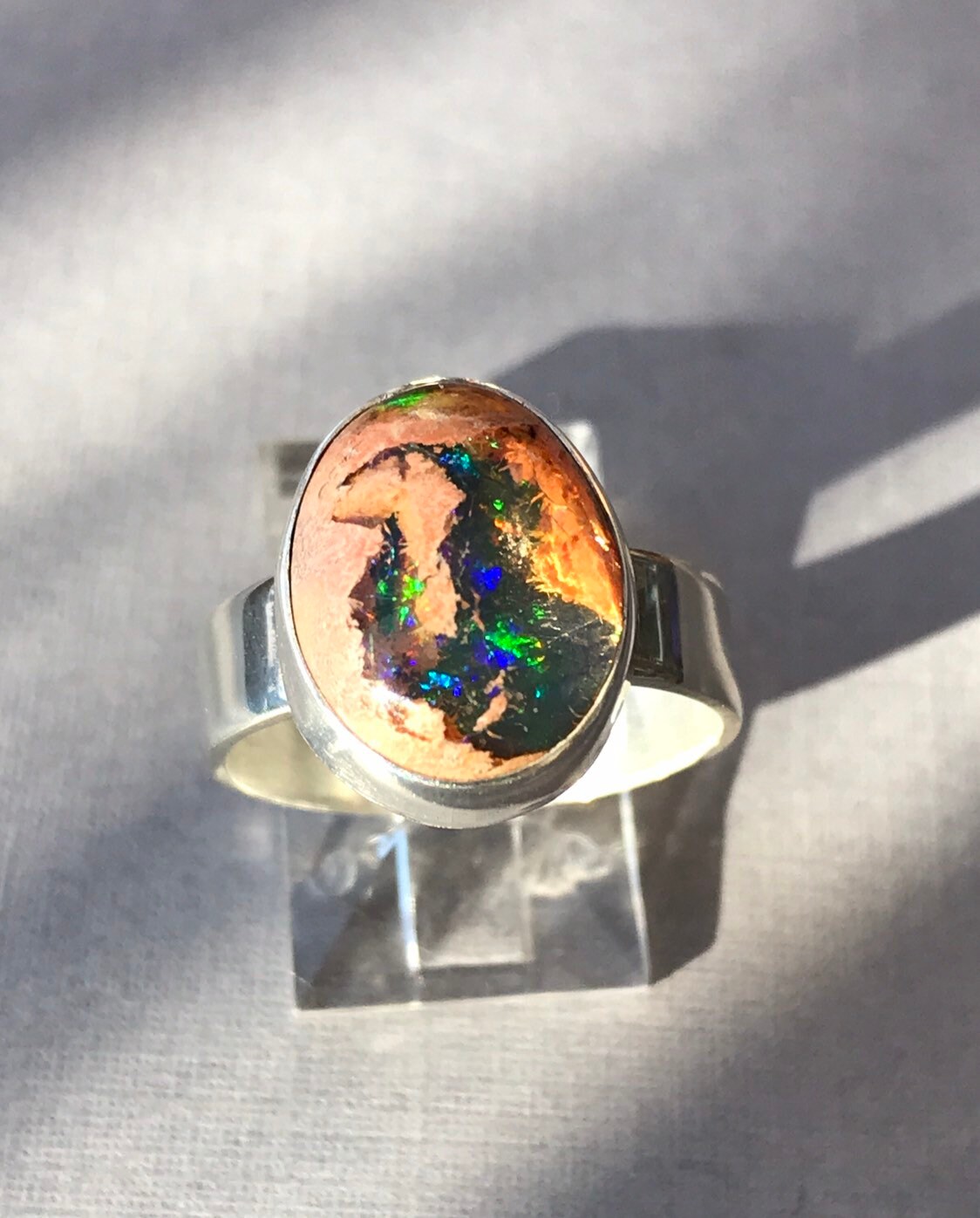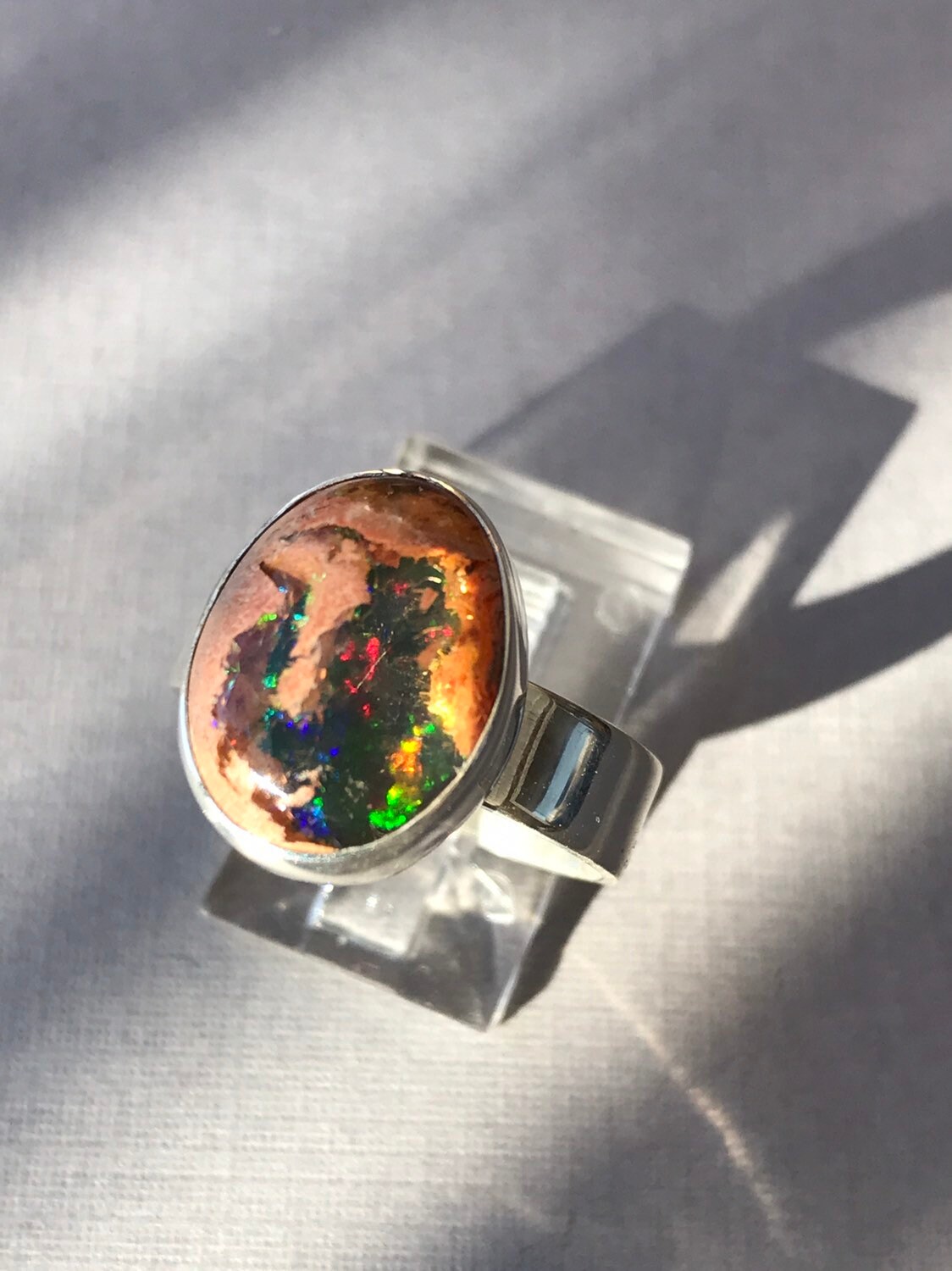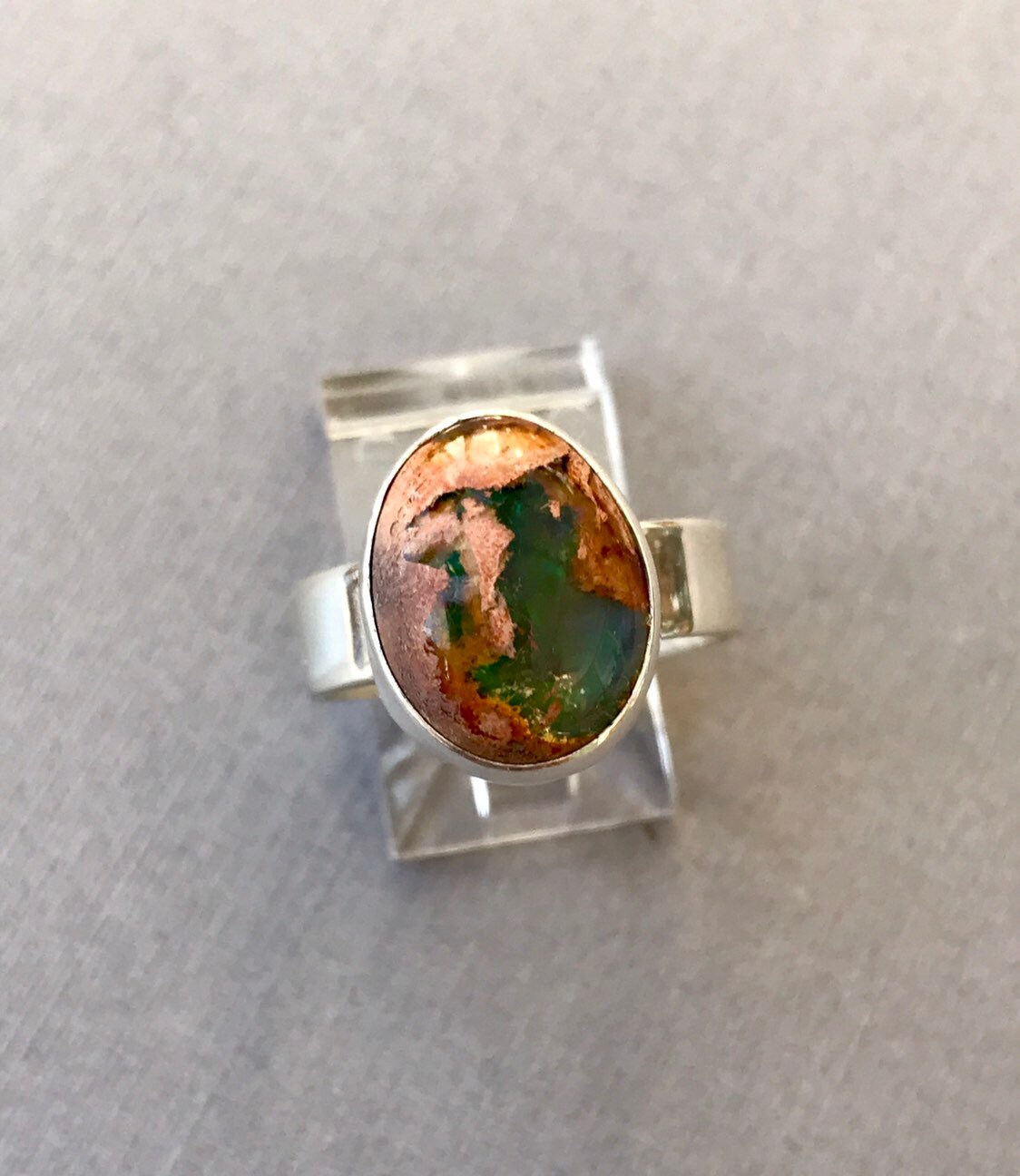 This fire opal has exquisite blue, green and a touch of red flash. Not to take away from the beauty of the stone I chose to do a simple bezel on a plain silver band. All sterling silver. Ring size 7-1/4. The stone measures approximately 15 x 12mm